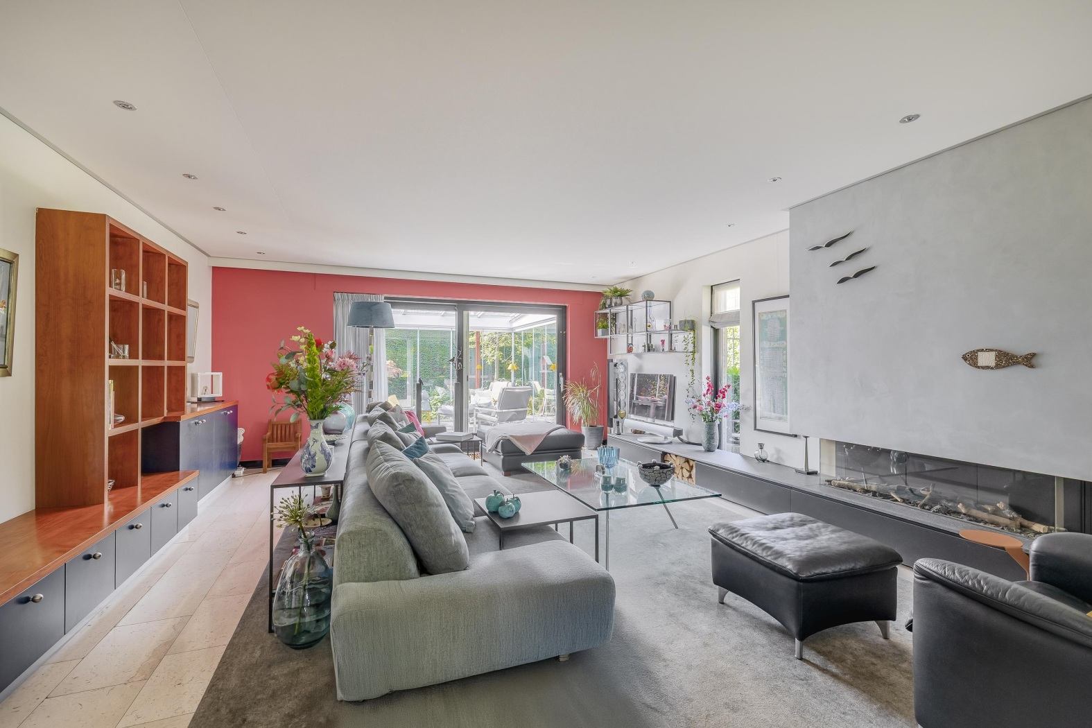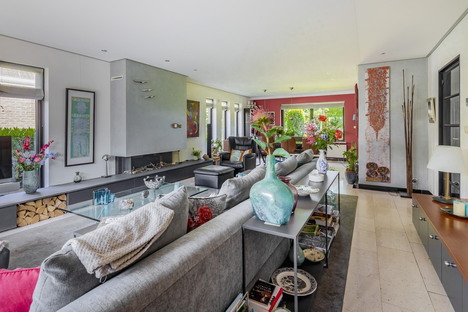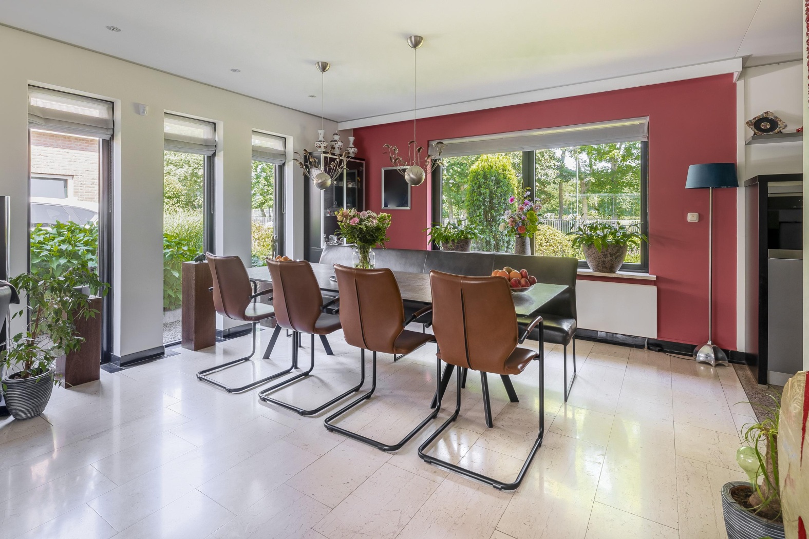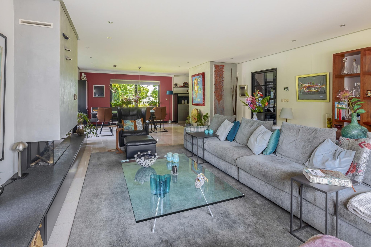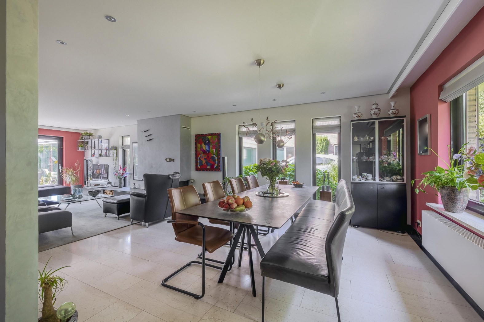 De woonkamer is stijlvol ingericht met een cinewall met haard en zwevende kastruimte, en loopt naadloos over in de eetkamer. Hier zorgen vier hoge ramen tot aan de vloer in de zijgevel voor een prachtig lichtspel. De eetkamer ligt bovendien aangenaam dicht bij de keuken, wat het een fijne plek maakt voor lange diners en samenzijn. De vloer is afgewerkt met lichte marmeren tegels en voorzien van comfortabele vloerverwarming, wat zorgt voor een stijlvolle en aangename leefomgeving.