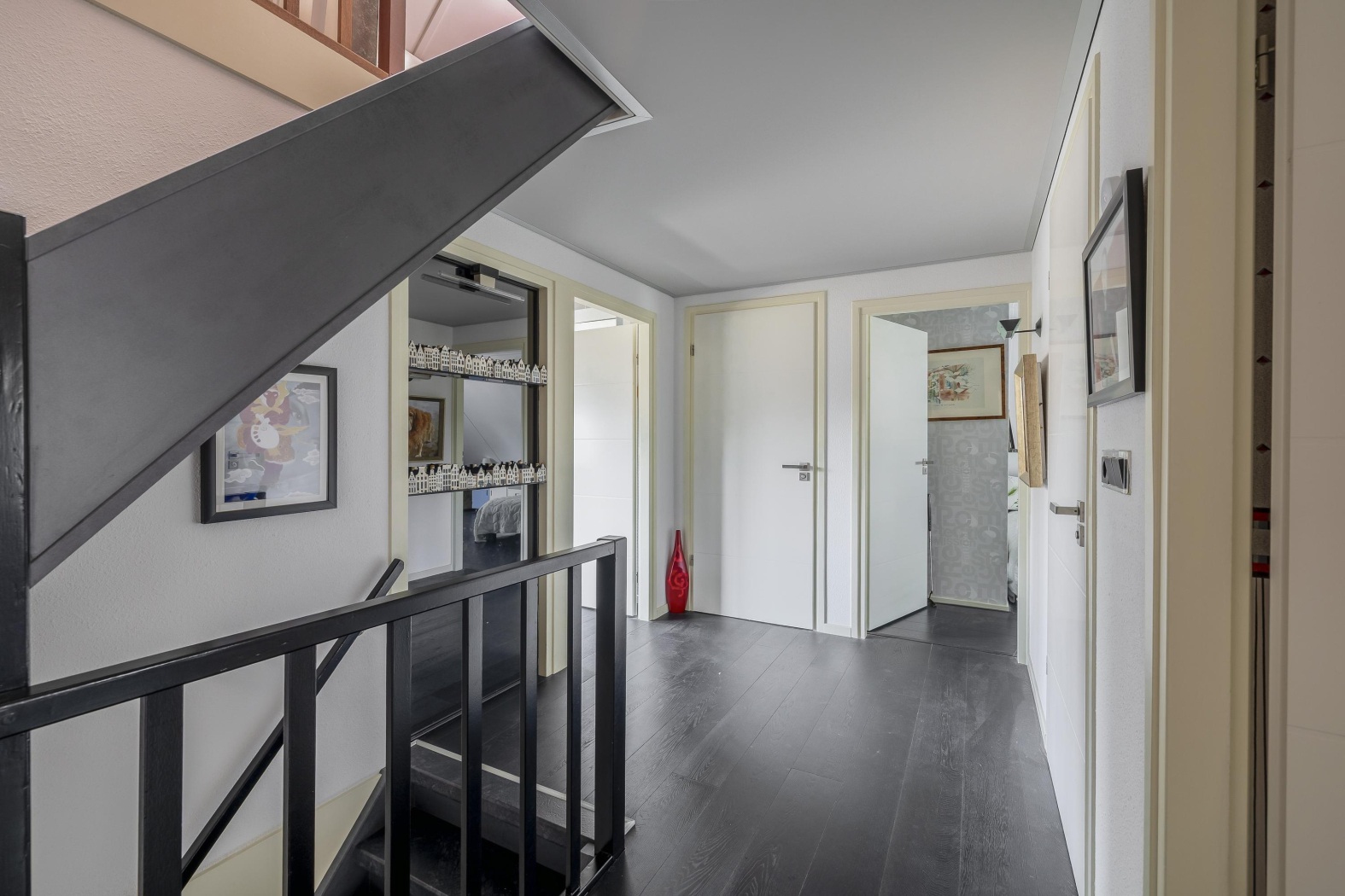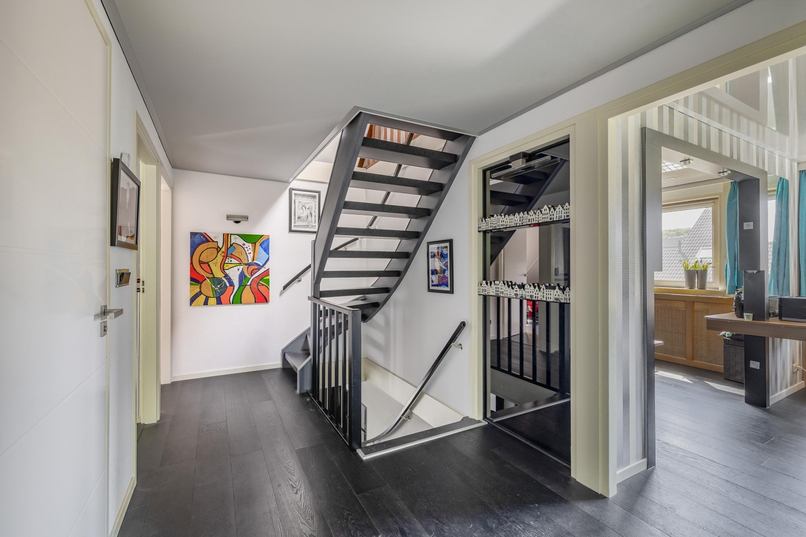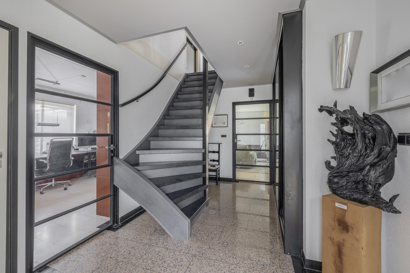 Vanuit de hal openen twee stijlvolle stalen taatsdeuren: één geeft toegang tot de ruime en lichte woonkamer, de andere leidt naar het kantoor op de begane grond. Ook is vanuit de hal de praktische inpandige garage binnendoor bereikbaar – comfortabel en ideaal voor dagelijks gebruik. Een strakke afwerking van de trapopgang (Upstairs) in combinatie met sfeervolle verlichting creëert een luxe entree naar de bovenverdieping.