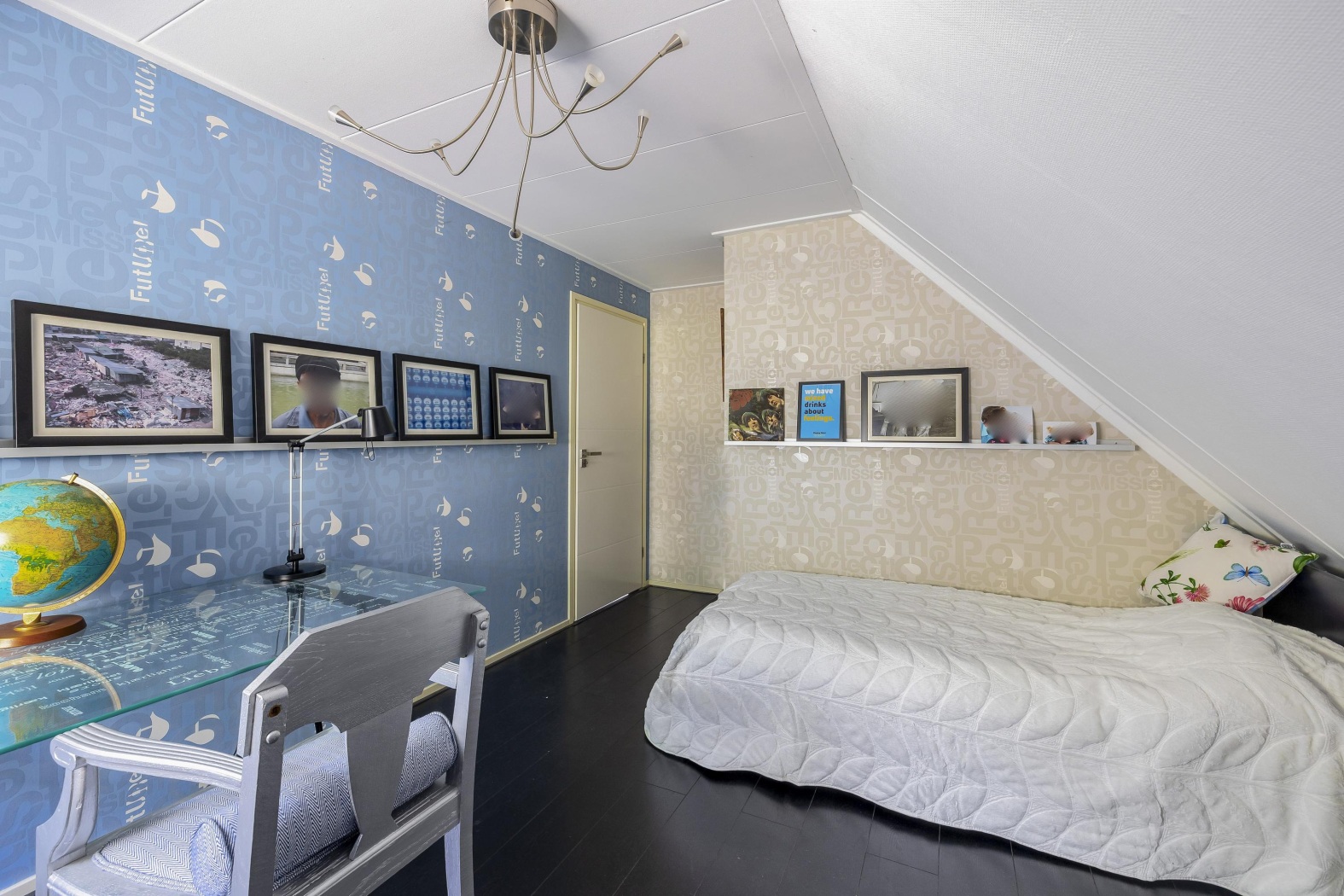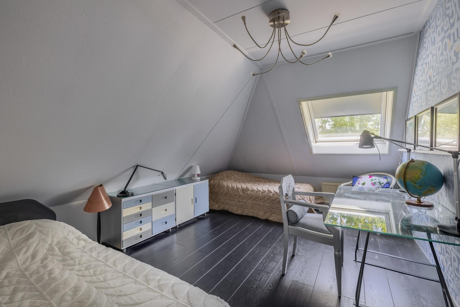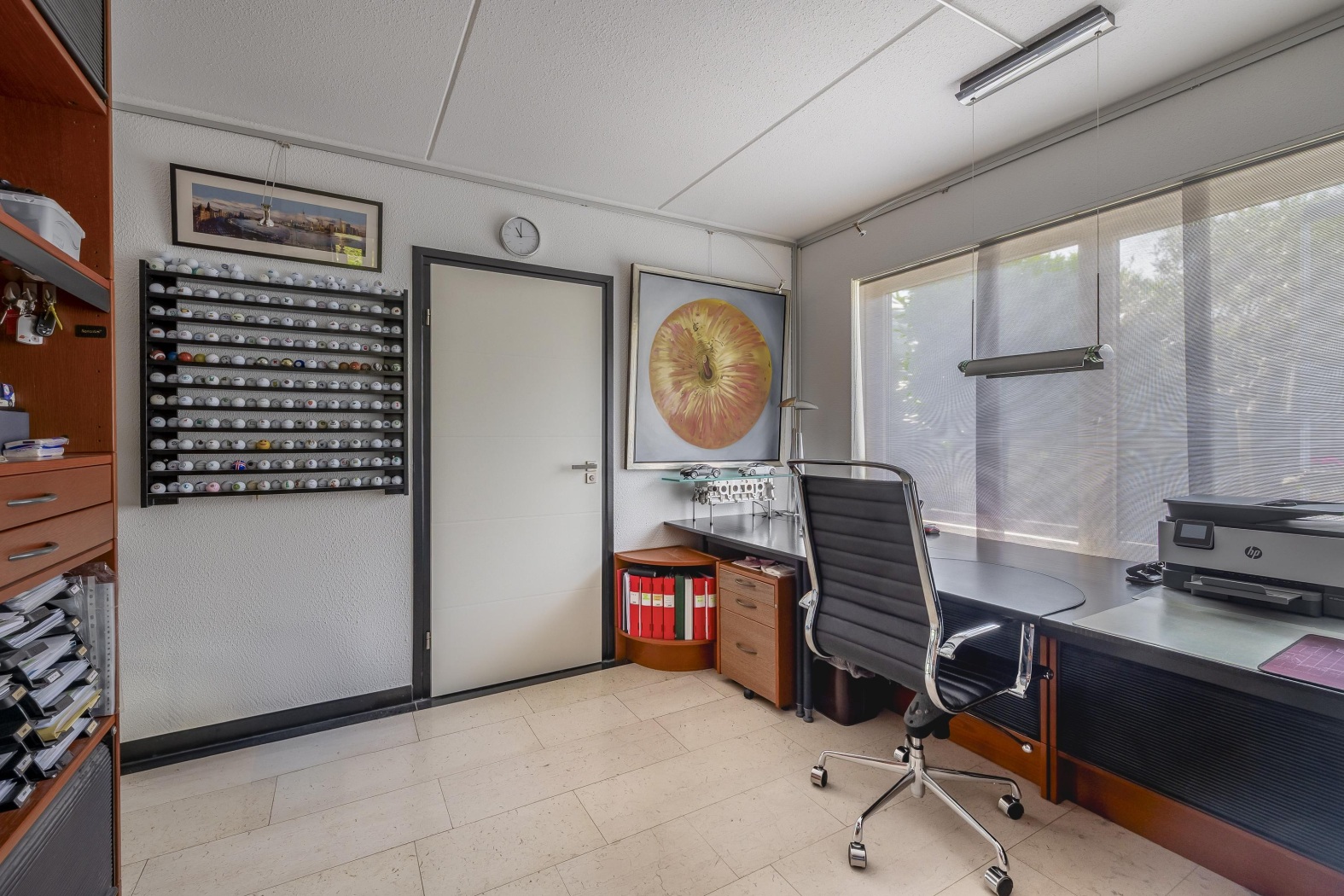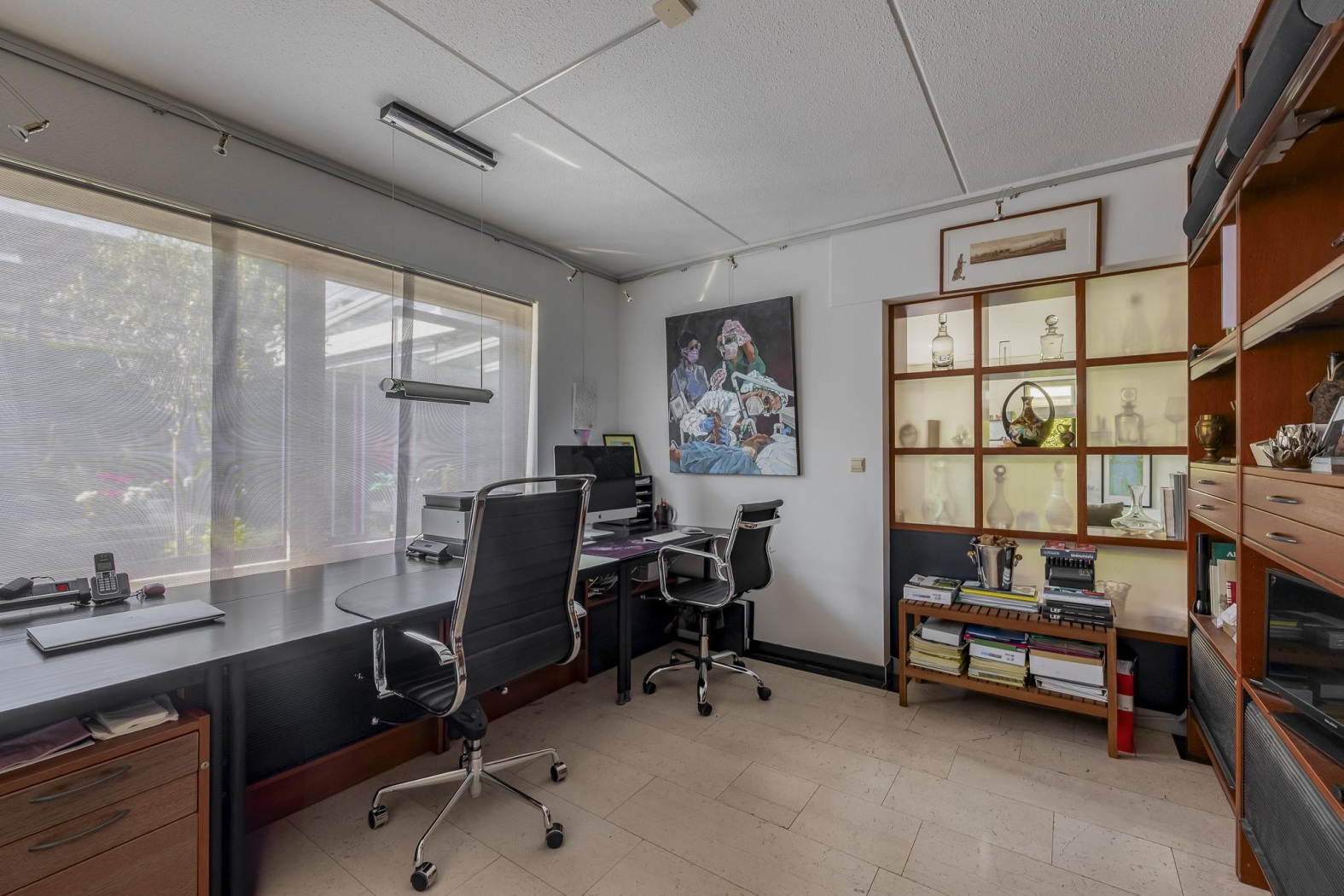 Deze lichte en inspirerende ruimte doet momenteel dienst als stijlvol thuiskantoor, met een groot raam dat uitzicht biedt op de groene tuin. Dankzij de ligging op de begane grond en de directe toegang tot een aangrenzende eerste badkamer (ca. 3 m²) met regendouche en wastafelmeubel, is deze kamer ook uitermate geschikt als comfortabele slaapkamer. Een ideale oplossing voor levensloopbestendig wonen of voor gasten die extra privacy wensen.