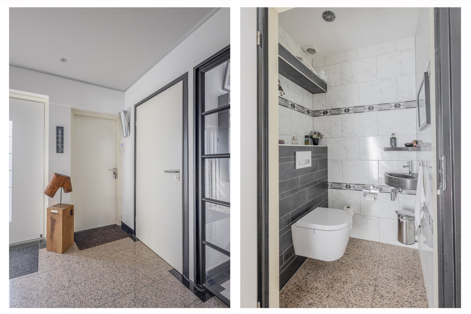 Via de zijkant van de woning betreden we het huis door een goed beveiligde, opvallende rode stalen deur. De verzorgde, strak afgewerkte hal straalt rust en functionaliteit uit en biedt ruimte voor een garderobe, de meterkast, een moderne toiletruimte, bijkeuken en de trap naar de verdieping.