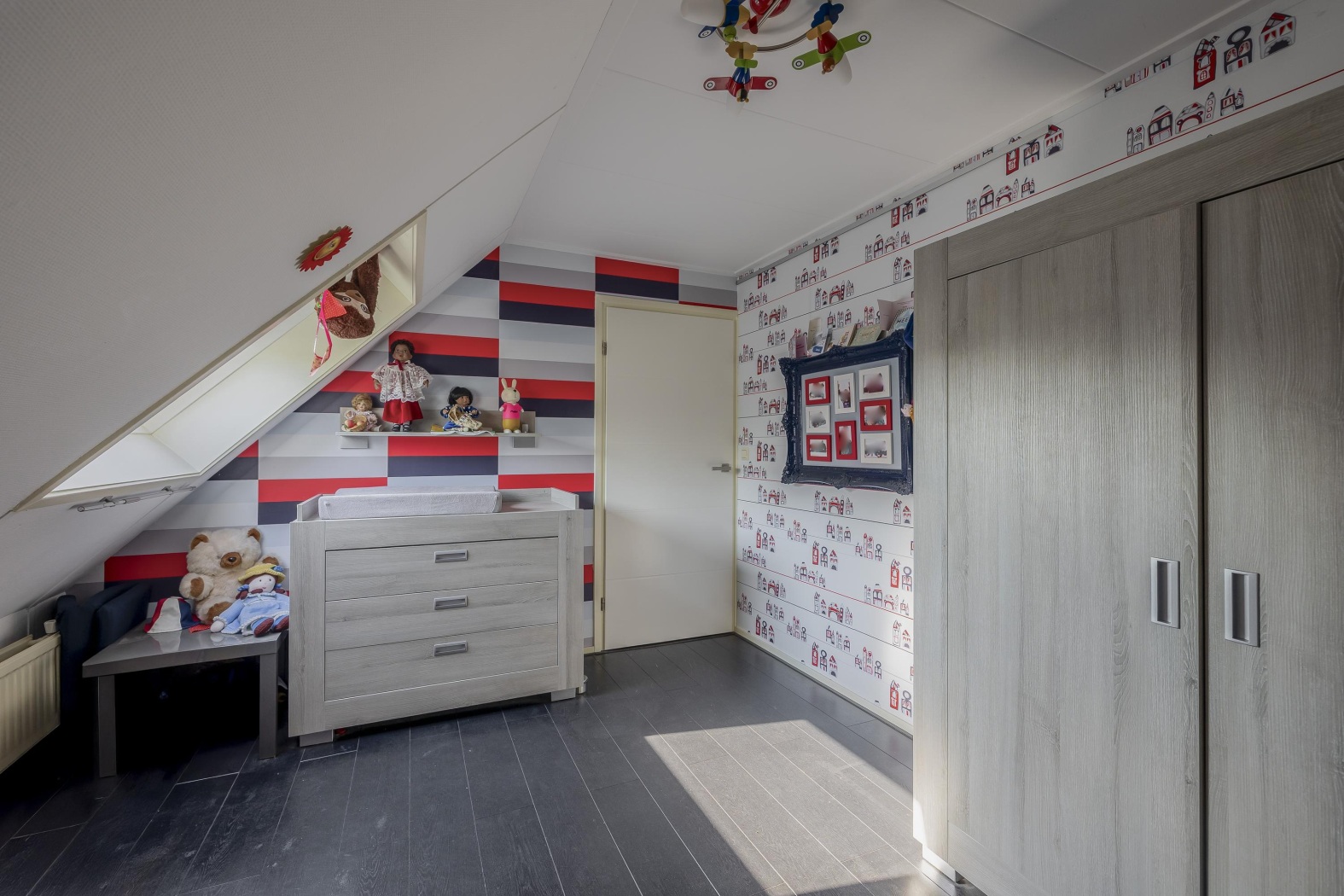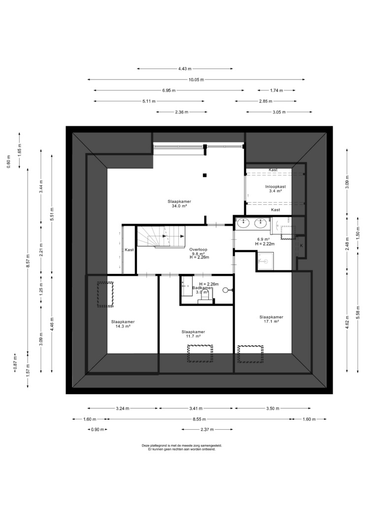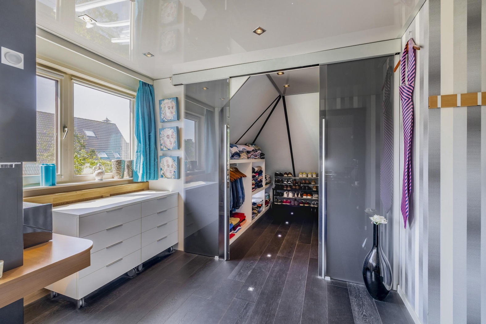 Op de eerste verdieping bevinden zich vier sfeervolle slaapkamers, elk met een eigen karakter en aangename lichtinval. De masterbedroom aan de achterzijde is bijzonder royaal en krijgt extra ruimtelijkheid door een brede dakkapel. Deze kamer is slim en stijlvol ingericht met een walk-in-closet, perfect voor haar garderobe, én aan de andere zijde een ruime schuifwandkast – ideaal als extra kastruimte voor hem. Hier komen comfort en elegantie moeiteloos samen. De overige drie slaapkamers zijn uitgerust met kunststof Velux dakramen, wat zorgt voor veel natuurlijk licht. Eén van de kamers beschikt bovendien over een handige vaste kastenwand.