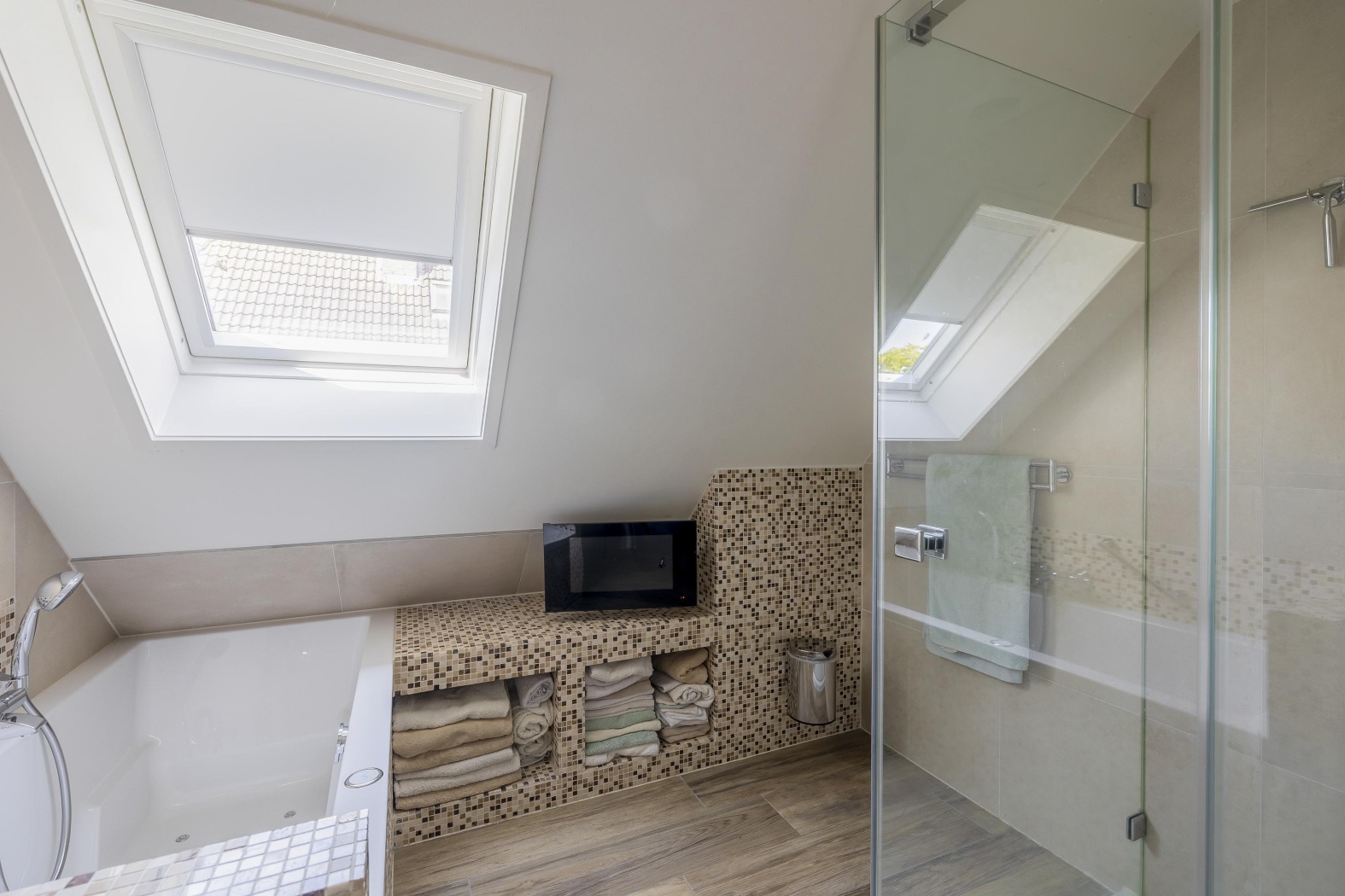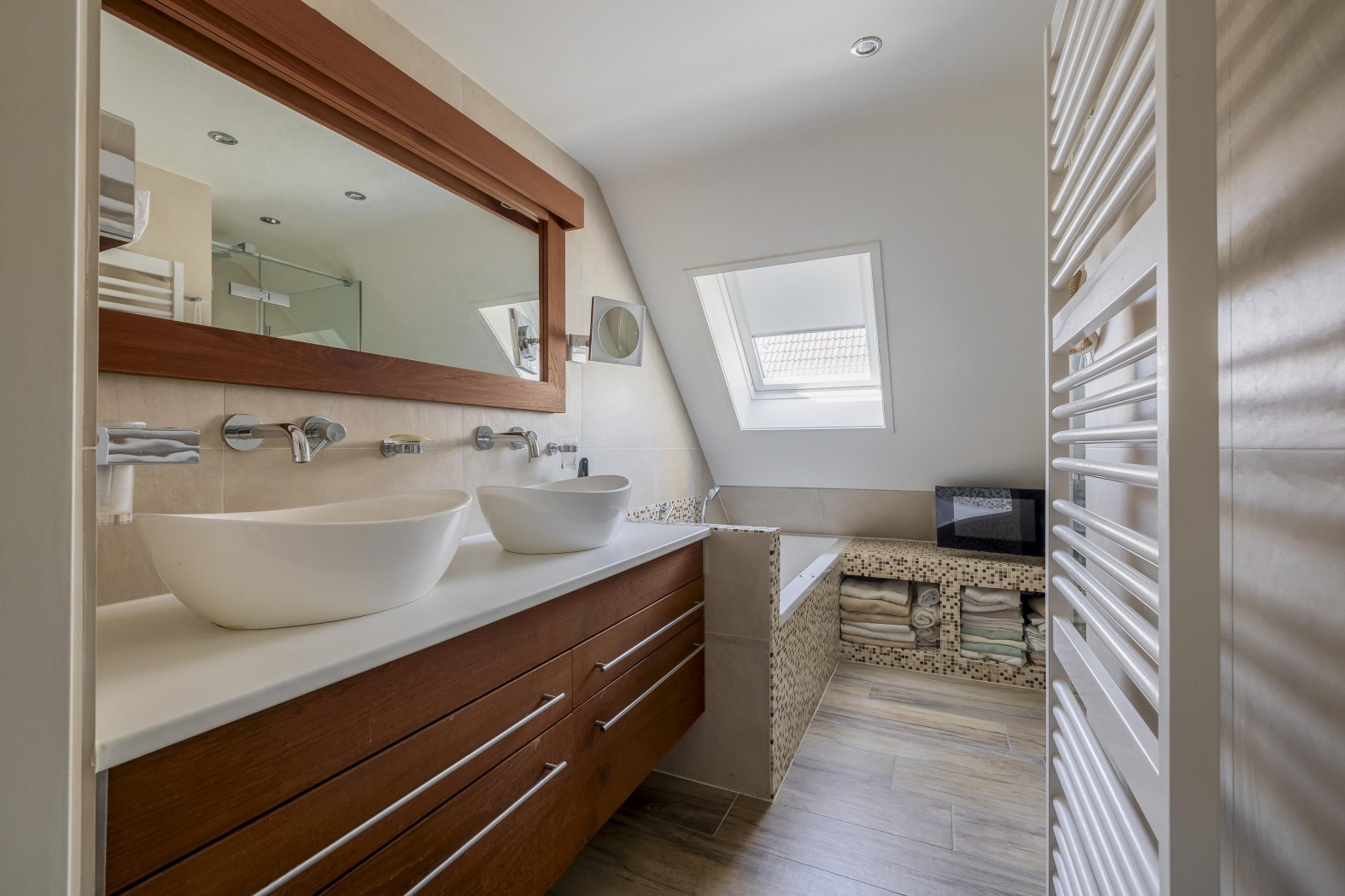 Deze ruime badkamer grenst direct aan de masterbedroom en ademt luxe. De ruimte is ingericht met een dubbel wastafelmeubel met moderne waskommen, muurkraan, een glazen douchecabine, een heerlijk ligbad en een designradiator. Onder het schuine dak is slimme bergruimte gecreëerd voor handdoeken en verzorgingsproducten. Een dakraam zorgt voor daglicht en natuurlijke ventilatie.