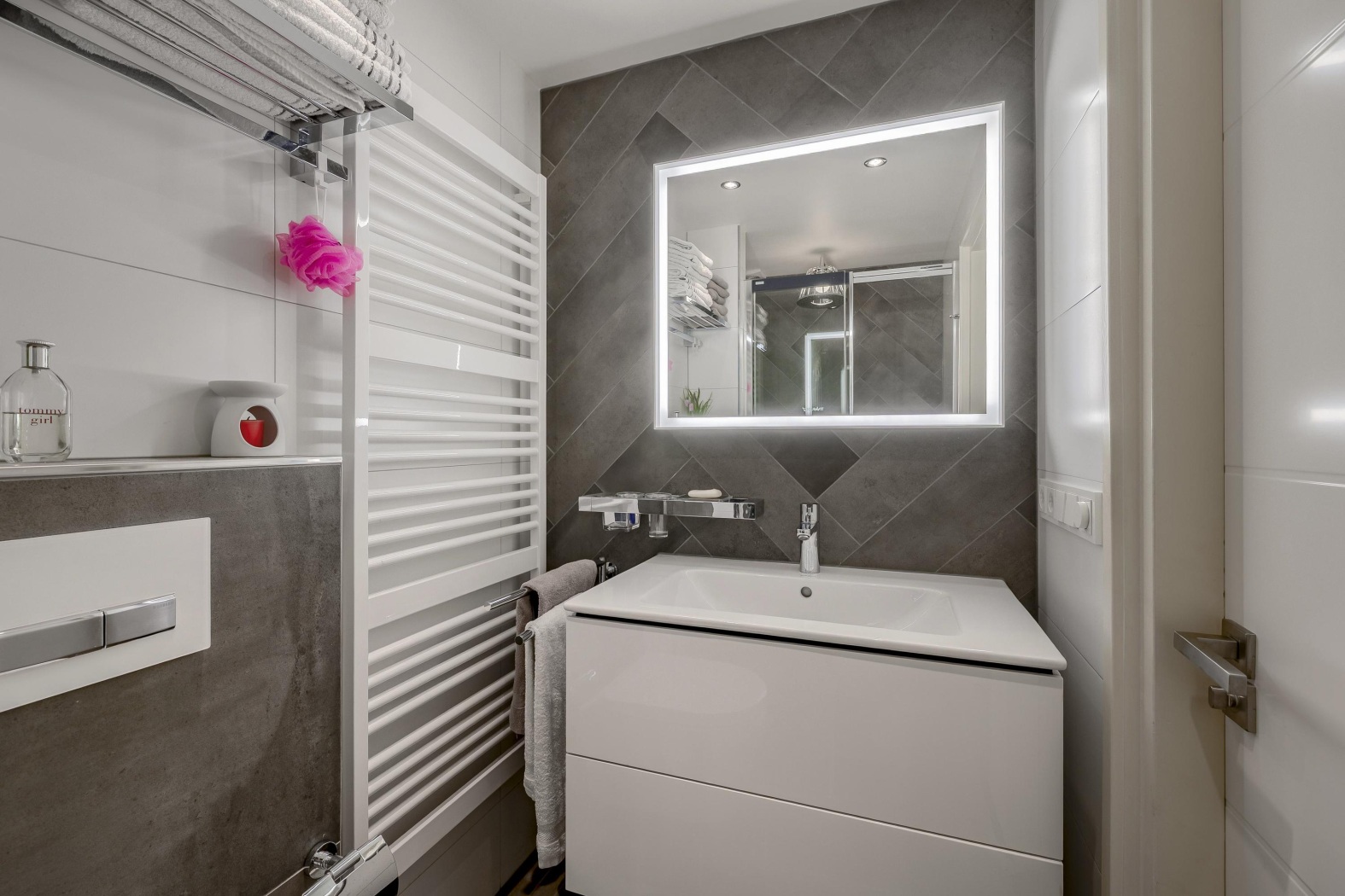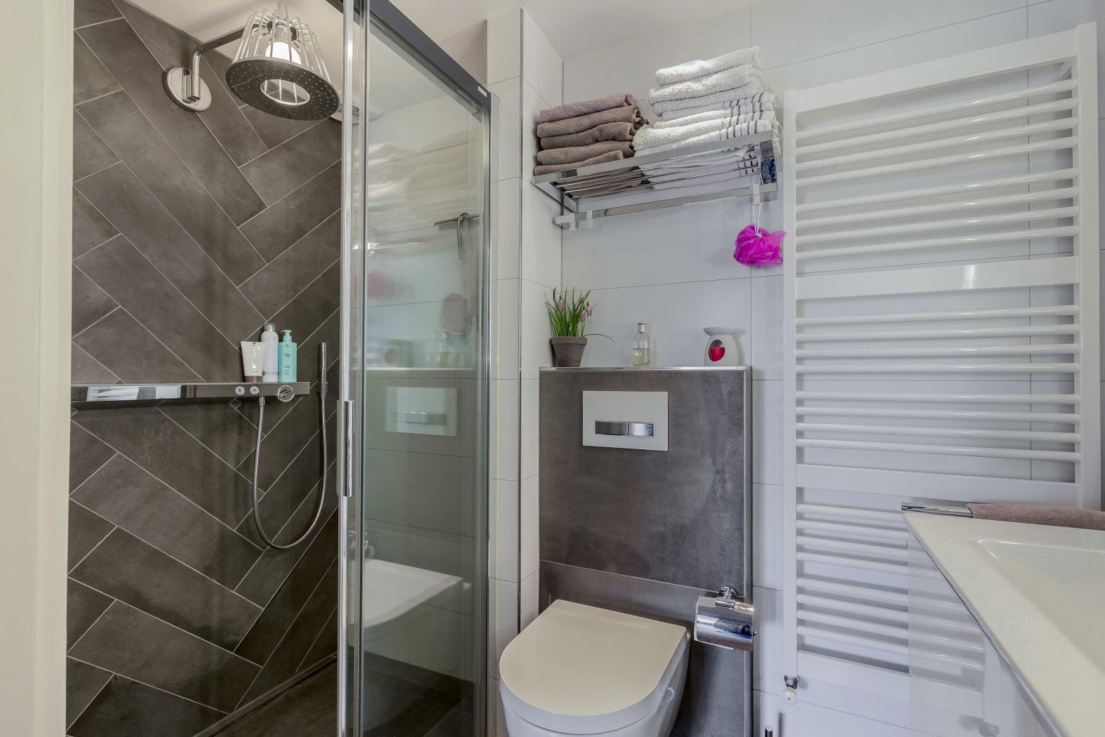 Strak vormgegeven, modern en efficiënt ingedeeld. Deze tweede badkamer is uitgerust met een inloopdouche voorzien van de luxe Axor lampdouche en handdouche van ontwerper Philippe Starck, een zwevend toilet, een stijlvol wastafelmeubel met verlichte spiegel en een designradiator. Een perfecte mix van comfort en eigentijdse elegantie.