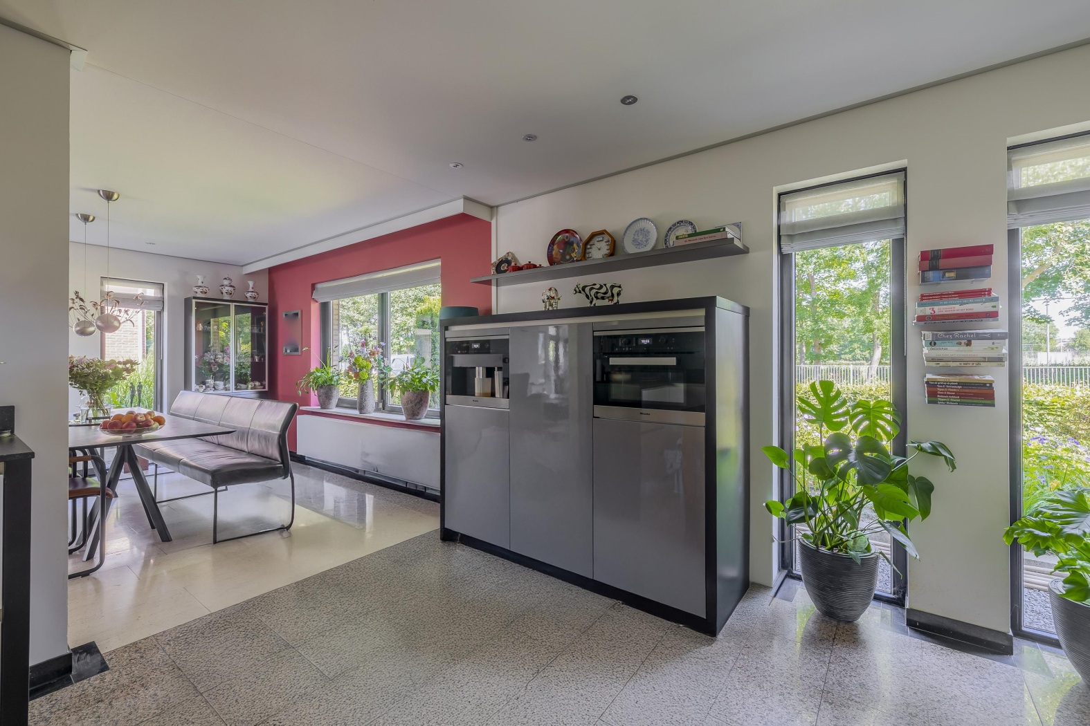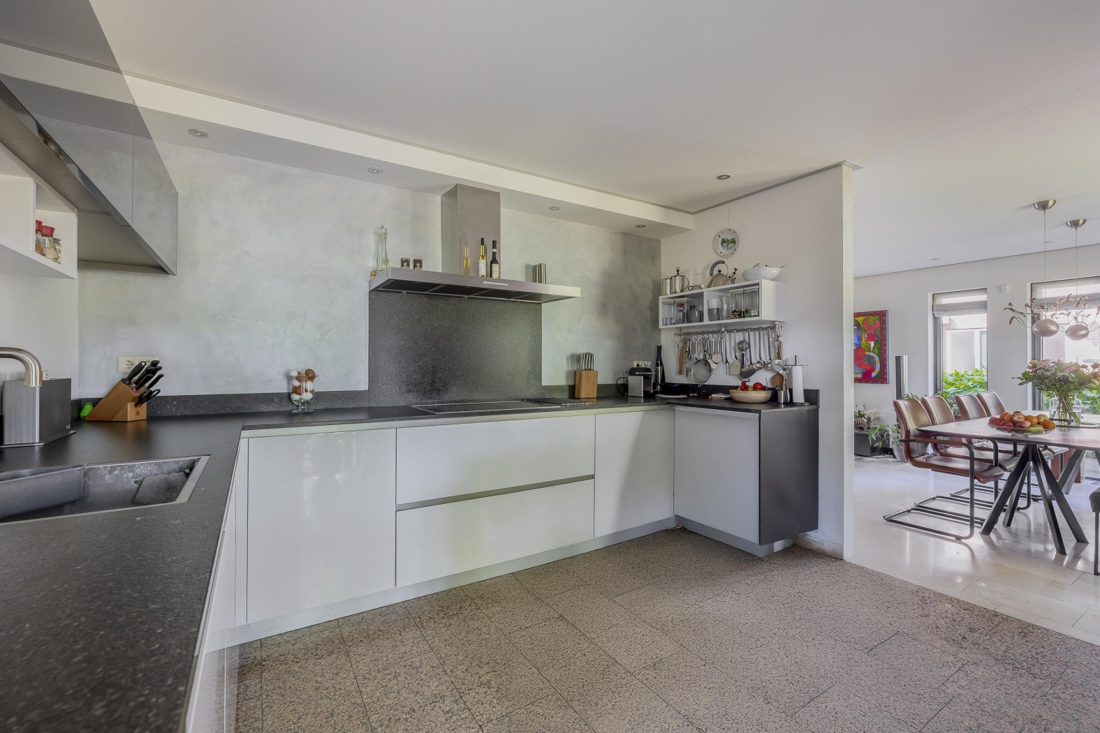 De open keuken grenst direct aan het eetgedeelte en is ingericht in een strakke L-vorm met greeploze fronten. Een hoge kastenwand herbergt onder andere een ingebouwde koffiemachine en combi-oven. Centraal in de ruimte staat een robuust hakblok – zowel praktisch als stijlvol. Verder is de keuken voorzien van alle wenselijke inbouwapparatuur, zoals een inductiekookplaat, roestvrijstalen afzuigkap, vaatwasser én een Quooker-kraan voor direct kokend water.