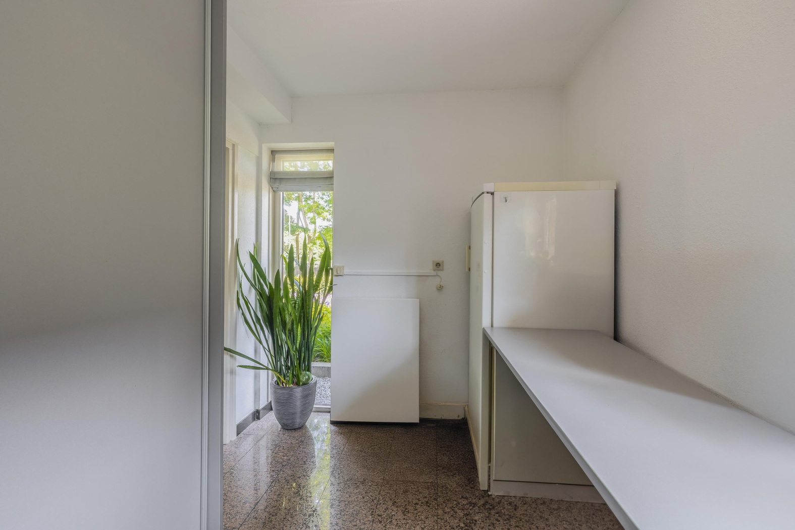 Grenzend aan de keuken bevindt zich de praktische bijkeuken. Hier is plaats voor een vriezer, een werkblad, een schuifwandkast voor extra opbergruimte, en een lichtraam dat zorgt voor natuurlijk daglicht. Via een deur is bovendien de hal direct bereikbaar – handig én efficiënt.