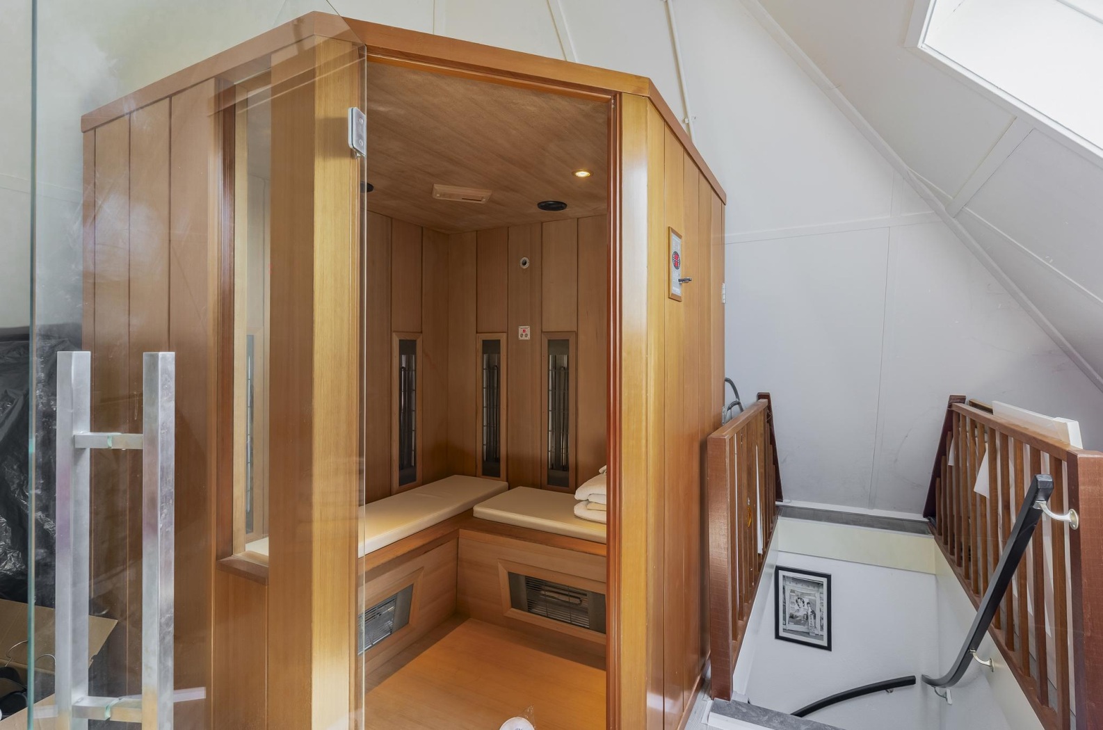 De zolder is momenteel ingericht als een luxe wellnessruimte, met als absolute blikvanger een comfortabele infrarood sauna voor drie personen. Deze royale hoek cabine is uitgerust met hoogwaardige stralers die op therapeutische wijze verlichting bieden bij spier- en gewrichtsklachten. Een ideale plek om te ontspannen, tot rust te komen en even helemaal op te laden.