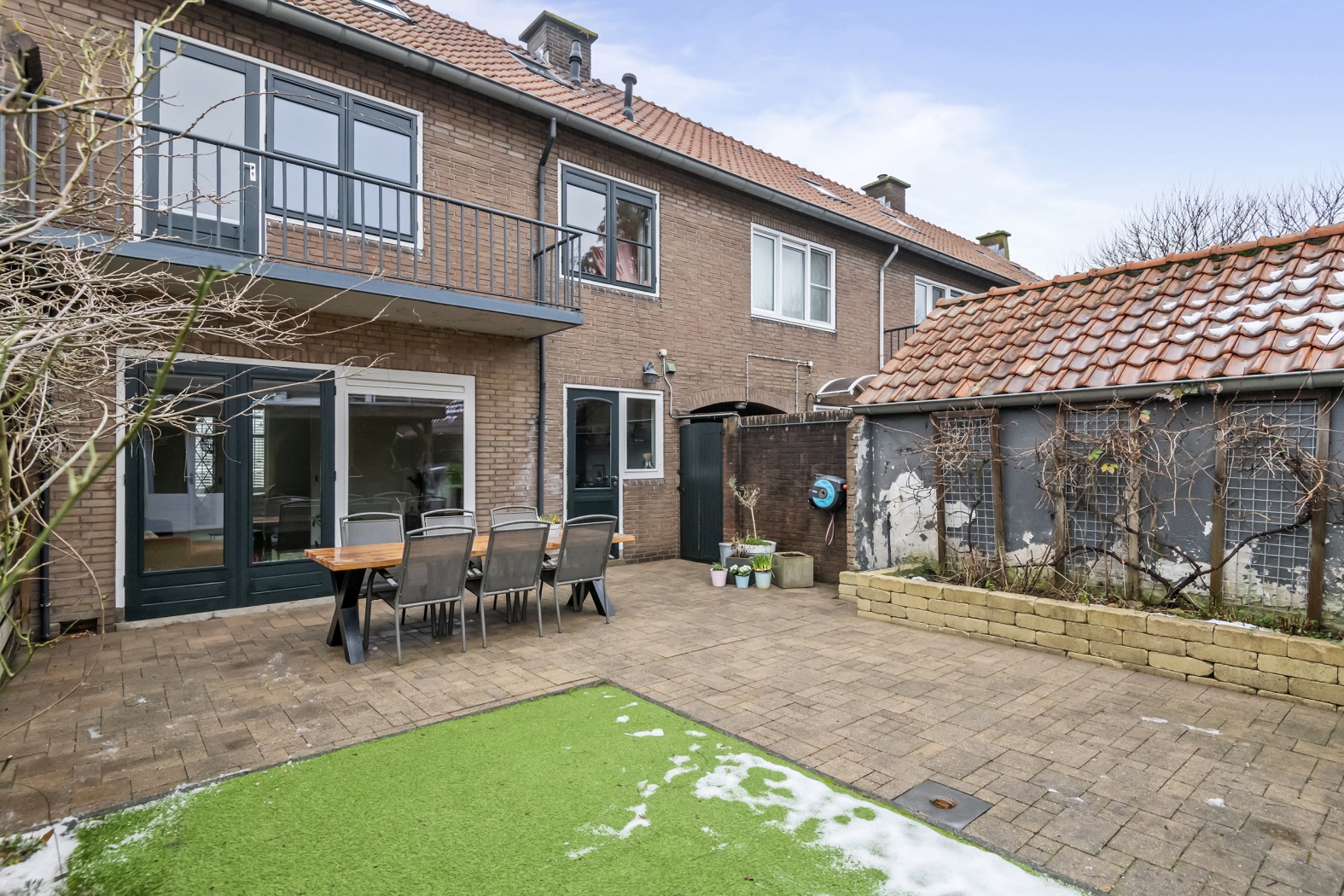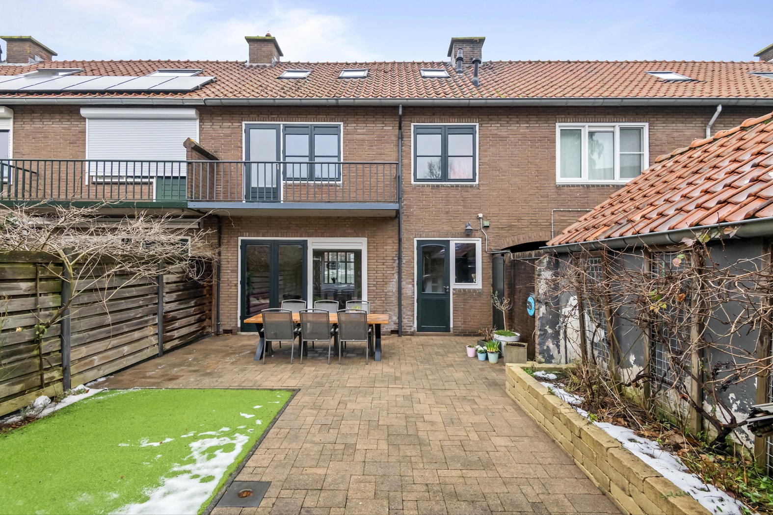 Zonliefhebber? Dan zit je hier helemaal goed. De achtertuin ligt op het zuiden en is super onderhoudsvriendelijk aangelegd, zodat je vooral kunt genieten in plaats van wieden. Denk aan een fijn terras, nette sierbestrating, een verhoogde plantenbak en een strak kunstgras gazon: altijd groen, altijd netjes.