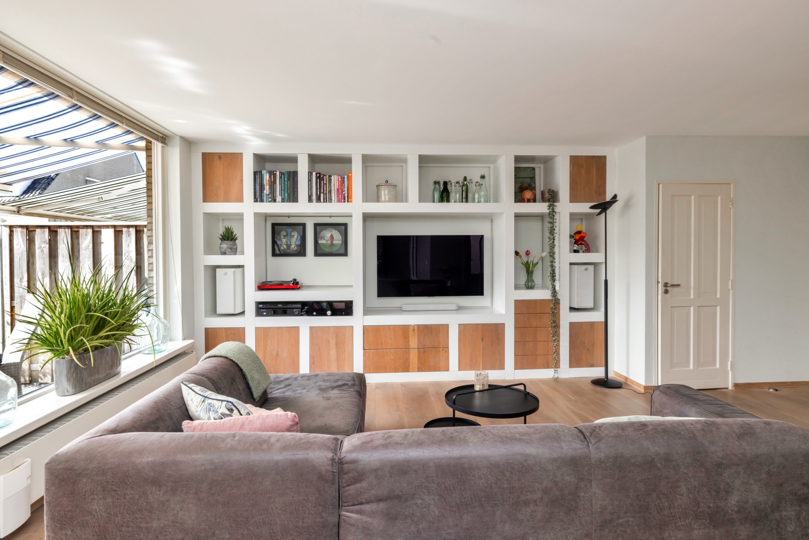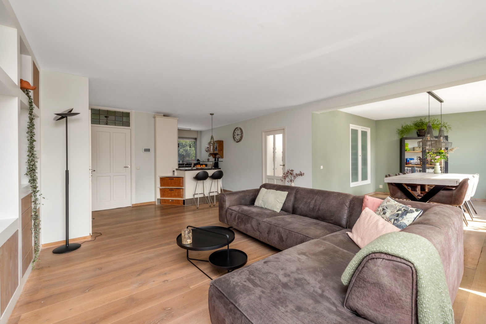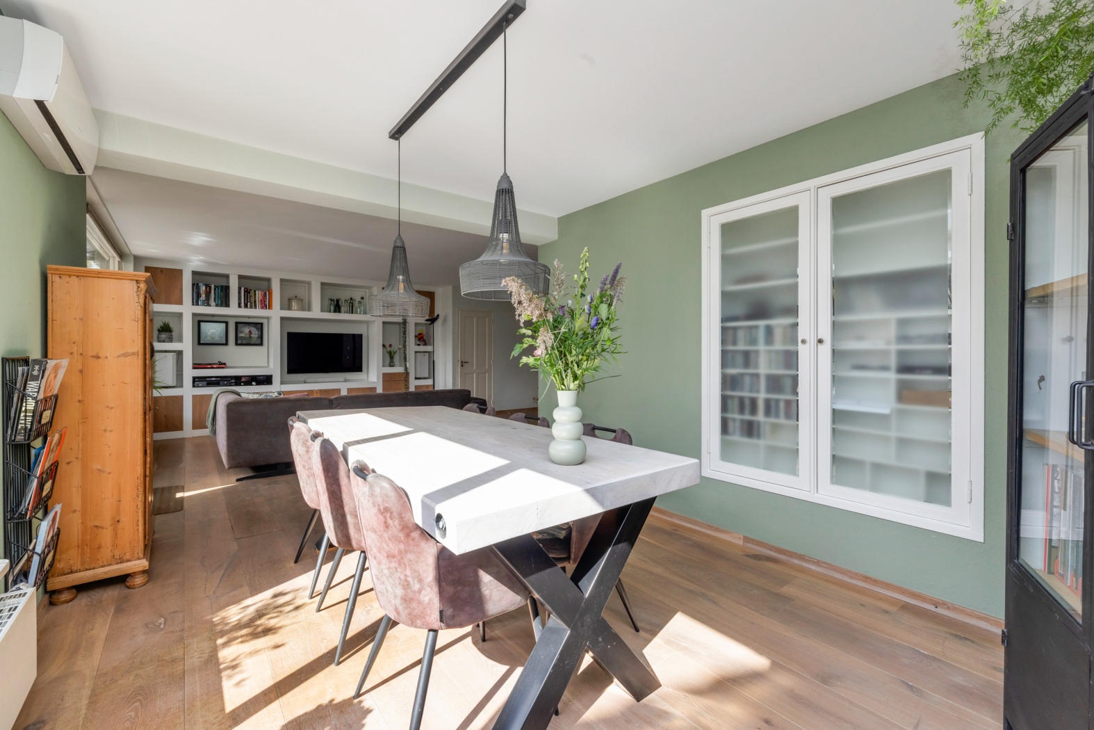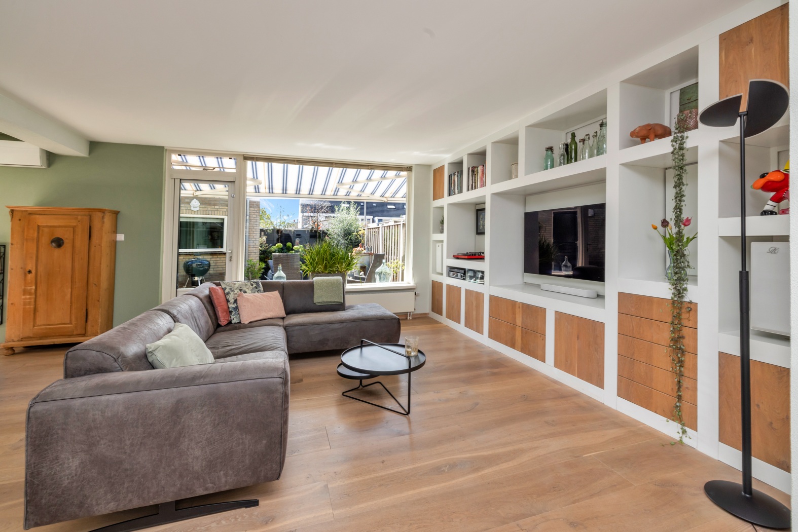De woonkamer is niet zomaar vergroot, maar écht royaal uitgebouwd aan de zijkant. Daar staat nu een gezellige eettafel met uitzicht op de tuin door maar liefst drie ramen. Extra kastruimte? Check: een handige inbouwkast én een trapkast voor alles wat je uit het zicht wilt houden. Grote ramen zorgen voor heerlijk licht, er is een achterdeur naar de tuin en de cinewall maakt het plaatje compleet. De houten vloer geeft het geheel warmte en sfeer – en dankzij de airco in de woonkamer zit je hier ’s zomers altijd koel en comfortabel.