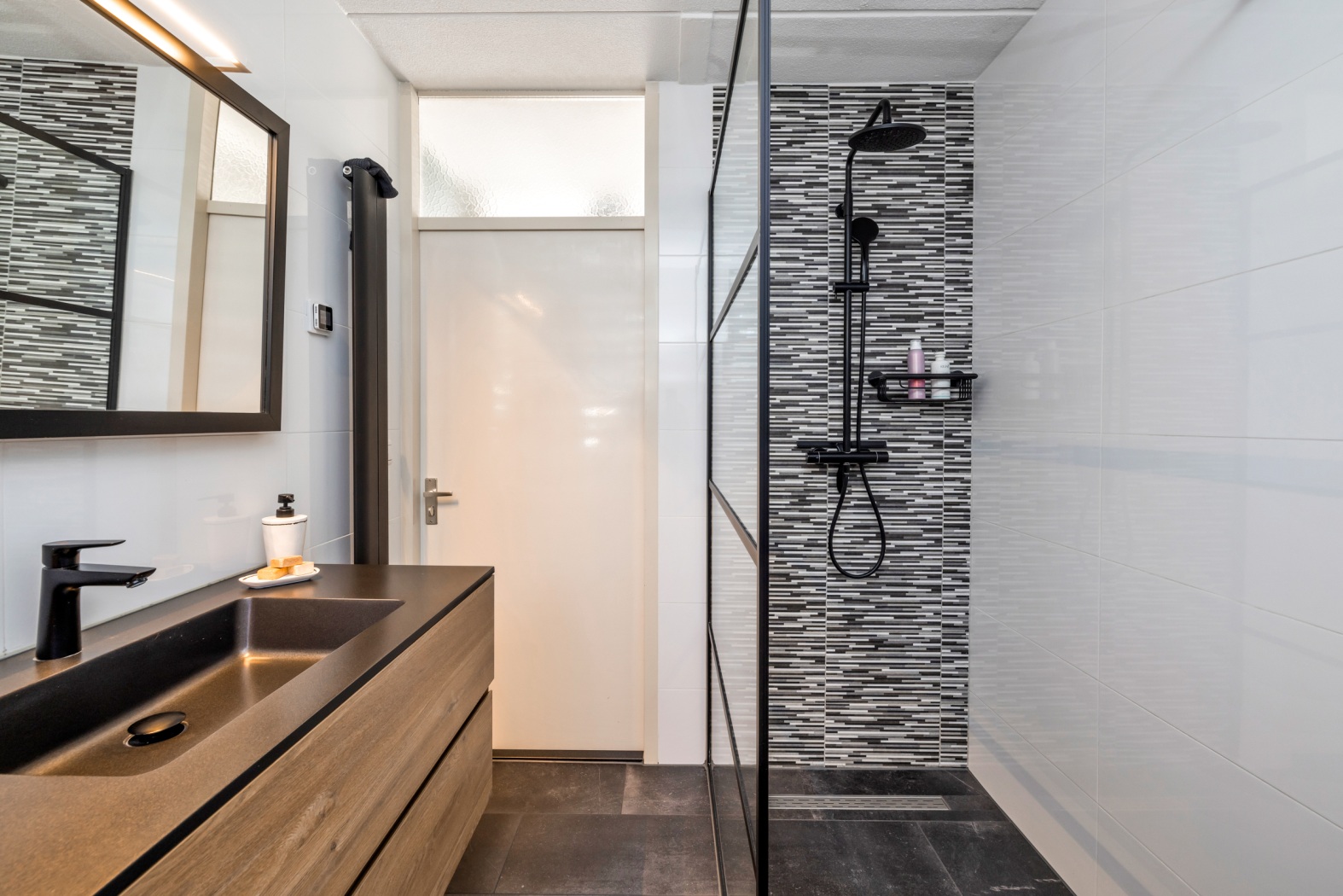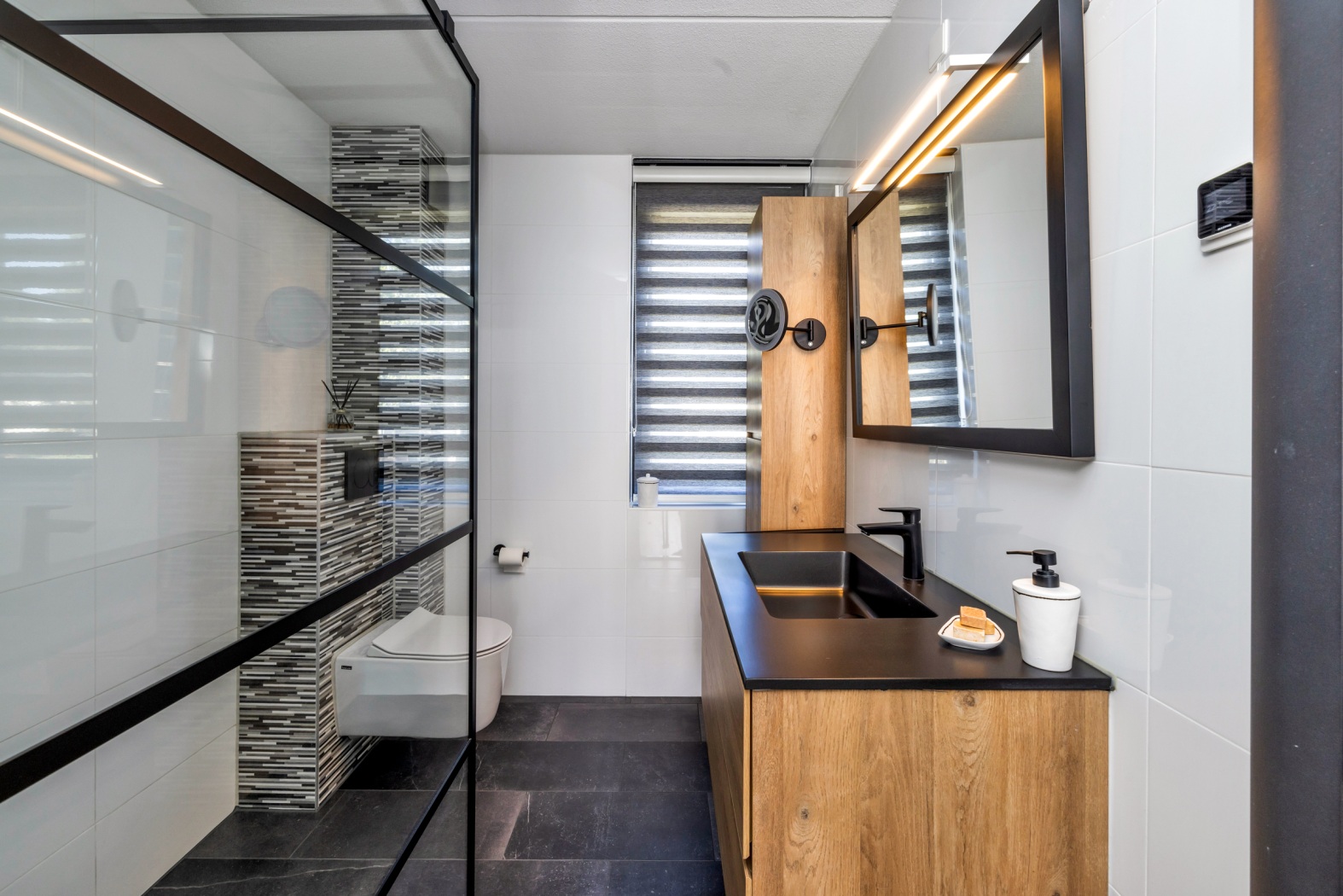 De badkamer aan de voorzijde is nog maar een jaar oud en straalt modern comfort uit. Je vindt hier een ruime inloopdouche met zwarte accenten, voorzien van een regendouche en handdouche. Het houtlook wastafelmeubel met een zwart omlijste spiegel geeft de ruimte een warme en luxe uitstraling. Verder is er een zwevend toilet, stijlvolle tegels, elektrische vloerverwarming en een designradiator – alles voor een frisse start van de dag in stijl.