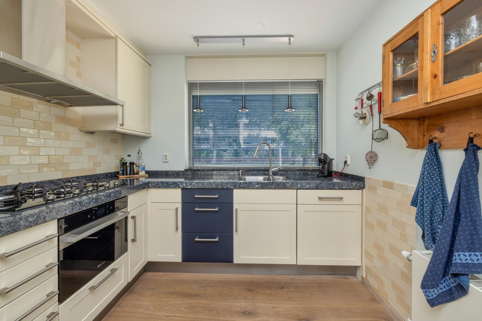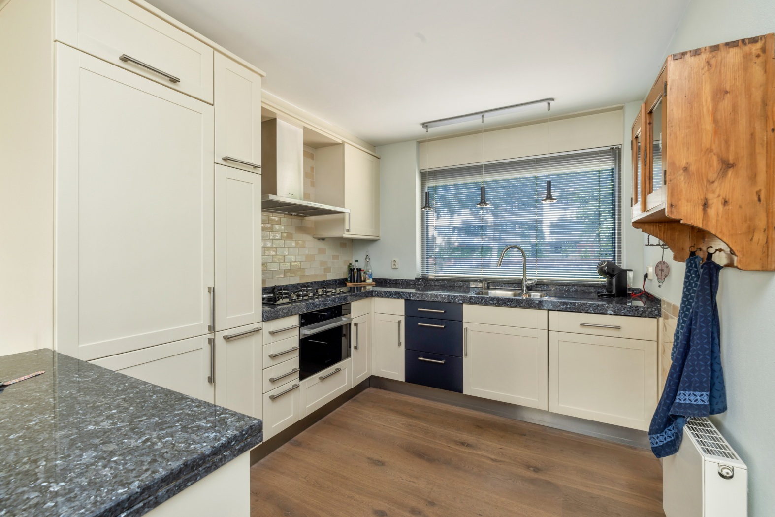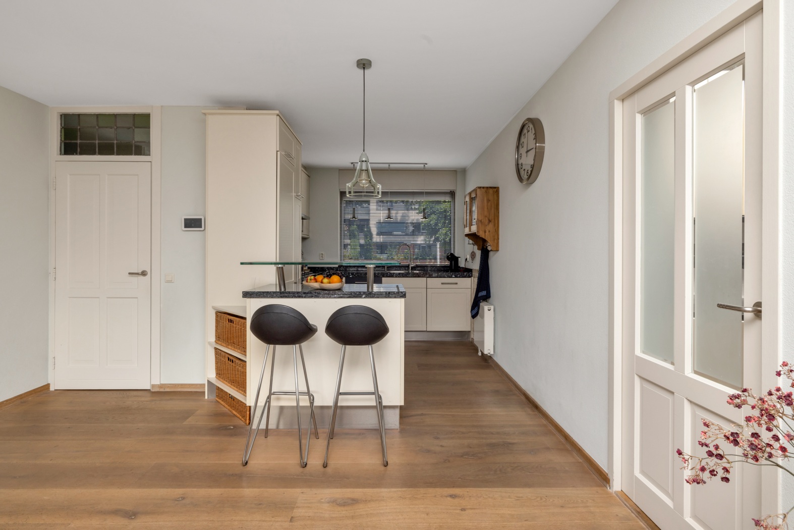 Aan de voorzijde van de woning vind je de lichte keuken in praktische L-opstelling. Het geheel is afgewerkt met een stijlvol natuurstenen blad op zowel het aanrecht als de bar. De bar biedt plek voor twee krukken – perfect voor een snelle espresso of een gezellig praatje tijdens het koken.