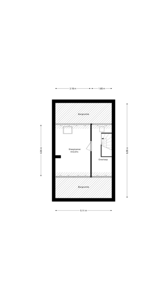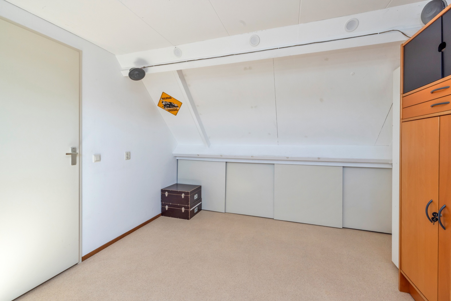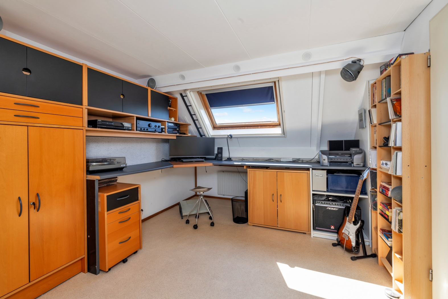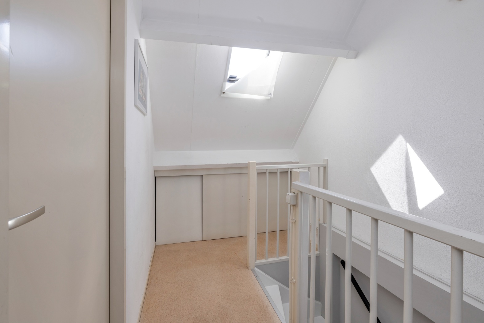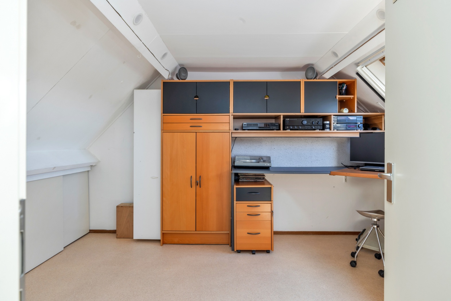Op de voorzolder zorgt een dakraam voor prettig daglicht en vind je achter de knieschotten handige bergruimte. Vanuit hier is er toegang tot de vierde slaapkamer, uitgerust met een kantelraam en eveneens extra bergruimte achter de knieschotten. Tot slot is er nog een aparte zolderberging, bereikbaar via een losse trap – ideaal voor al je seizoensspullen.