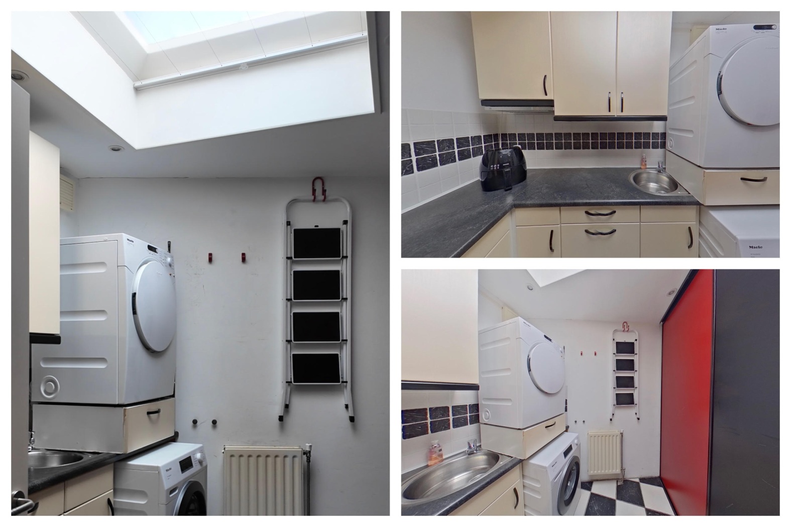 De bijkeuken, toegevoegd bij de uitbouw in 2006, is rechtstreeks bereikbaar vanuit zowel de keuken als de woonkamer – superpraktisch in het dagelijks gebruik. Dankzij de grote lichtkoepel met zonwering is de ruimte aangenaam licht. Je vindt hier de aansluitingen voor wasmachine en droger, een royale schuifwandkast voor al je extra spullen én een handige uitstortgootsteen. Zo blijft het huishouden netjes uit het zicht, maar heb je alles wél direct bij de hand.