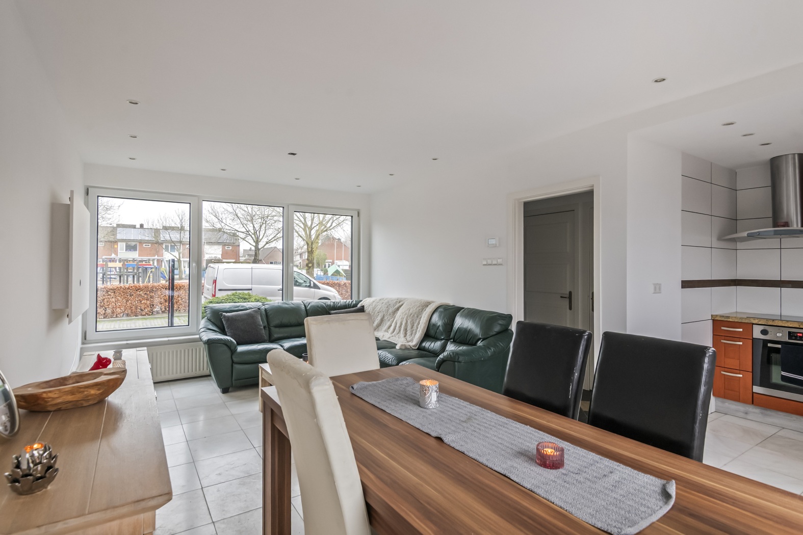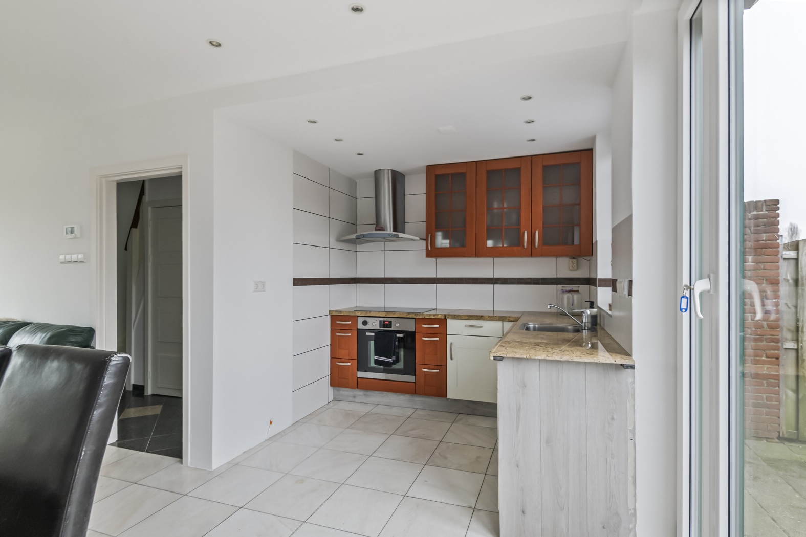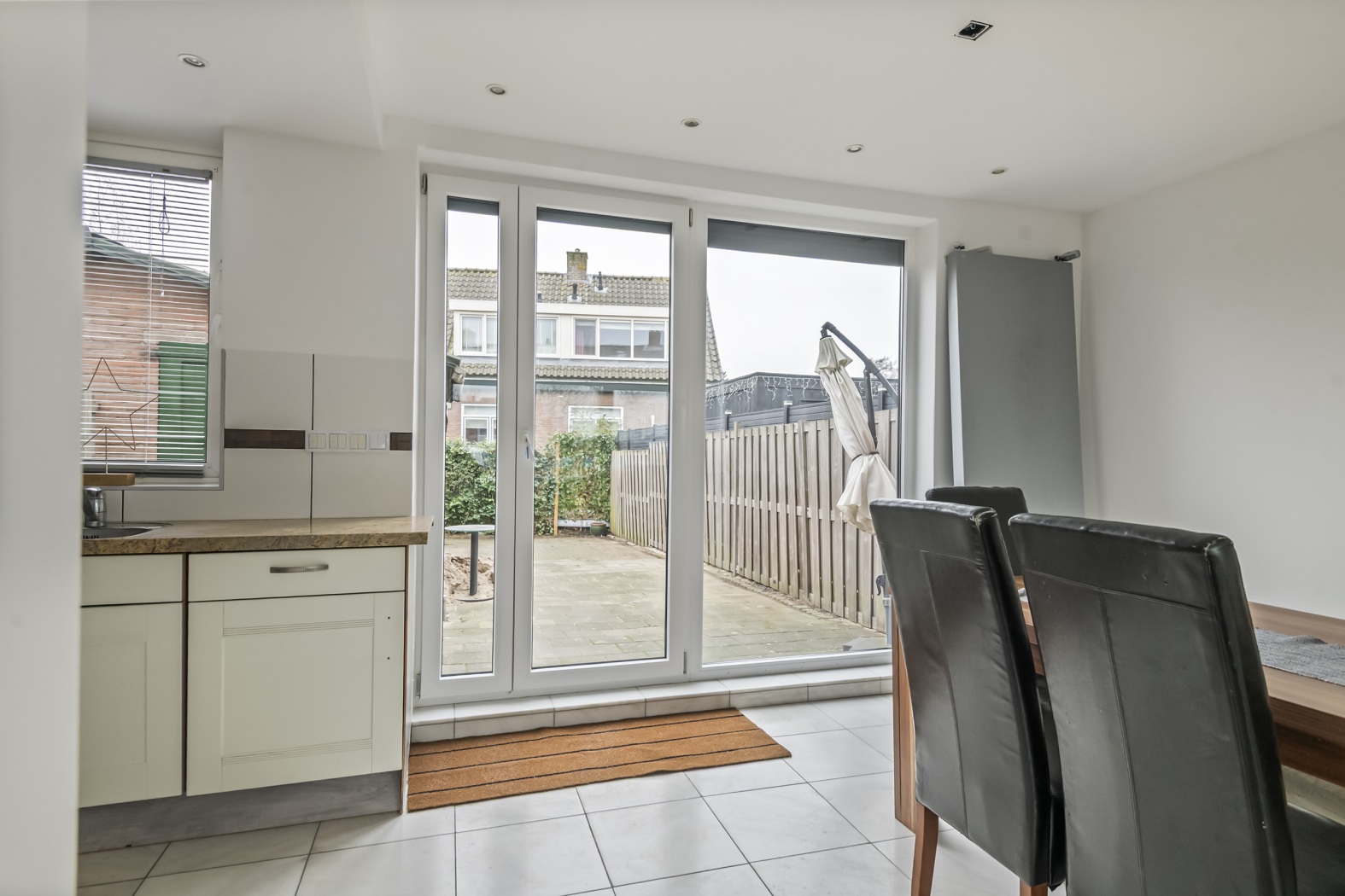 De lichte woonkamer is strak en modern afgewerkt met gestucte wanden en plafonds, voorzien van stijlvolle inbouwspots. De nieuwe kunststof kozijnen zorgen voor een verzorgde uitstraling en veel lichtinval. Aan de achterzijde geven anderhalve openslaande deuren direct toegang tot de zonnige tuin, waardoor binnen en buiten mooi in elkaar overlopen. De plavuizenvloer is praktisch en onderhoudsvriendelijk.