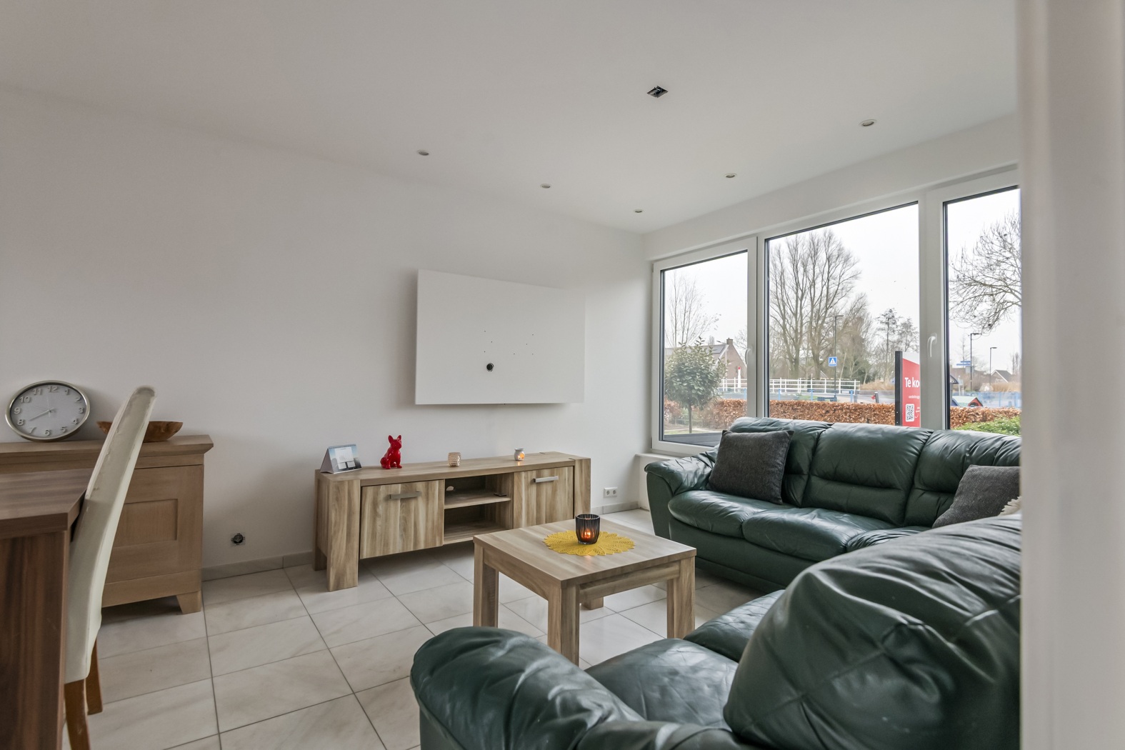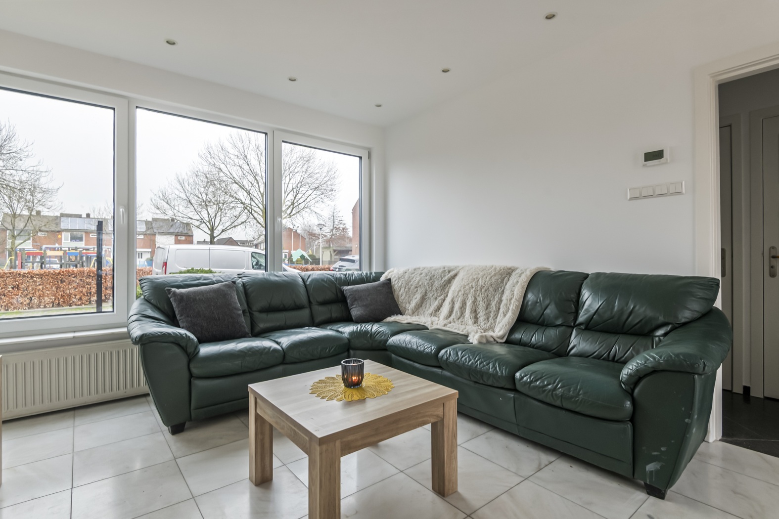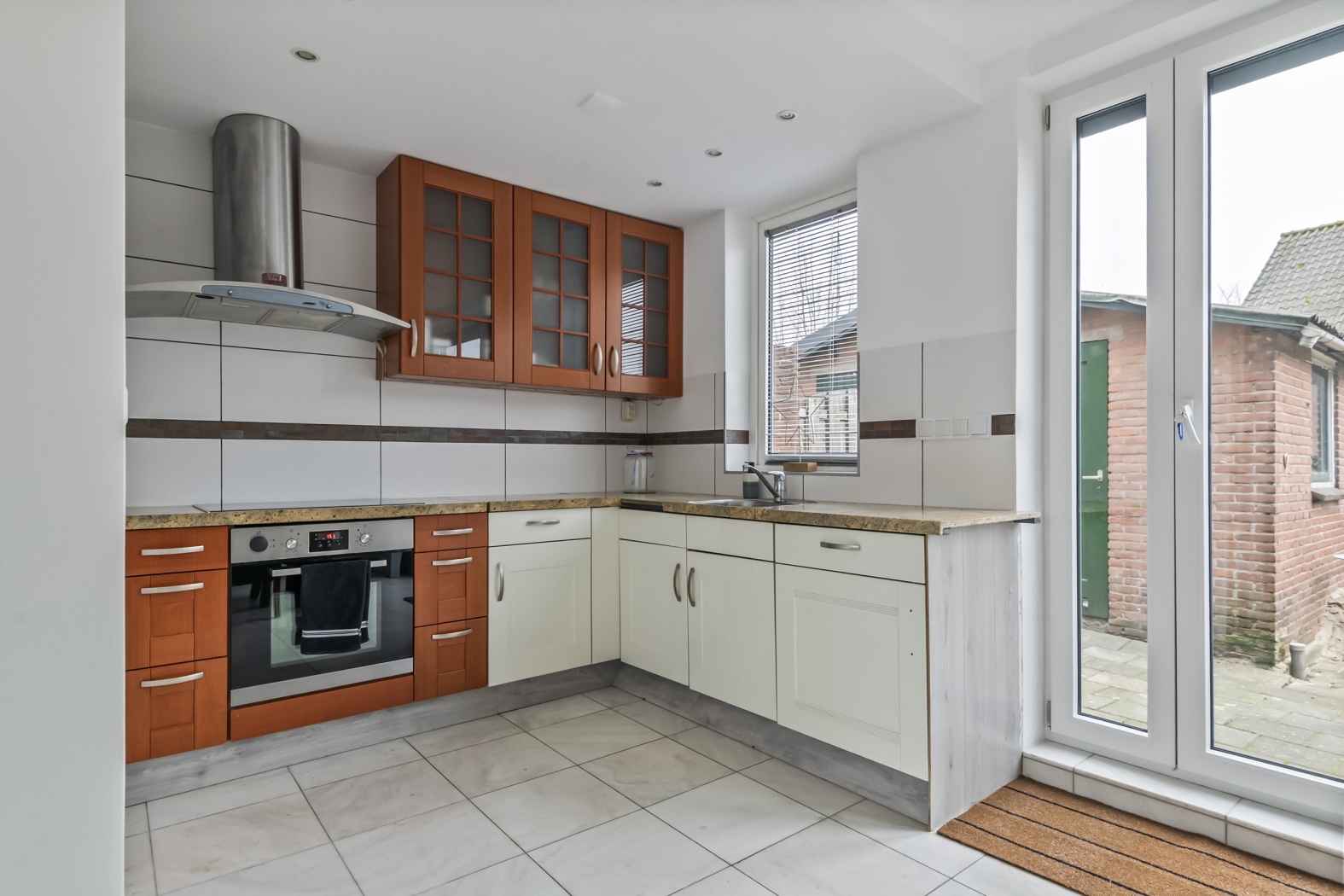De lichte woonkamer is strak en modern afgewerkt met gestucte wanden en plafonds, voorzien van stijlvolle inbouwspots. De nieuwe kunststof kozijnen zorgen voor een verzorgde uitstraling en veel lichtinval. Aan de achterzijde geven anderhalve openslaande deuren direct toegang tot de zonnige tuin, waardoor binnen en buiten mooi in elkaar overlopen. De plavuizenvloer is praktisch en onderhoudsvriendelijk.
