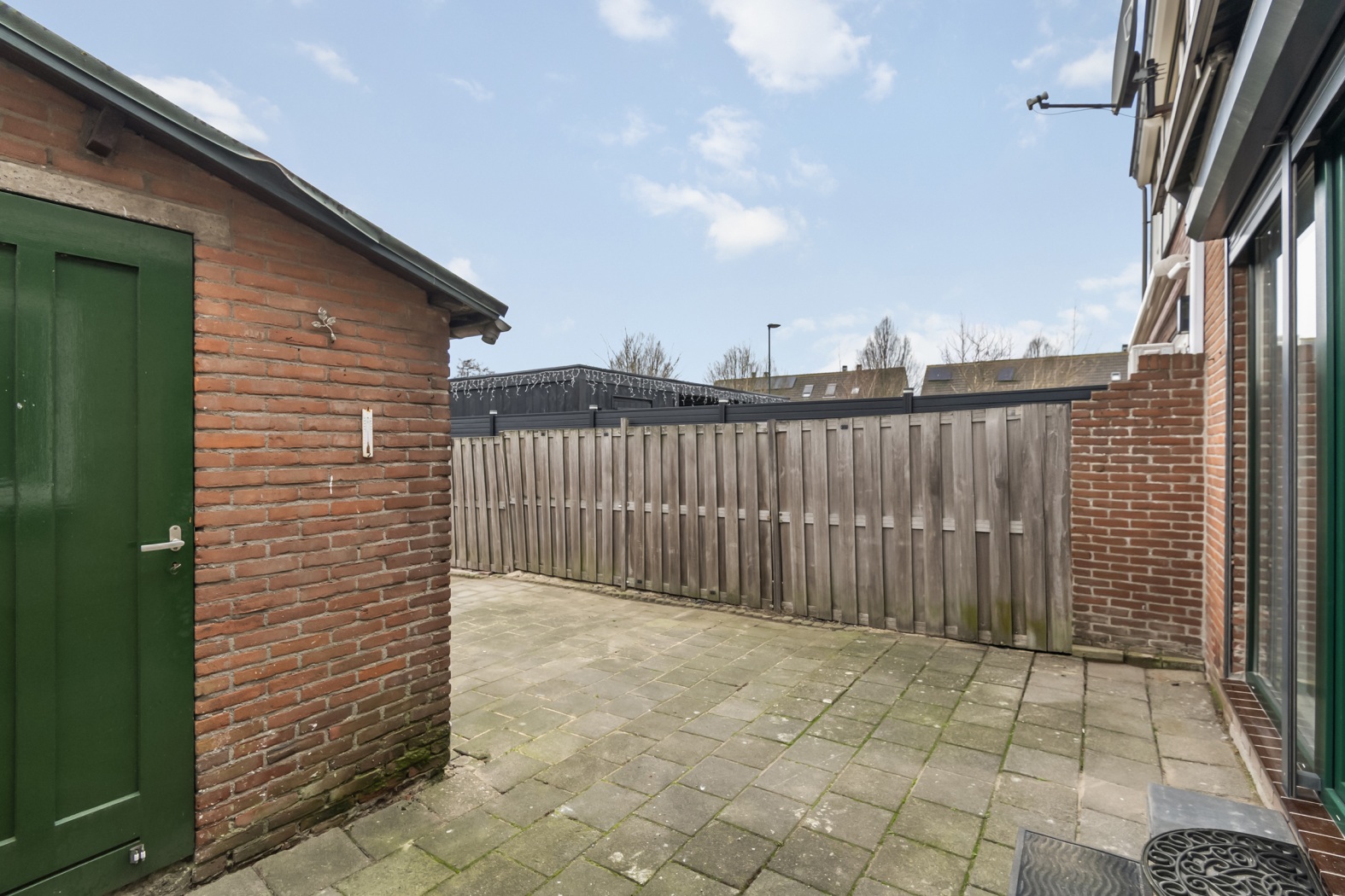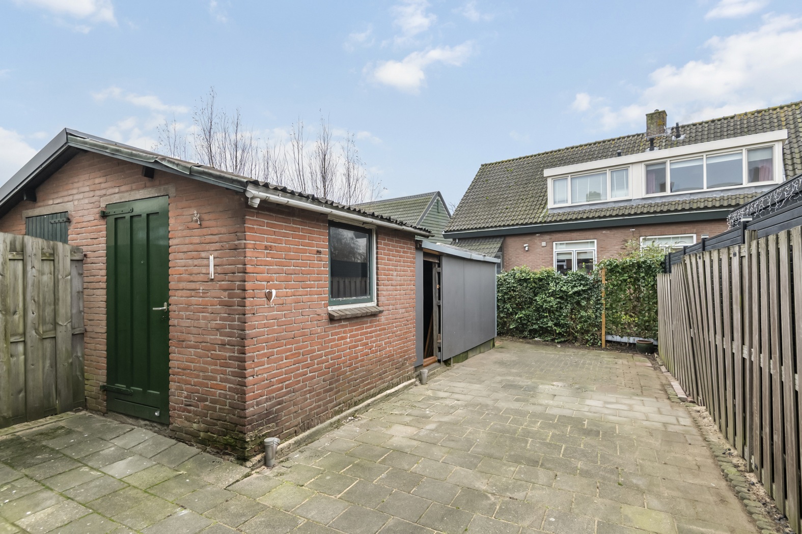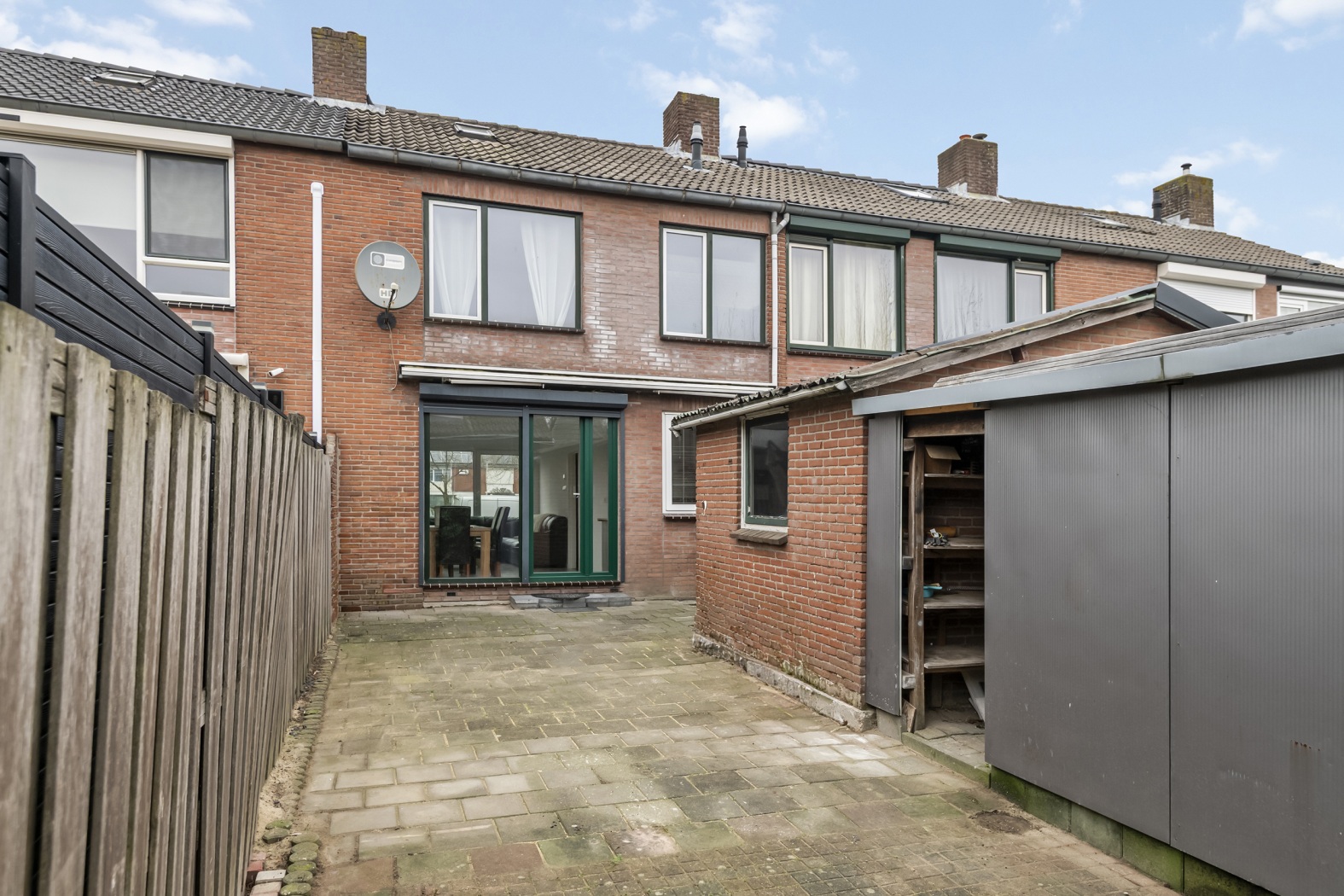 De achtertuin is gunstig gelegen op het zuiden, waardoor je hier de hele dag van de zon kunt genieten. De tuin is volledig bestraat en onderhoudsvriendelijk ingericht, omgeven door schuttingen die zorgen voor privacy. Halverwege de tuin bevindt zich een stenen schuur, deels vergroot met een aanbouw, ideaal voor extra opslag of hobbyruimte.