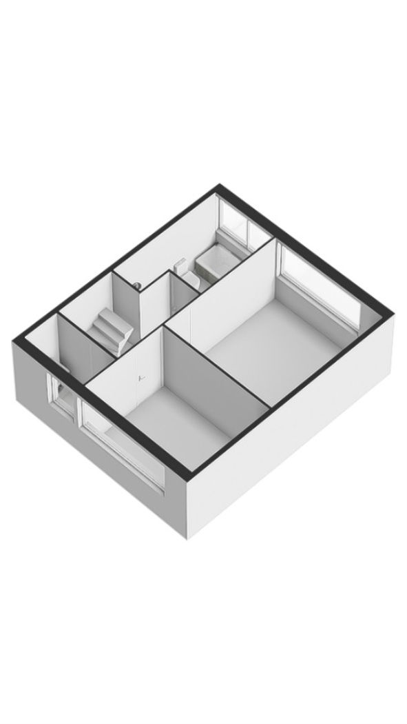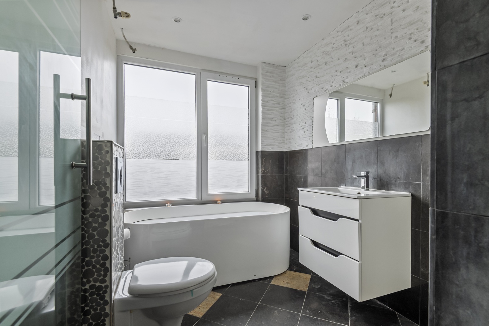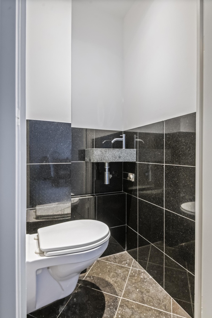 Eén van de kamers is opgeofferd om plaats te maken voor een royale en comfortabele badkamer. Deze is compleet ingericht met een douchecabine met regendouche, een zwevend toilet, een stijlvol badkamermeubel en een elegant ovaal ligbad. Een fijne, ontspannen ruimte waar comfort en functionaliteit perfect samenkomen.