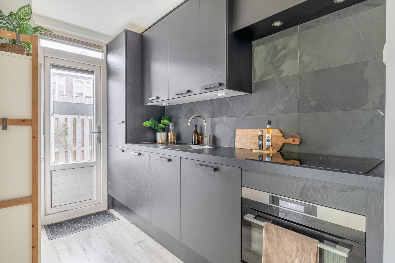 Aansluitend aan de woonkamer bevindt zich de moderne open keuken. Deze is strak uitgevoerd en voorzien van diverse inbouwapparatuur, waardoor je hier van alle gemakken bent voorzien. Zowel vanuit de woonkamer als vanuit de keuken heb je directe toegang tot de tuin, ideaal voor lange zomeravonden of een kop koffie in de ochtendzon.