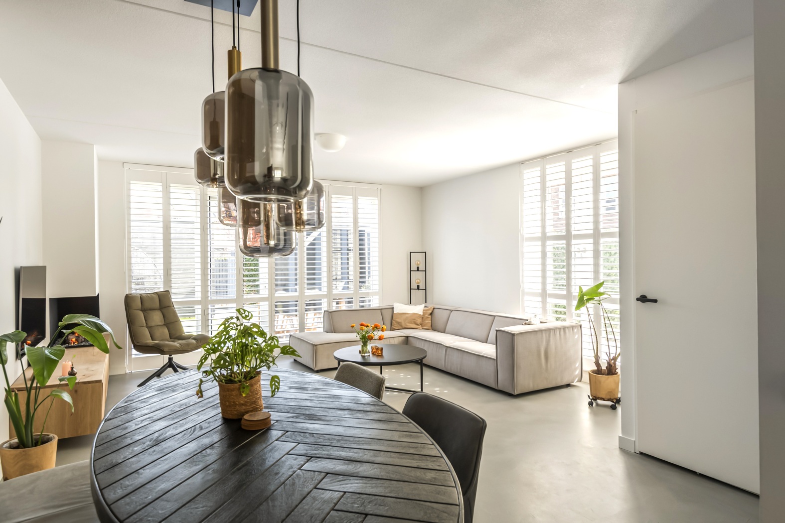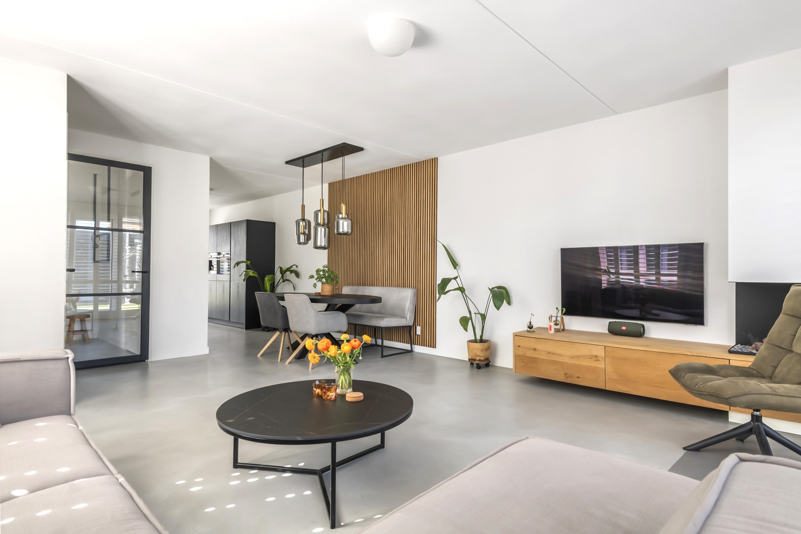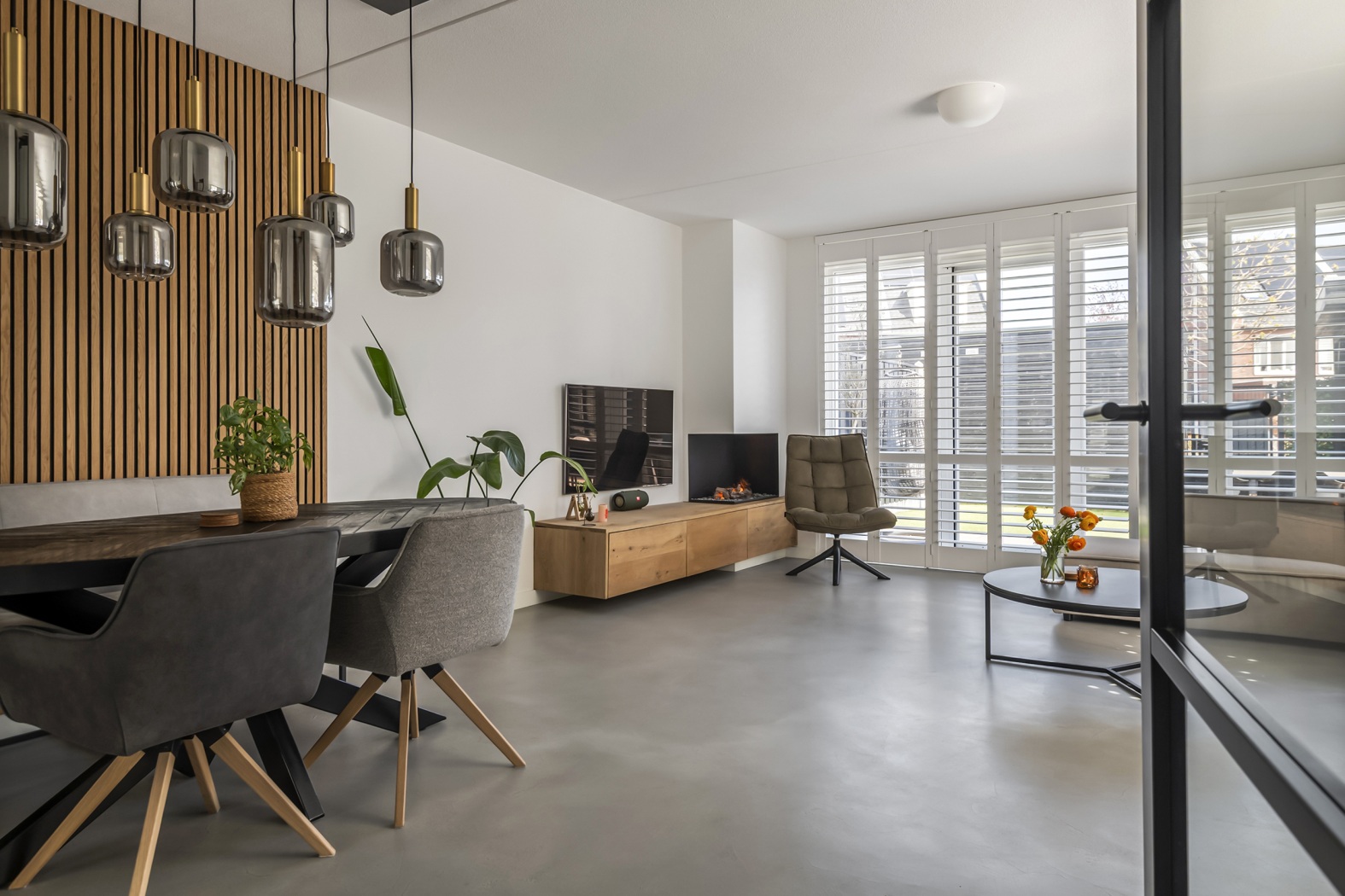 De combinatie van strakke beton ciré vloer met vloerverwarming en -koeling, gezellige waterdamp sfeerhaard en de witte shutters voor de ramen geeft de ruimte een warme, eigentijdse sfeer. Praktisch is de trapkast met opstelplaats voor de warmtepomp. Aansluitend aan de keuken is volop ruimte voor een royale eettafel, stijlvol verrijkt met een akoestisch latten wandpaneel. Een warme, sfeervolle plek waar je samenkomt, uitgebreid tafelt en geniet van mooie momenten.