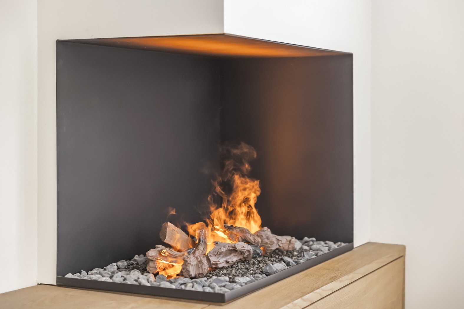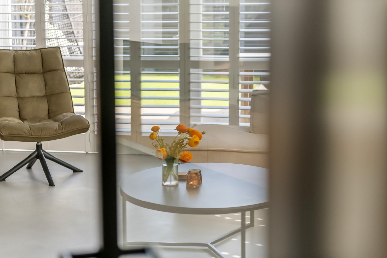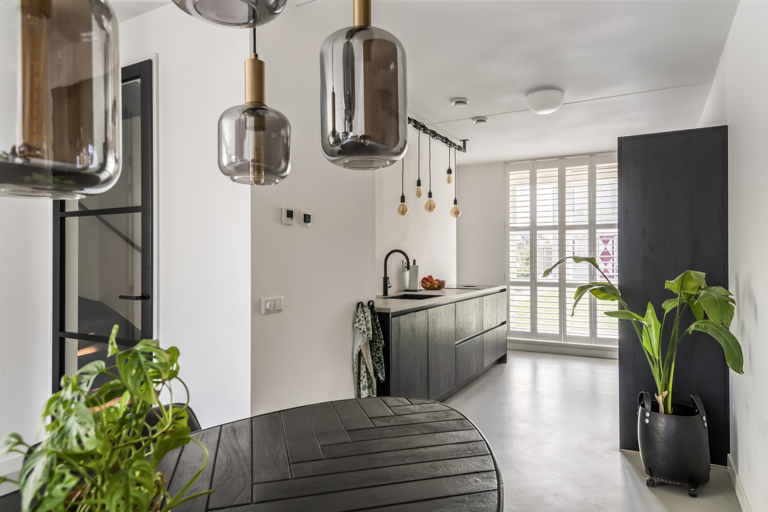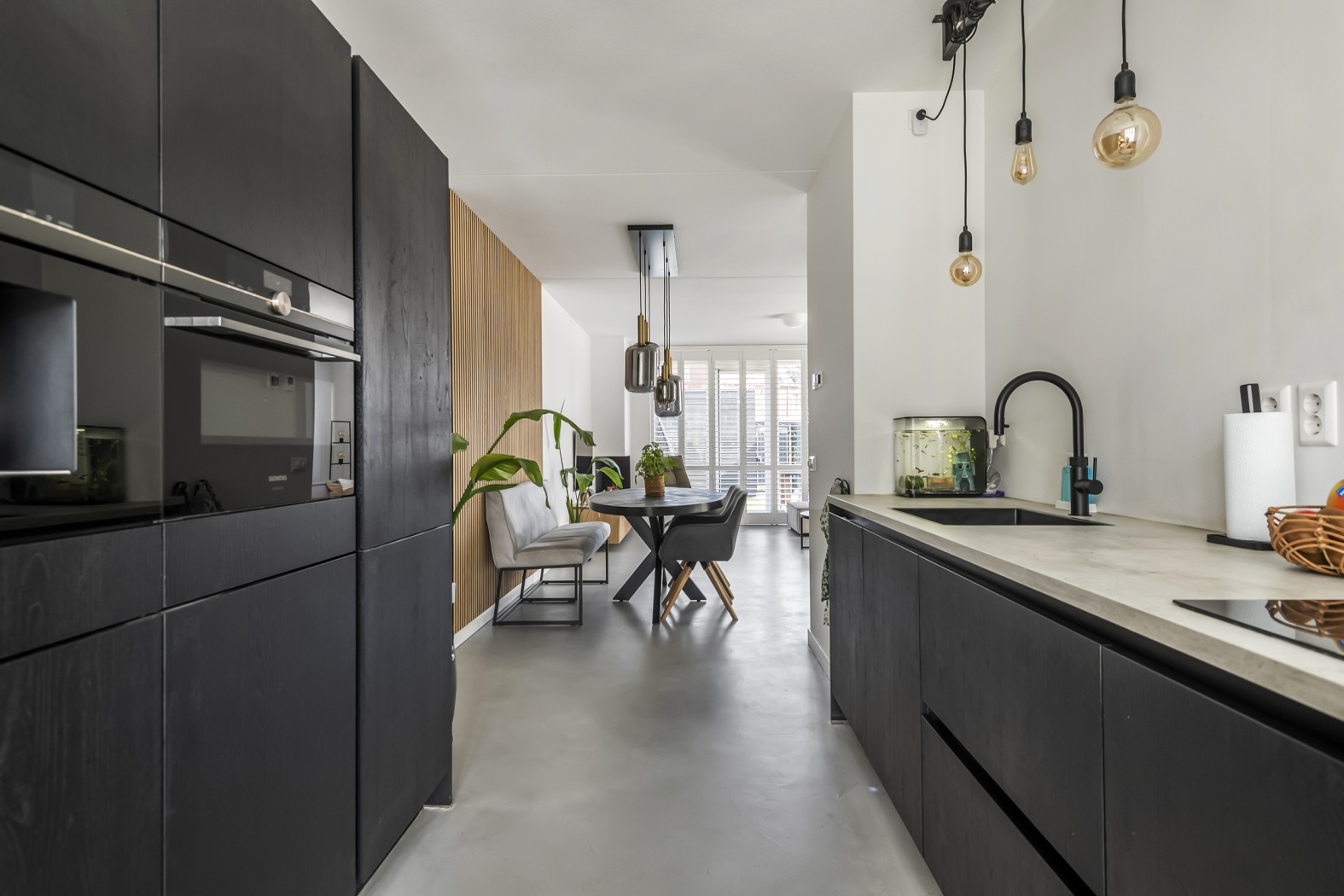 De combinatie van strakke beton ciré vloer met vloerverwarming en -koeling, gezellige waterdamp sfeerhaard en de witte shutters voor de ramen geeft de ruimte een warme, eigentijdse sfeer. Praktisch is de trapkast met opstelplaats voor de warmtepomp. Aansluitend aan de keuken is volop ruimte voor een royale eettafel, stijlvol verrijkt met een akoestisch latten wandpaneel. Een warme, sfeervolle plek waar je samenkomt, uitgebreid tafelt en geniet van mooie momenten.