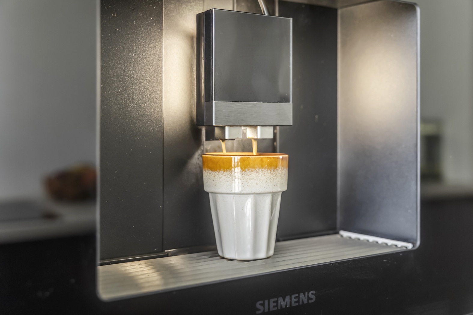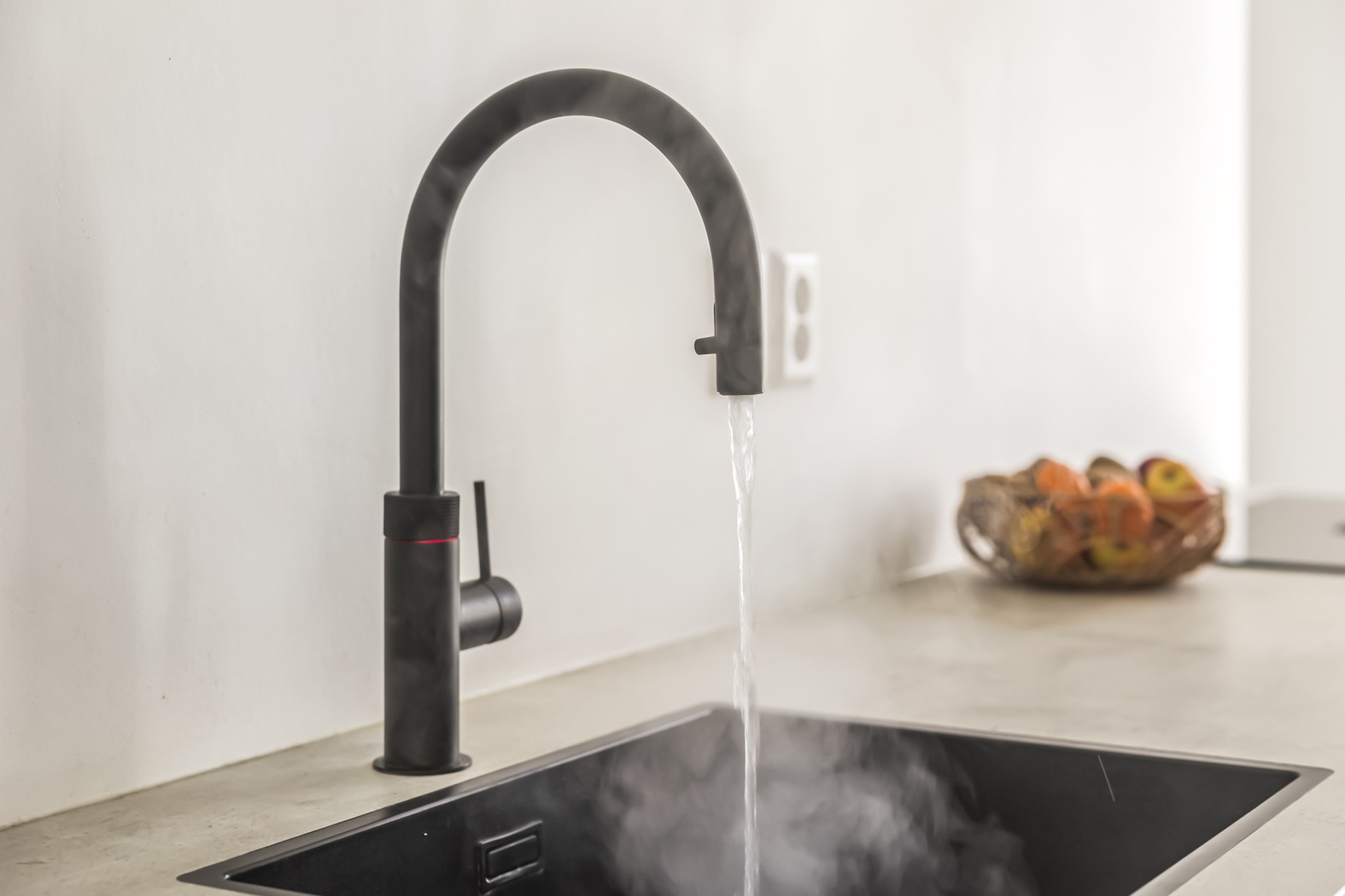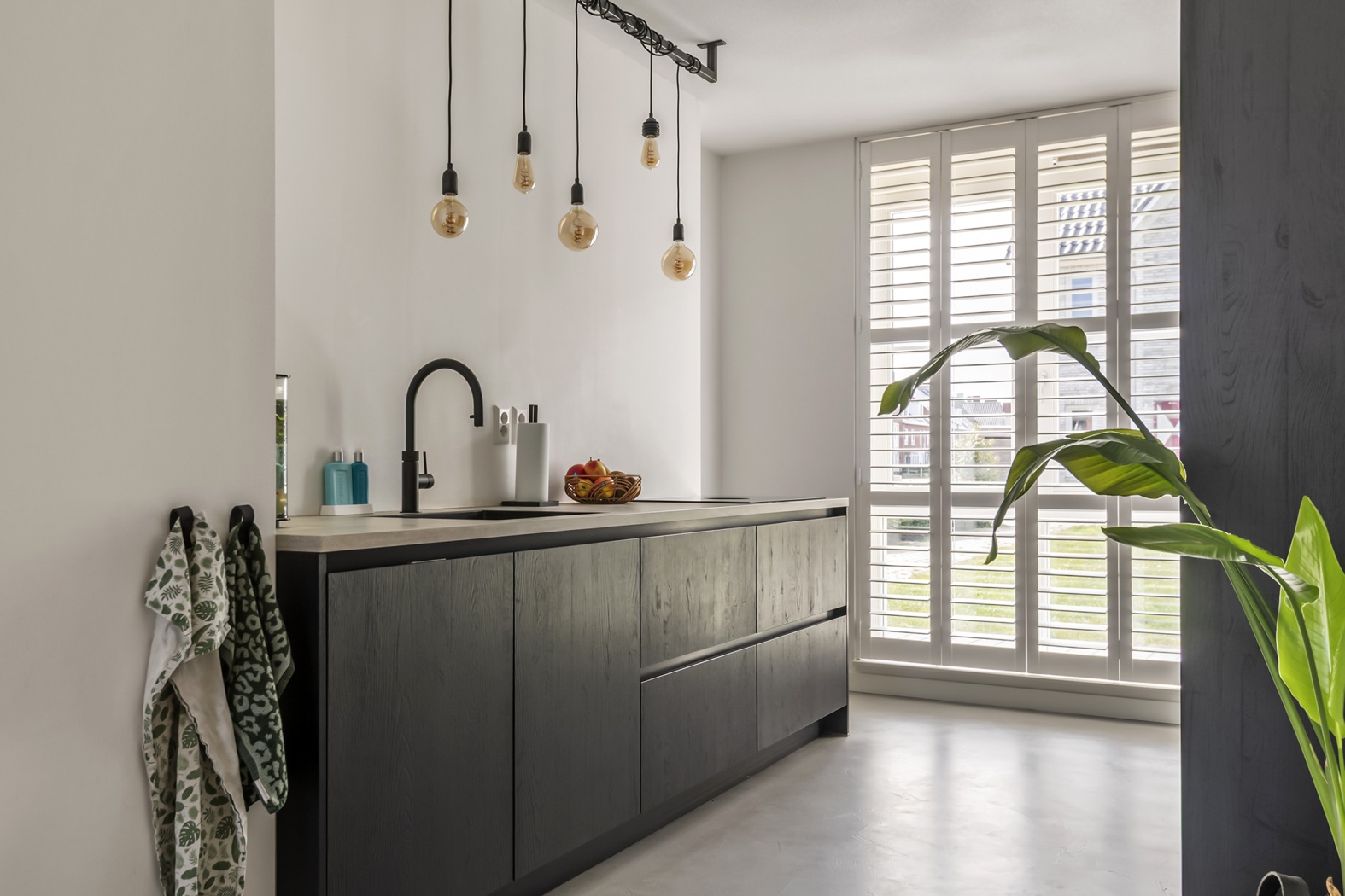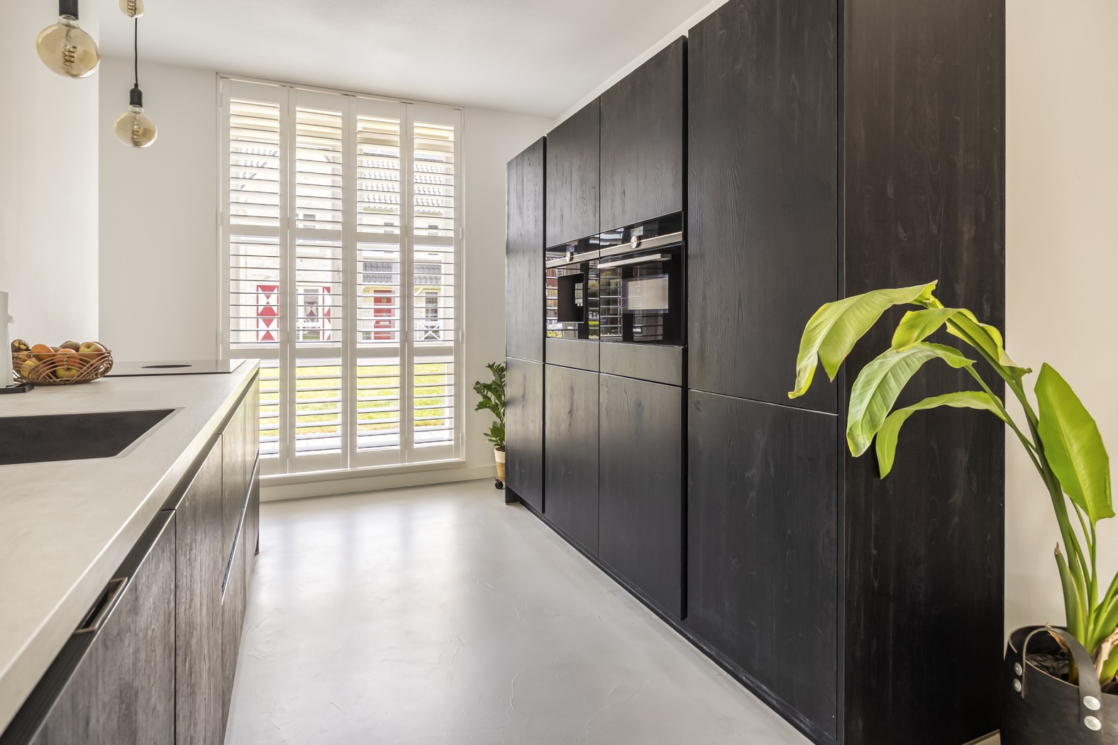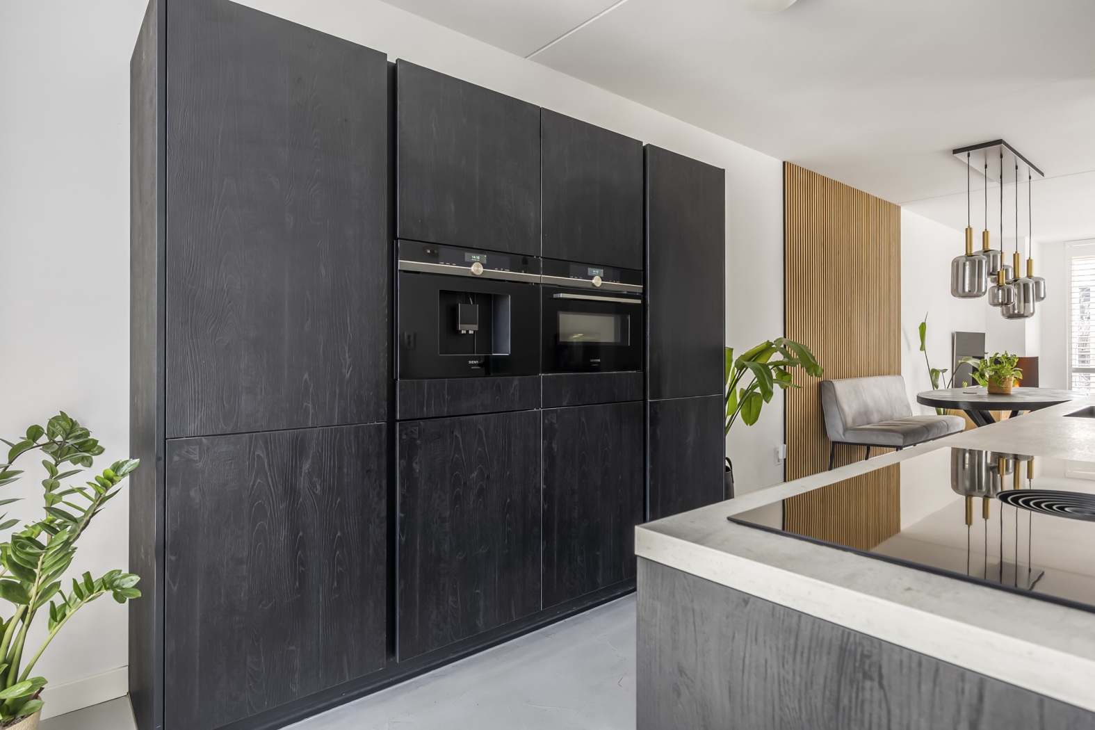 De keuken bevindt zich aan de voorzijde en is een echte blikvanger: modern, strak en uitgevoerd in stijlvol zwart houtlook. Het grote raam zorgt voor een mooie lichtinval, waardoor de ruimte open en uitnodigend aanvoelt. De parallelle opstelling biedt niet alleen een fraaie uitstraling, maar ook optimaal gebruiksgemak. Uiteraard is de keuken compleet uitgerust met hoogwaardige inbouwapparatuur, waaronder een inductiekookplaat met geïntegreerde afzuiging, een combi-oven, koelkast en vriezer, een ingebouwd koffiezetapparaat en een Quooker-kraan.