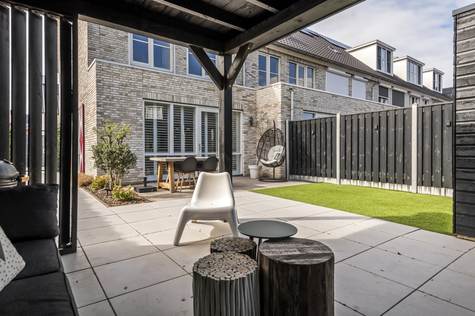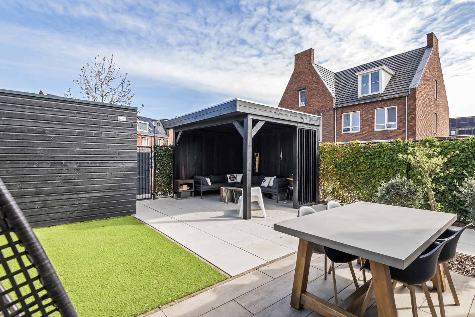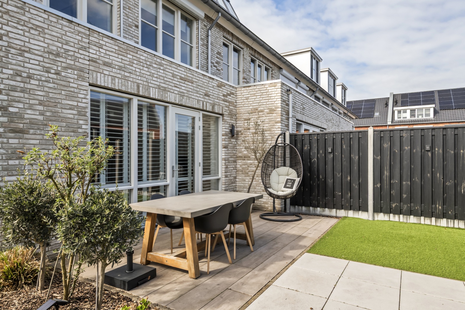 De tuin is strak en verzorgd aangelegd en ligt gunstig op het oosten – perfect om de dag te beginnen met een kop koffie in de ochtendzon. Het zonneterras vormt samen met het onderhoudsvriendelijke kunstgras gazon een stijlvol en altijd verzorgd geheel. Onder de sfeervolle lounge overkapping is het heerlijk ontspannen: een fijne plek om te relaxen of gezellig te borrelen met vrienden. De combinatie van zwarte schuttingen en groene klimophagen zorgt voor een moderne, maar warme uitstraling. Via de achterzijde bereik je via een poort het parkeerhof, wat extra gemak biedt. Daarnaast is er een praktische houten fietsenberging van ca. 5 m² aanwezig.
