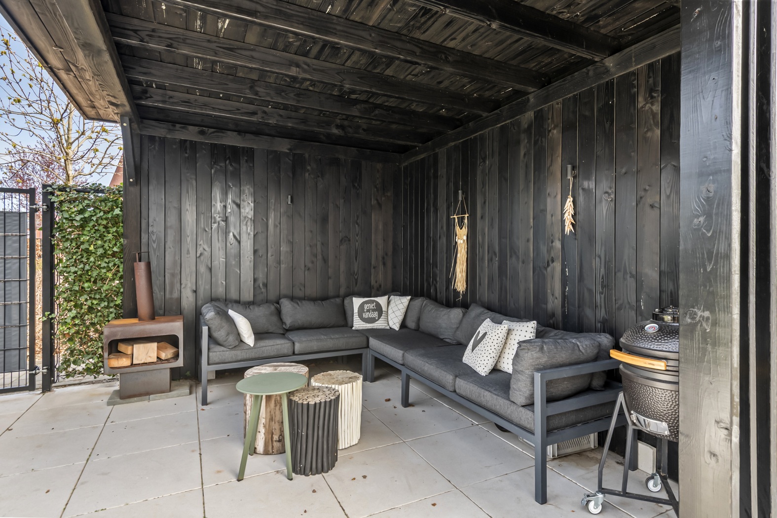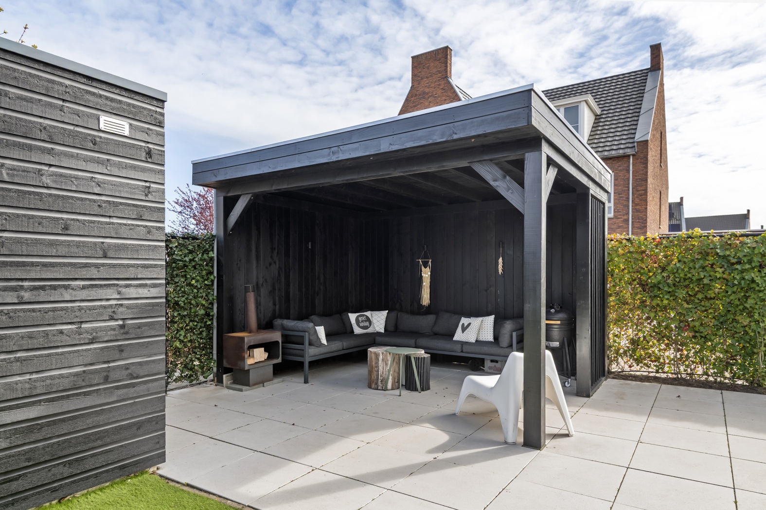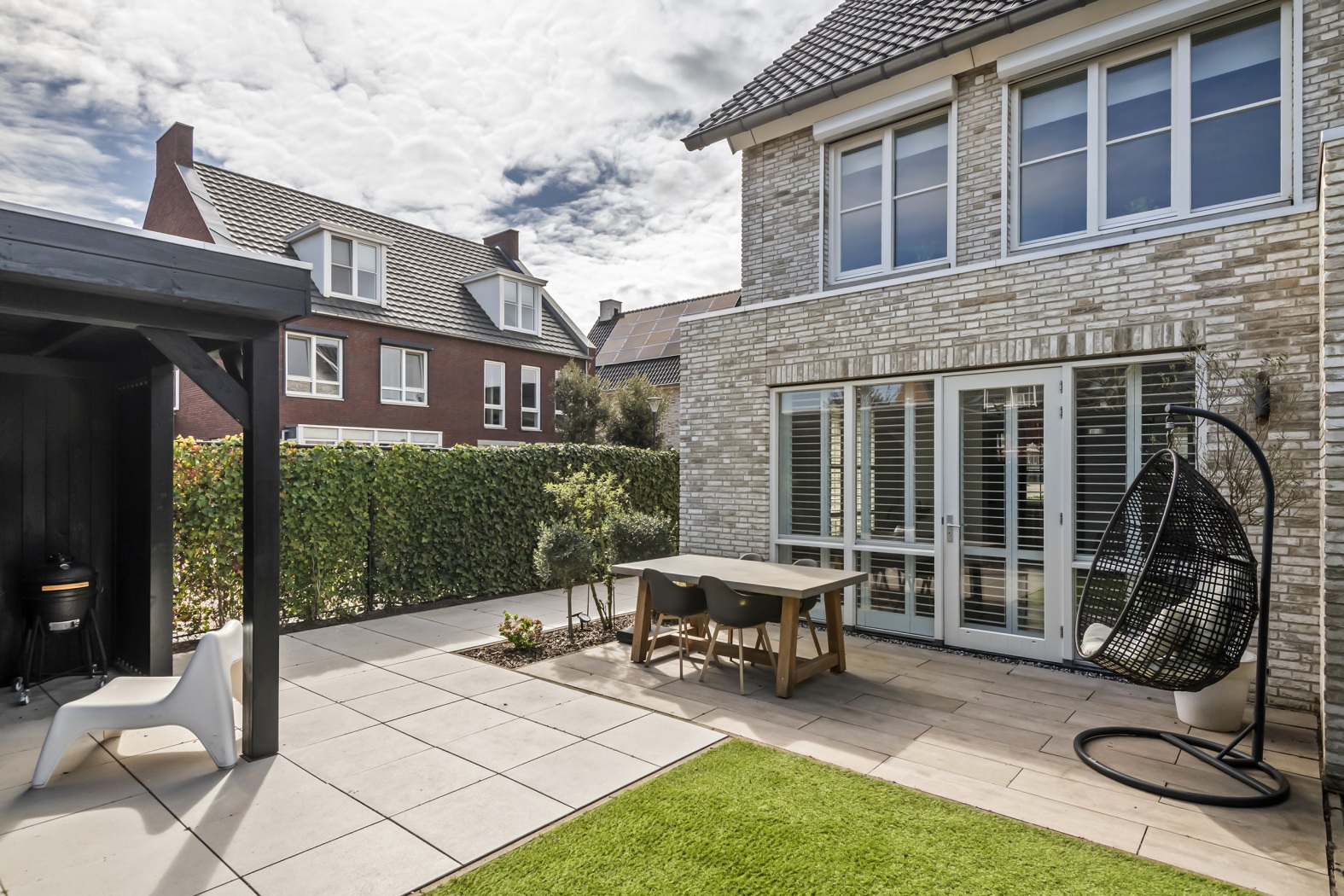 De tuin is strak en verzorgd aangelegd en ligt gunstig op het oosten – perfect om de dag te beginnen met een kop koffie in de ochtendzon. Het zonneterras vormt samen met het onderhoudsvriendelijke kunstgras gazon een stijlvol en altijd verzorgd geheel. Onder de sfeervolle lounge overkapping is het heerlijk ontspannen: een fijne plek om te relaxen of gezellig te borrelen met vrienden. De combinatie van zwarte schuttingen en groene klimophagen zorgt voor een moderne, maar warme uitstraling. Via de achterzijde bereik je via een poort het parkeerhof, wat extra gemak biedt. Daarnaast is er een praktische houten fietsenberging van ca. 5 m² aanwezig.