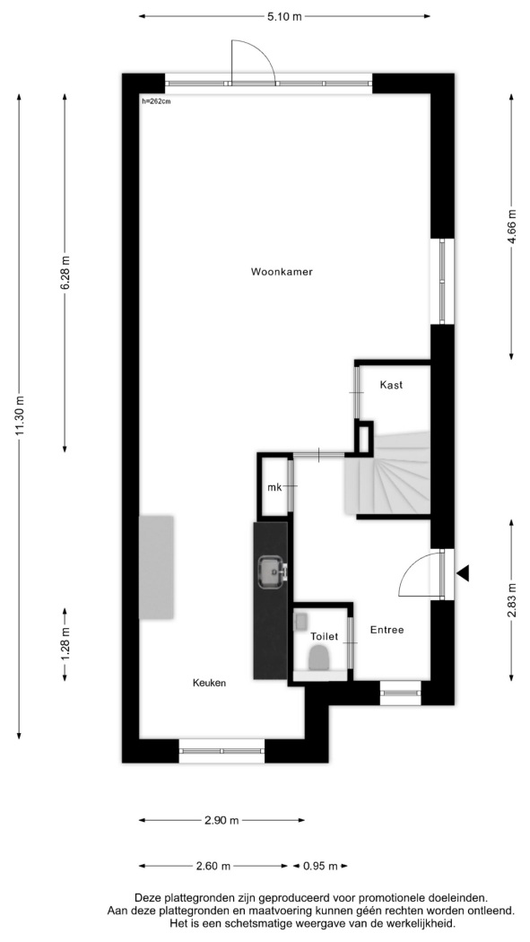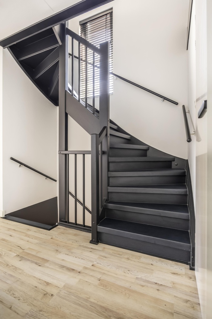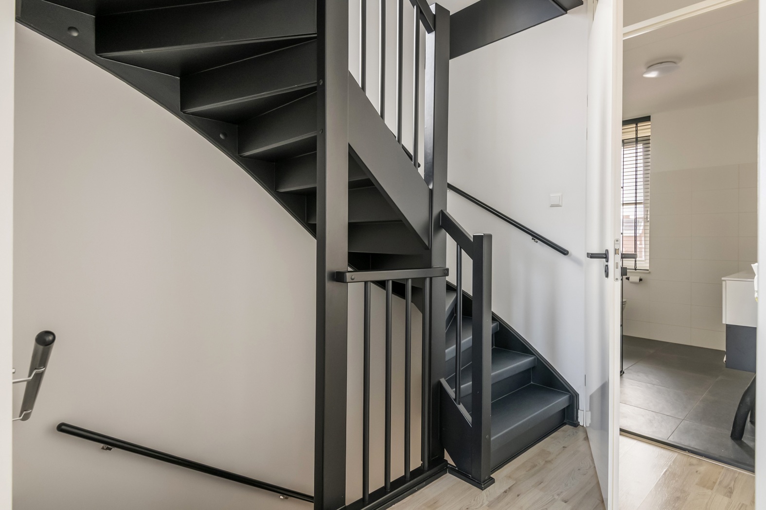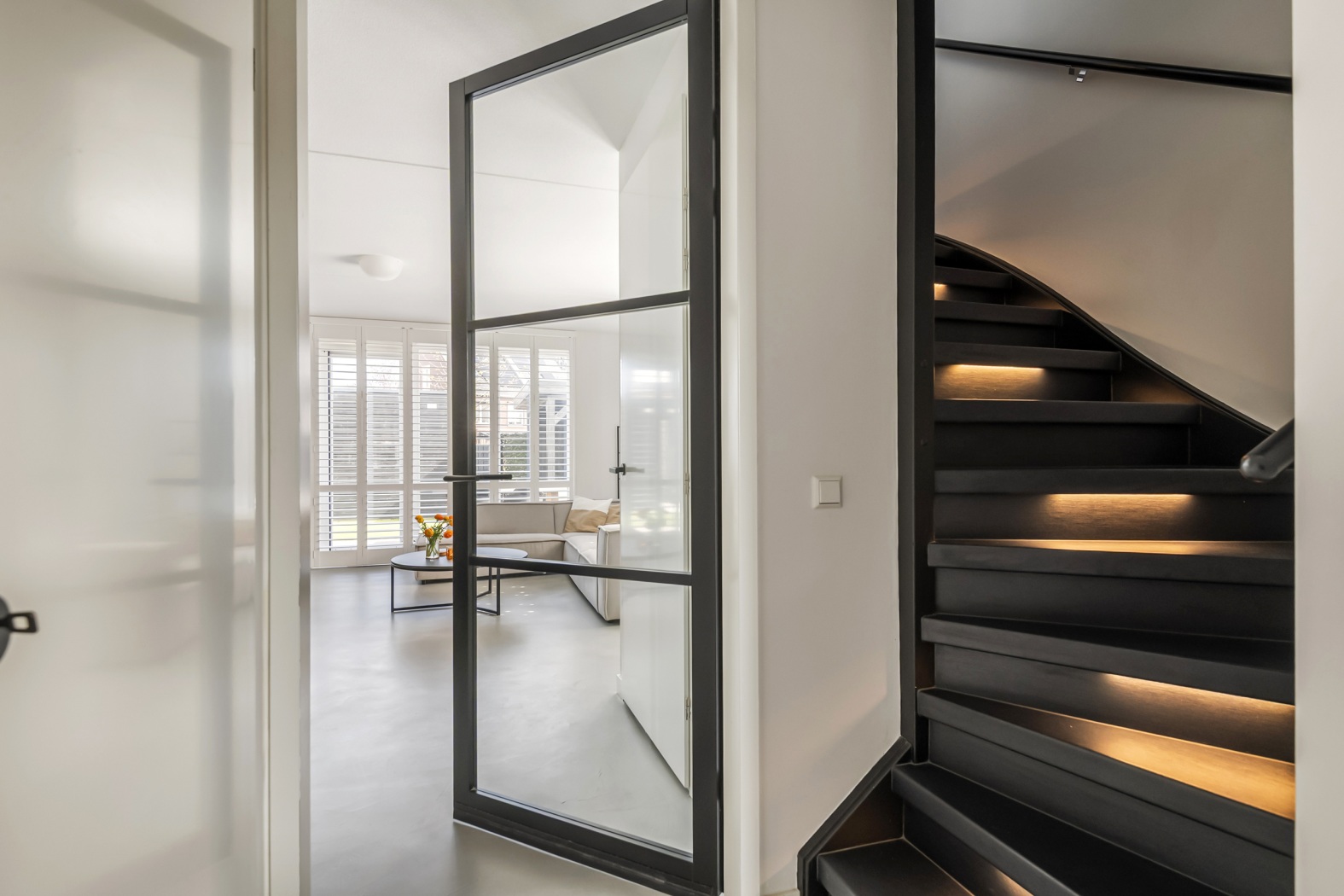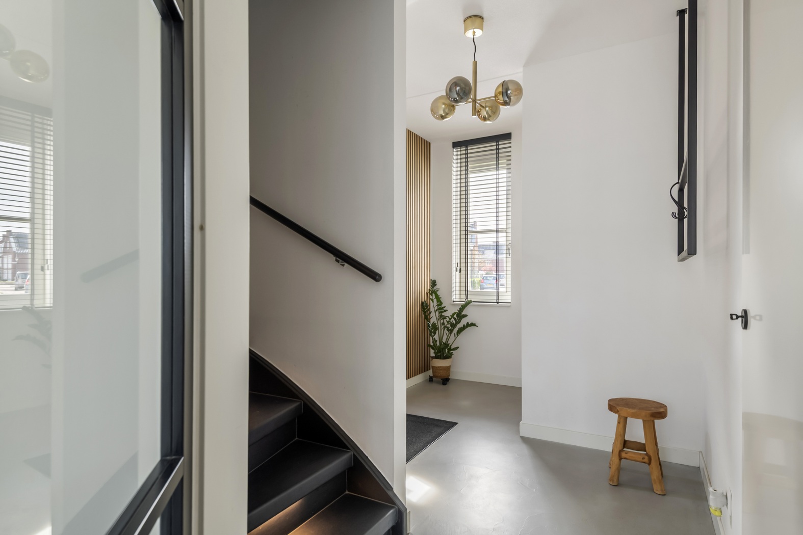 Via de zijentree stap je binnen in een verzorgde hal met toegang tot de toiletruimte, meterkast en de trap naar de eerste verdieping. De stijlvolle zwarte taatsdeur geeft alvast een voorproefje van wat je mag verwachten en leidt je naar de woonkamer.