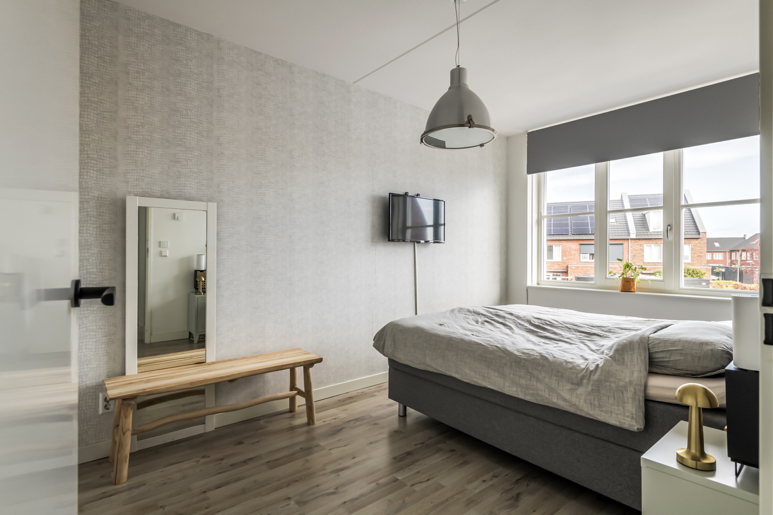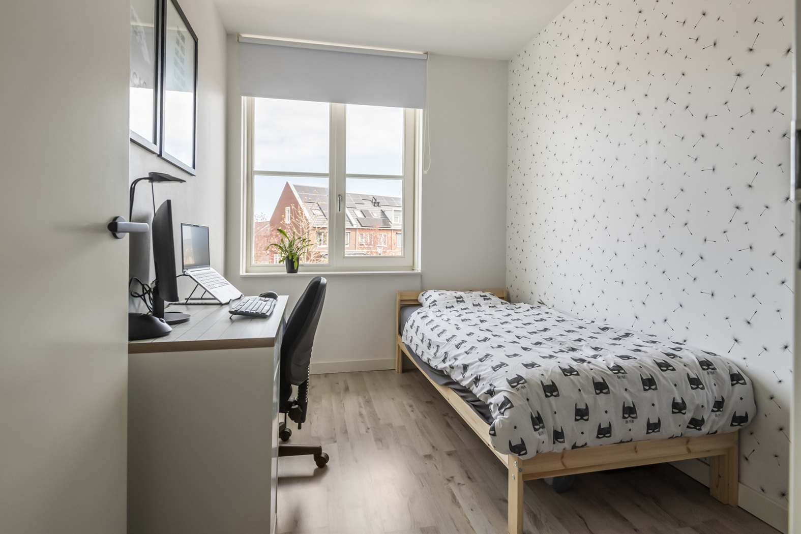 De overloop met zijraam zorgt voor een prettige lichtinval en geeft toegang tot drie goed bemeten slaapkamers: één aan de voorzijde en twee aan de achterzijde. Ideaal voor een gezin, werken aan huis of het creëren van een inloopkast of hobbyruimte. De gehele verdieping is afgewerkt met een nette laminaatvloer en voorzien van comfortabele vloerverwarming én -koeling.