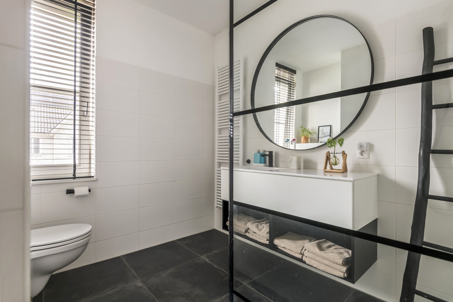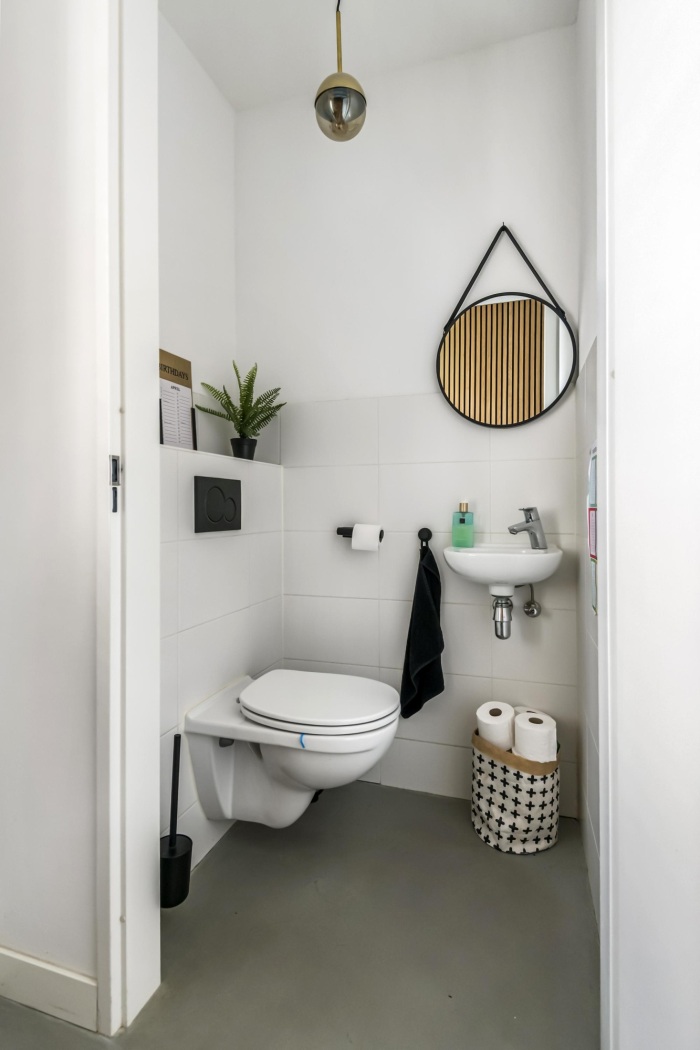 De moderne badkamer is strak en stijlvol uitgevoerd en van alle gemakken voorzien. Je vindt hier een ruime inloopdouche met zowel een regendouche als handdouche, een fraai wastafelmeubel met ronde spiegel en een zwevend toilet. Vloerverwarming en een extra elektrische design radiator zorgen voor een aangename en luxe sfeer, een plek om de dag ontspannen te beginnen of af te sluiten.