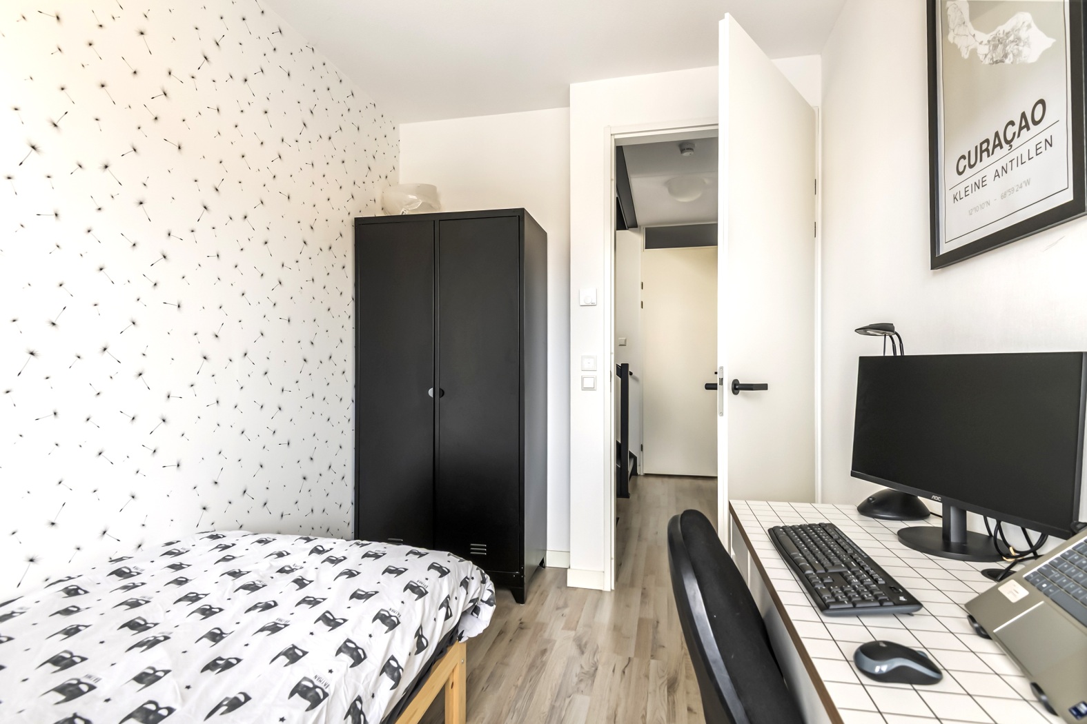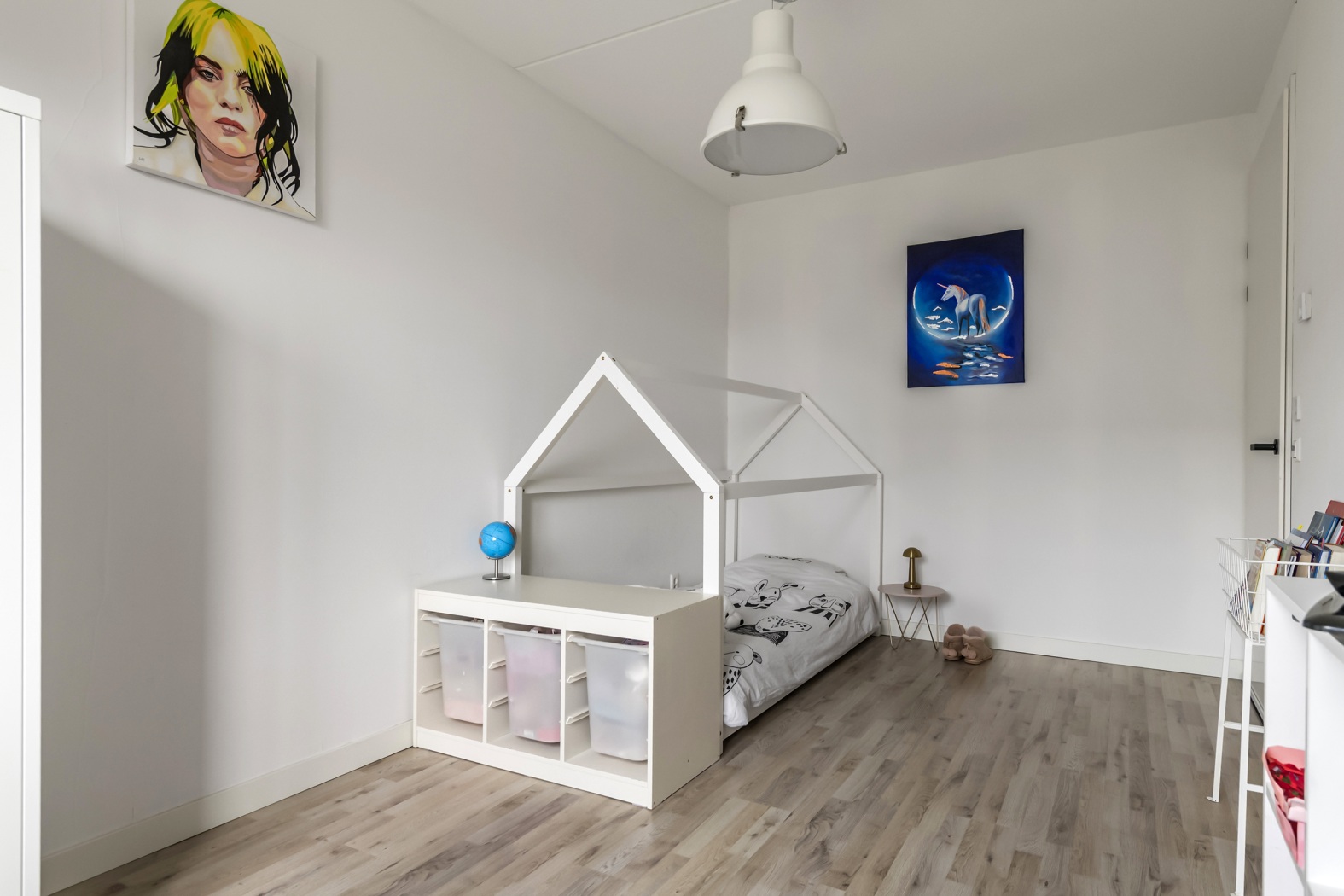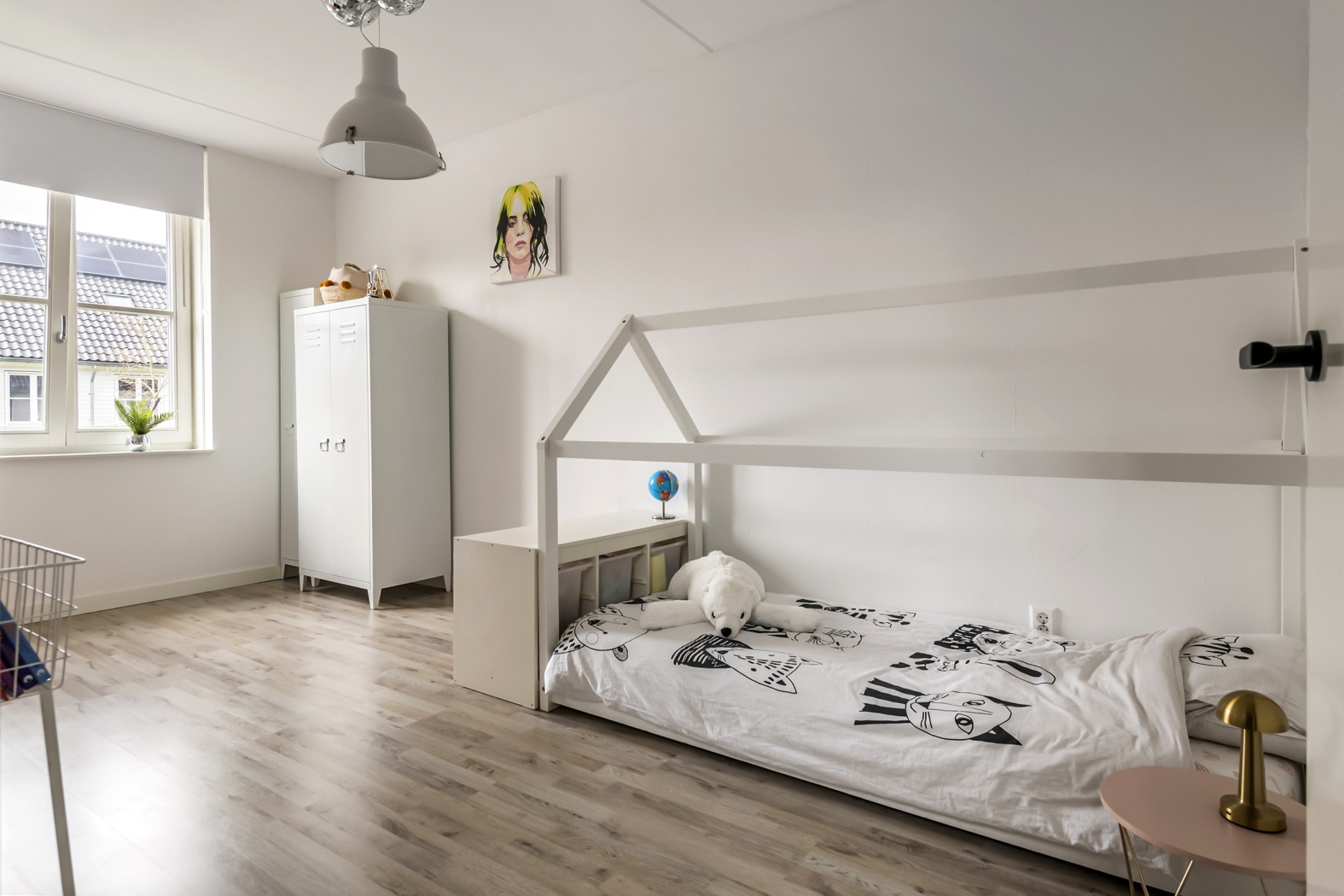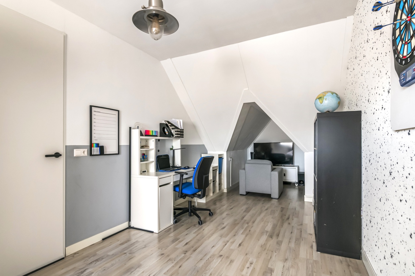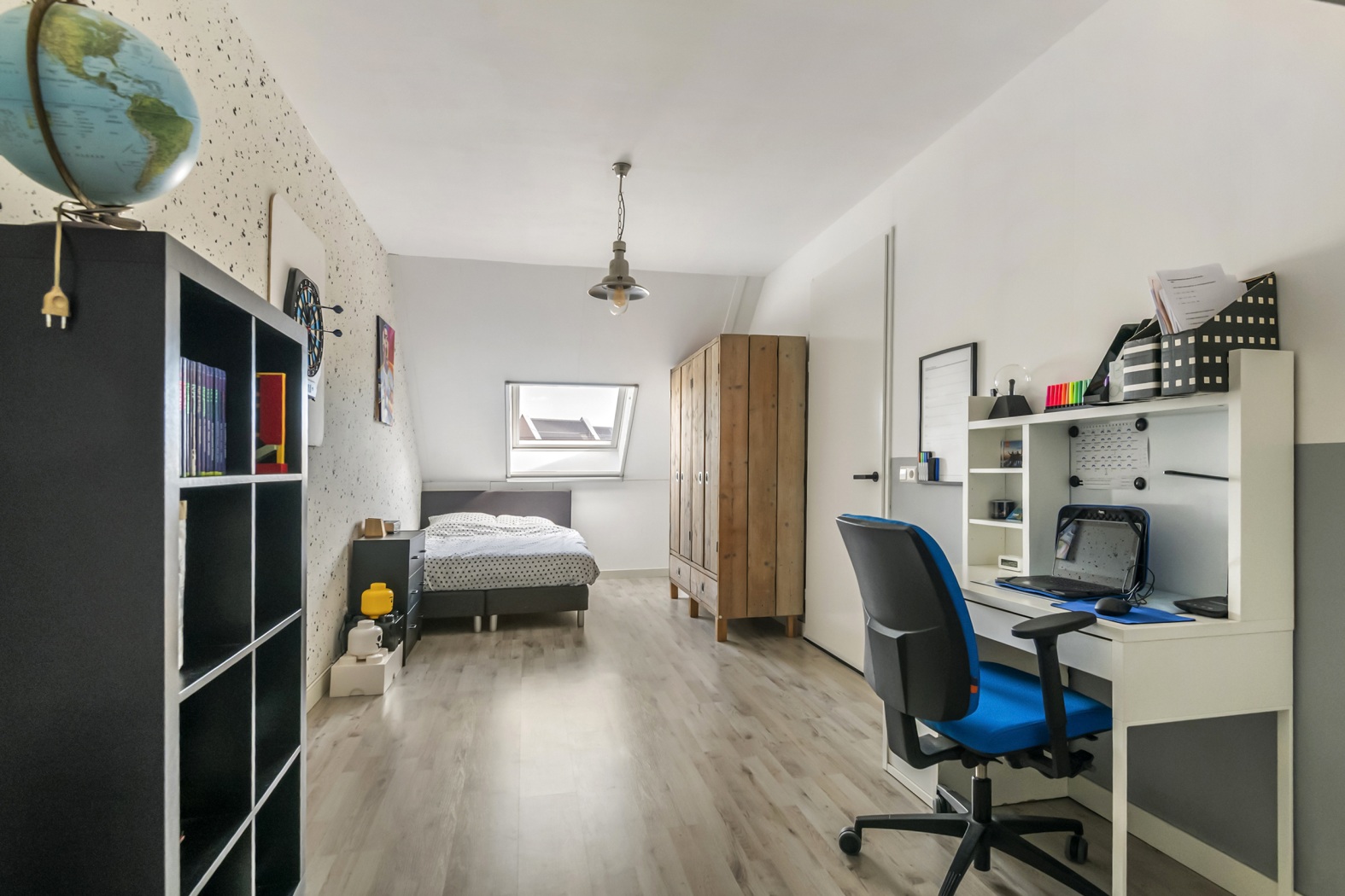 Vanuit hier stap je binnen in een verrassend ruime en speelse vierde kamer. Dankzij het dakraam valt het daglicht mooi naar binnen en de charmante nis, ontstaan door de kapconstructie, geeft de ruimte nét dat beetje extra karakter. Perfect als slaapkamer, werkplek of creatieve ruimte. Ook hier zorgt de laminaatvloer in combinatie met vloerverwarming en -koeling voor een comfortabel en aangenaam verblijf, het hele jaar door. Boven de slaapkamer is bovendien een praktische vliering gerealiseerd, perfect voor extra bergruimte.