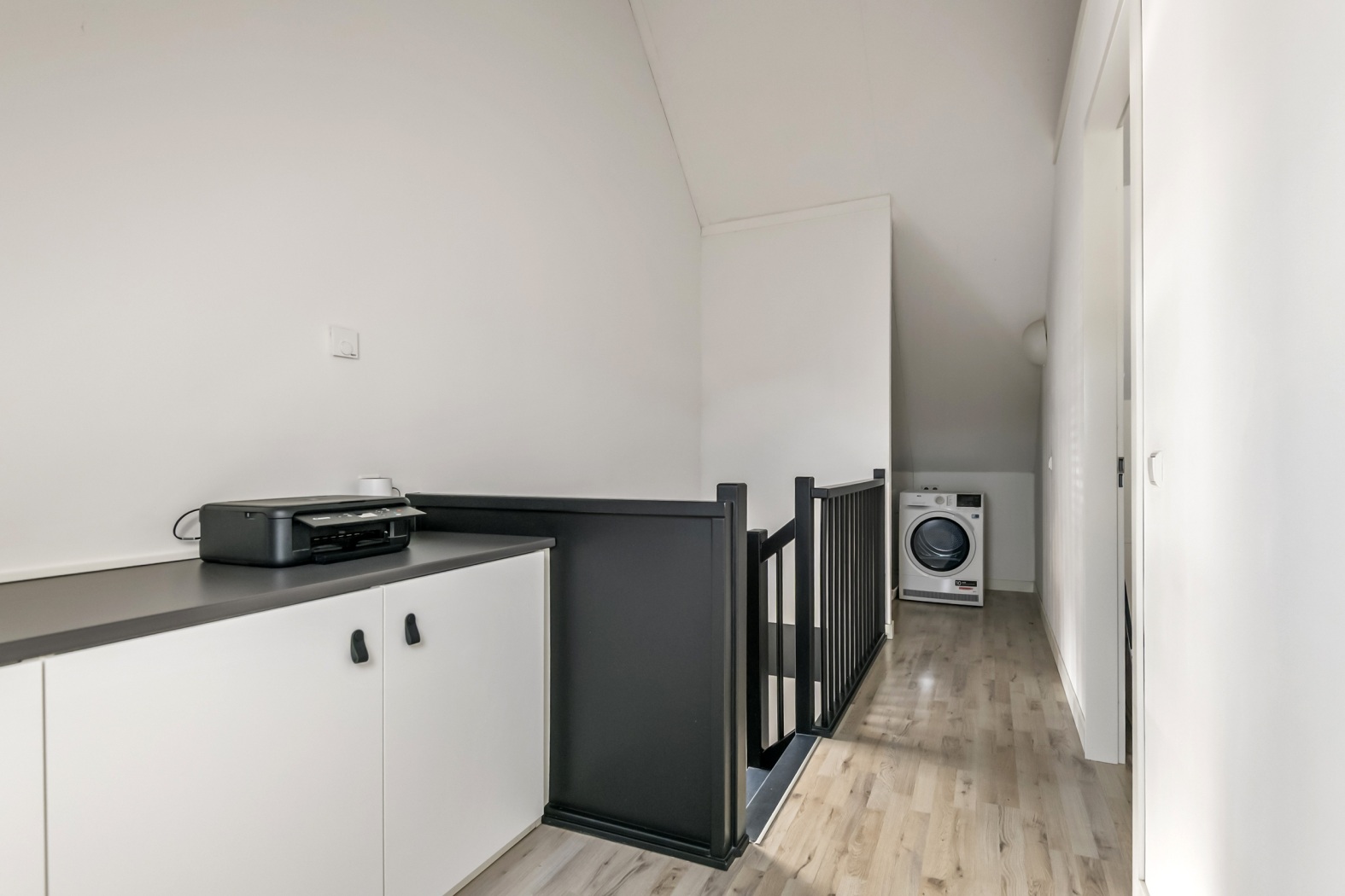 De lichte overloop met dakraam is praktisch ingericht en biedt ruimte voor de wasmachine en droger. Daarnaast bevinden zich hier de omvormer, de verdeler voor de vloerverwarming en -koeling en de mechanische ventilatie.