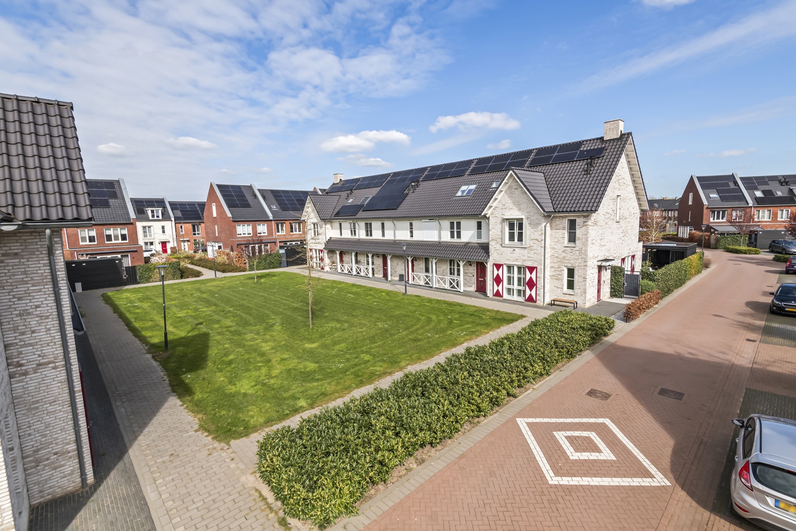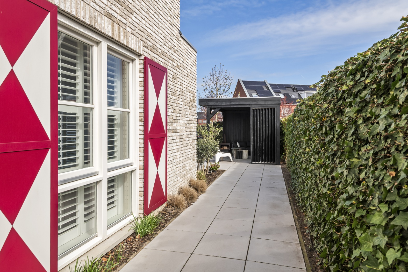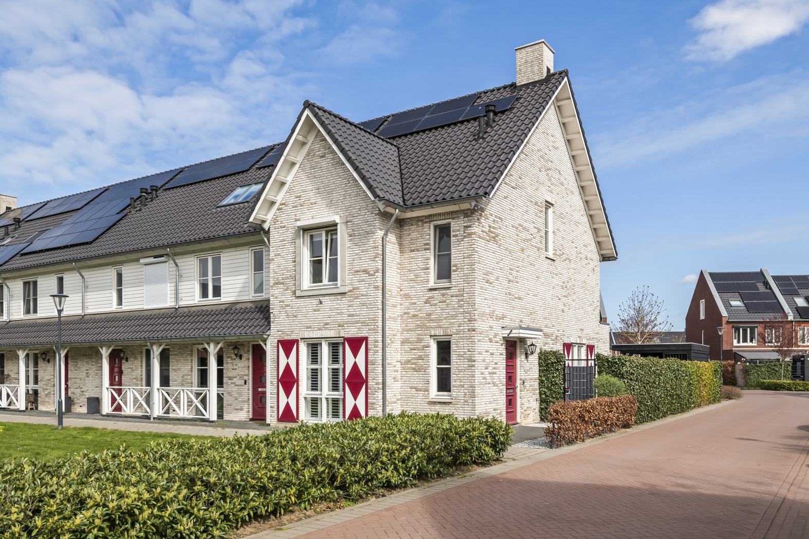 Wat een plaatje: uitgebouwde hoekwoning met verspringende gevel, rood-witte luiken en uitzicht op het groen.