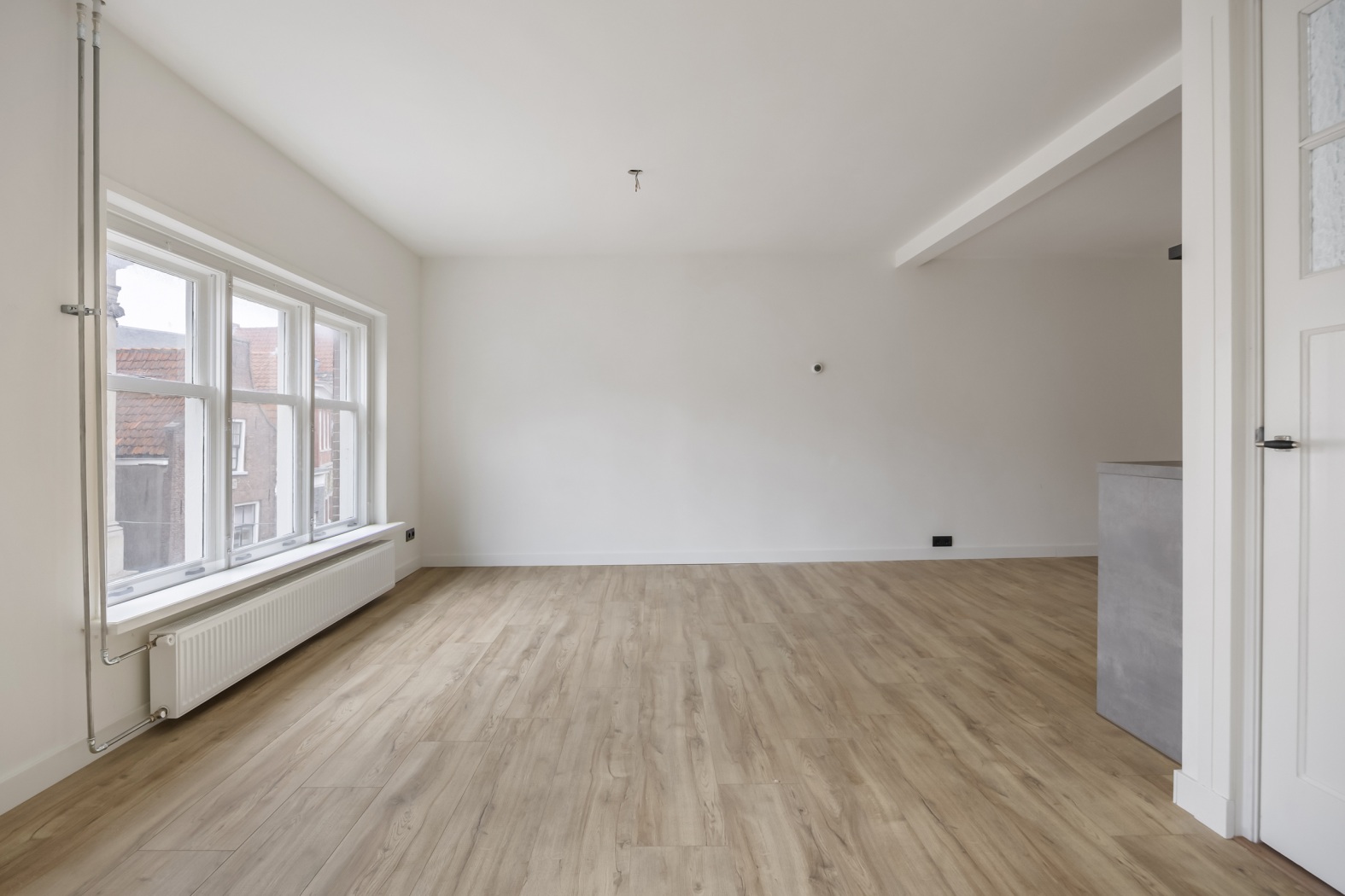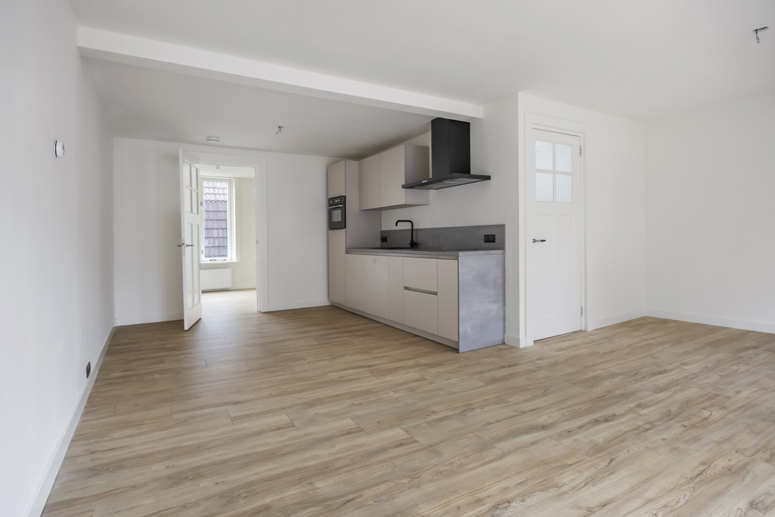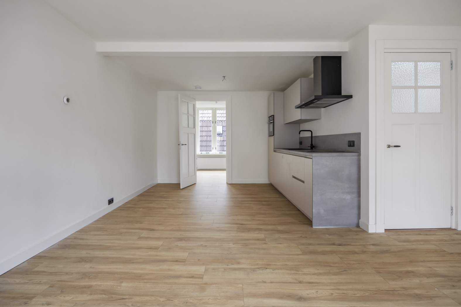 De lichte woonkamer heeft een gezellige indeling met ruimte voor een eethoek en zithoek. Dankzij de grote ramen valt er veel daglicht naar binnen en geniet je van het charmante uitzicht over de karakteristieke straat. De open keuken sluit mooi aan bij de woonkamer en is uitgevoerd in natuurlijke tinten, wat zorgt voor een rustige, moderne uitstraling.