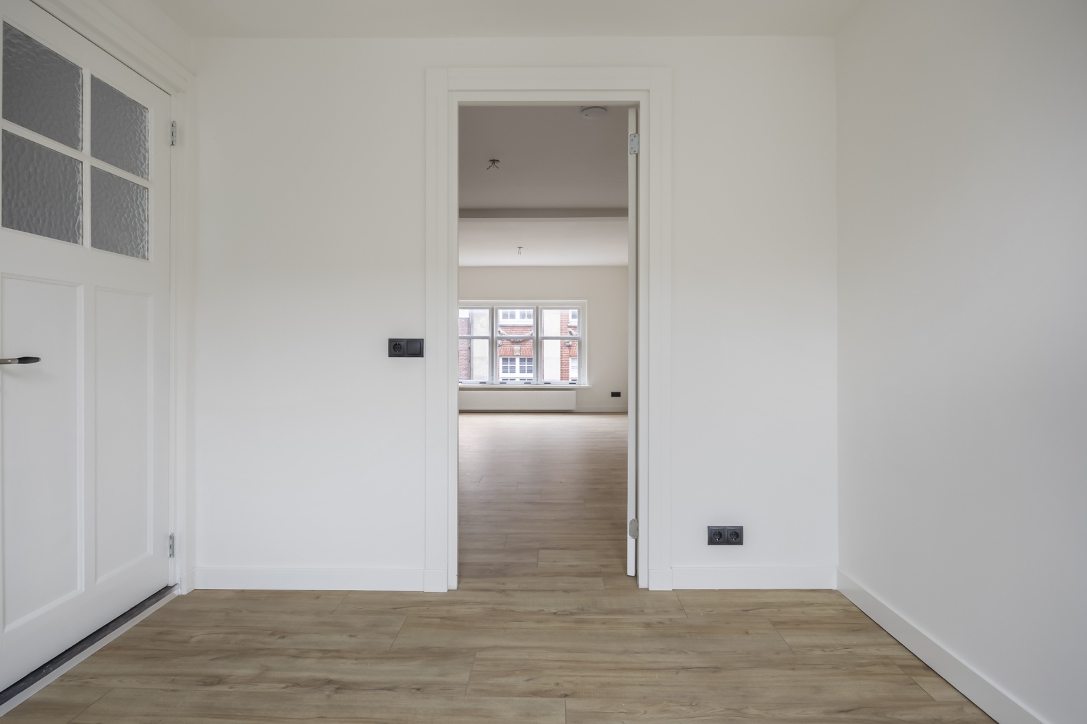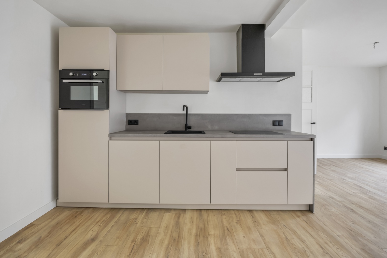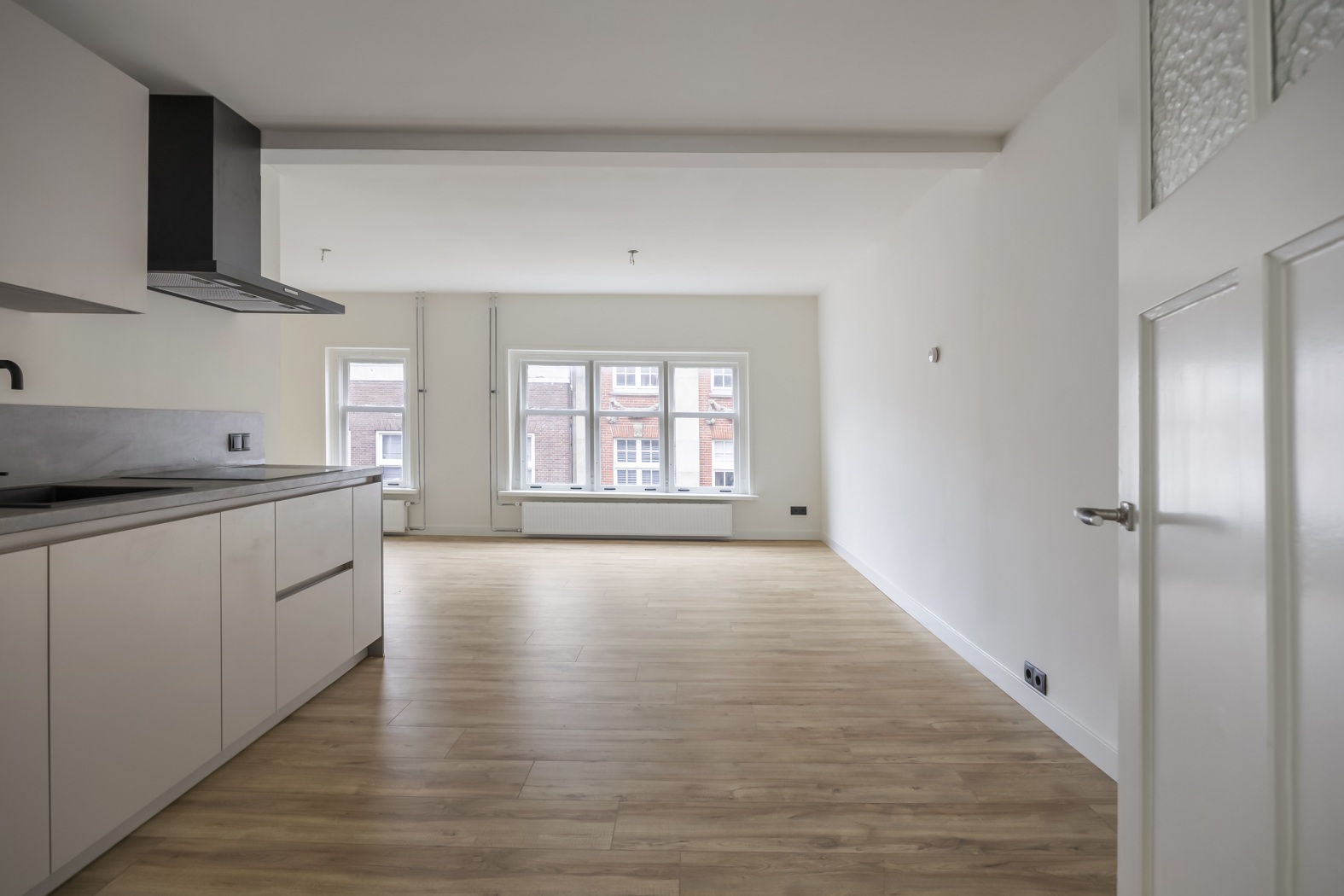 De lichte woonkamer heeft een gezellige indeling met ruimte voor een eethoek en zithoek. Dankzij de grote ramen valt er veel daglicht naar binnen en geniet je van het charmante uitzicht over de karakteristieke straat. De open keuken sluit mooi aan bij de woonkamer en is uitgevoerd in natuurlijke tinten, wat zorgt voor een rustige, moderne uitstraling.