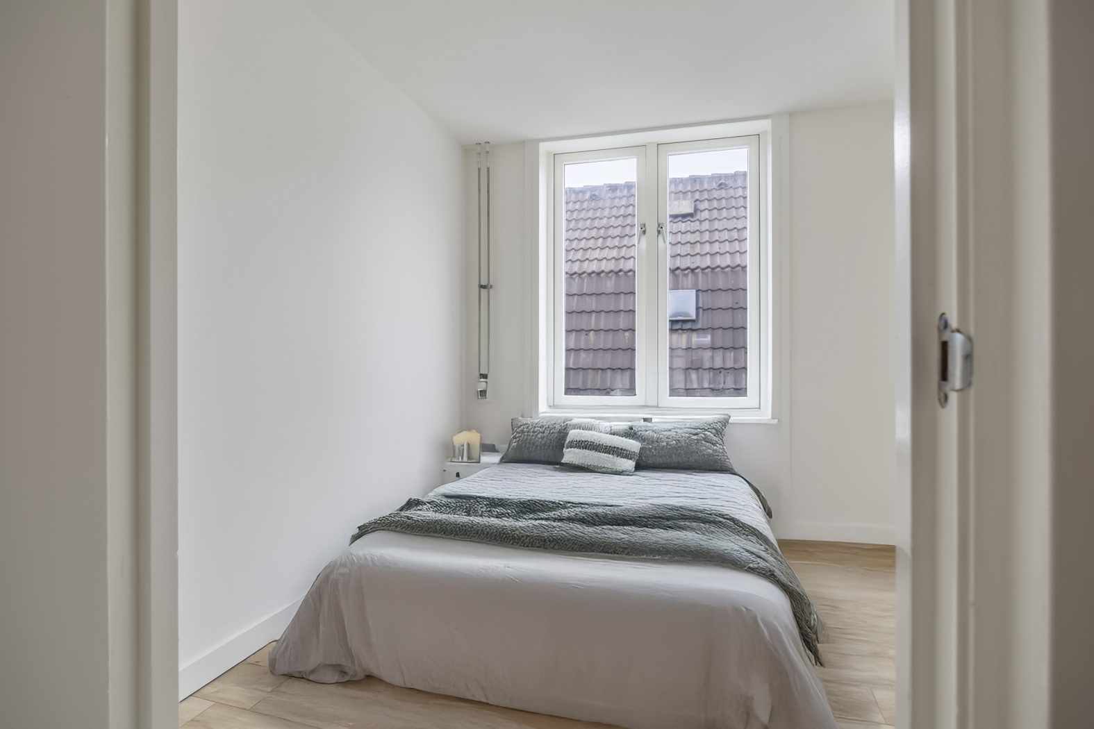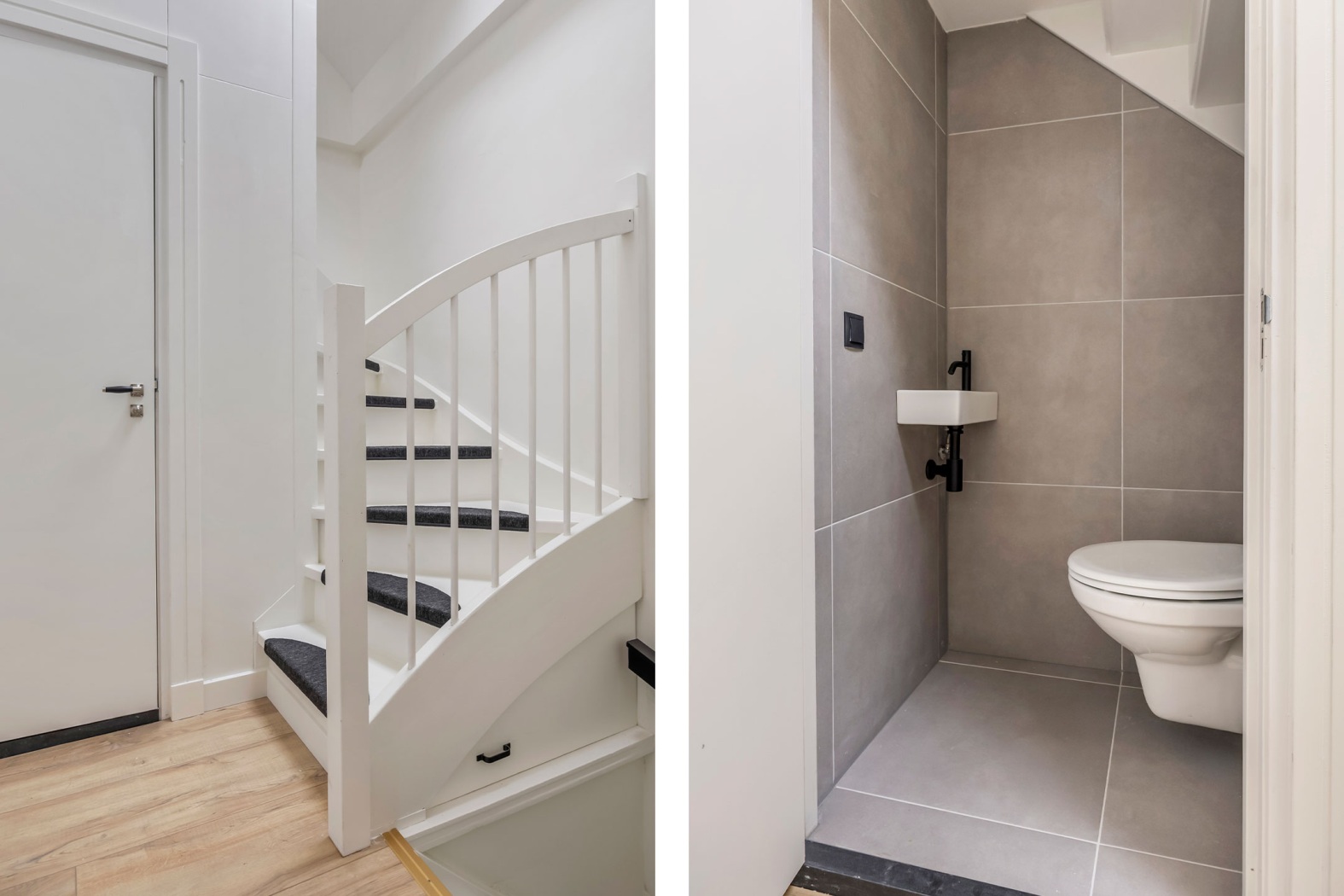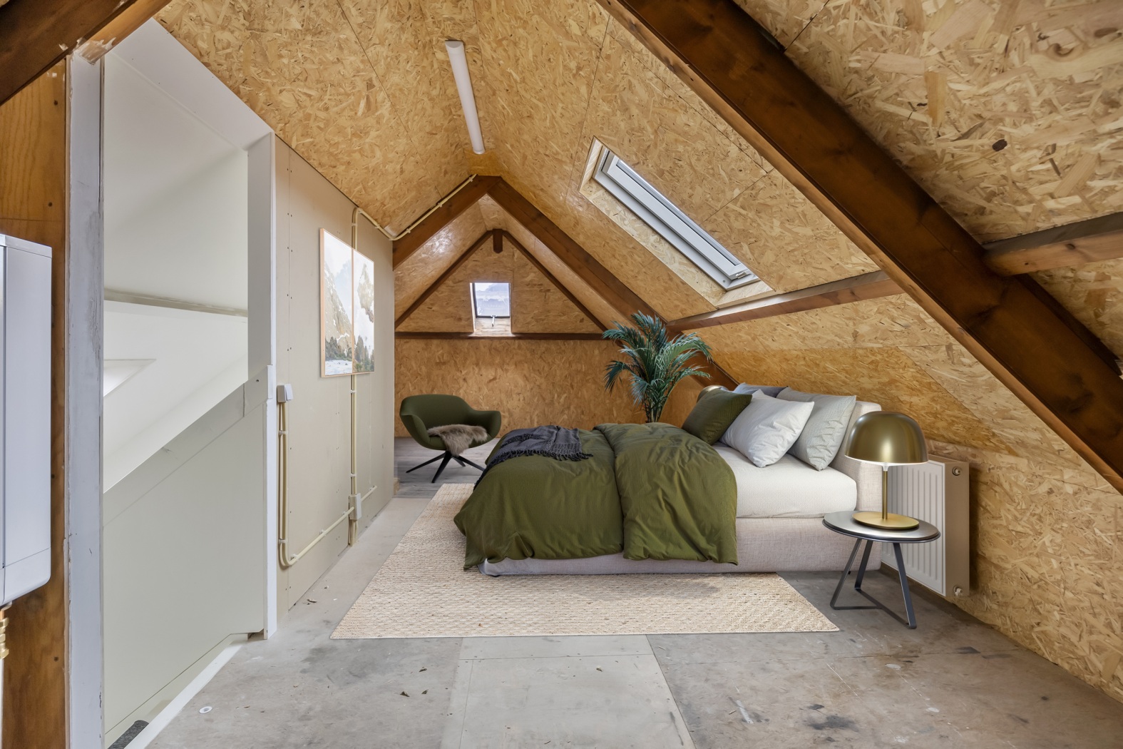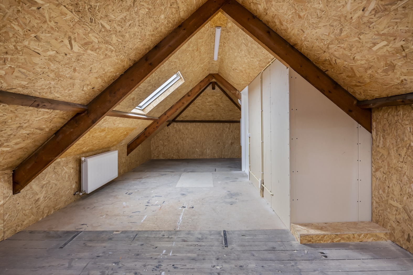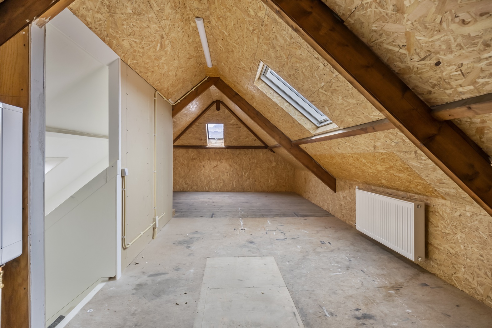 Via de hal bereik je het separate toilet. Via de slaapkamer komt je in de badkamer, die voorzien is van een inloopdouche, wastafel en wasmachineaansluiting. Op de eerste verdieping bevindt zich de hoofdslaapkamer, terwijl de zolderverdieping mogelijk te gebruiken is als tweede slaapkamer. Deze ruimte met twee dakramen voelt licht en ruim aan — perfect als slaapkamer, logeerkamer of werkplek.