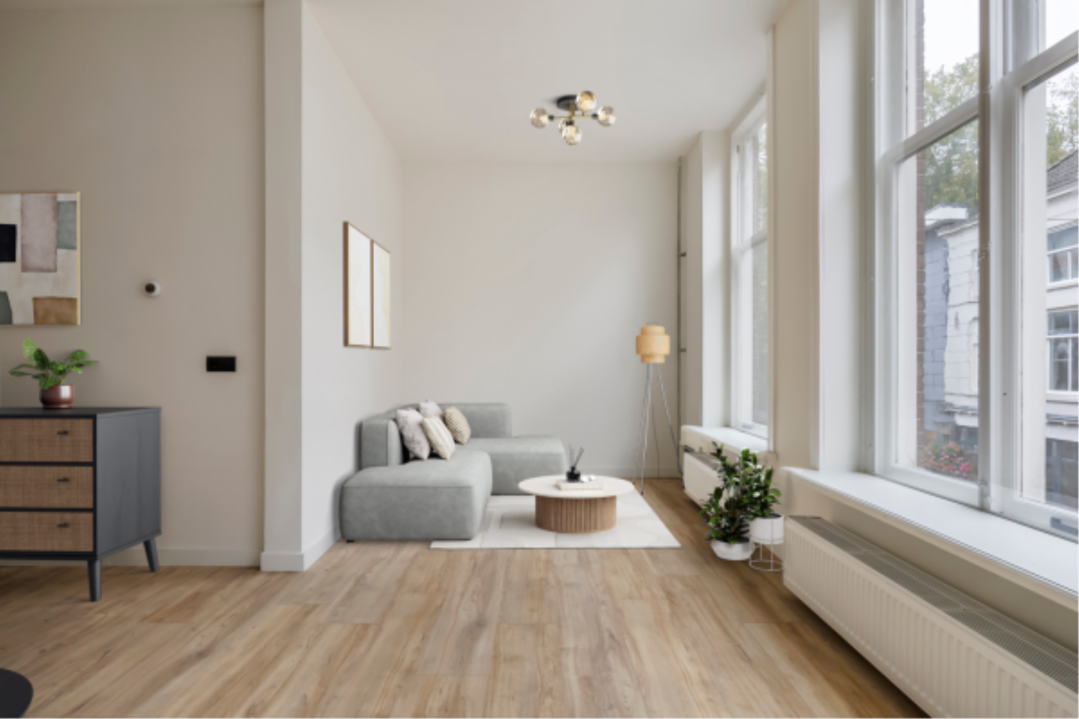 Zodra je binnenkomt, valt direct de lichte en moderne woonkamer op. De grote, karakteristieke ramen geven het appartement niet alleen een authentieke uitstraling, maar zorgen ook voor veel natuurlijke lichtinval. De ramen kunnen omhoog worden geschoven — een mooi detail dat bijdraagt aan de unieke sfeer van het pand.