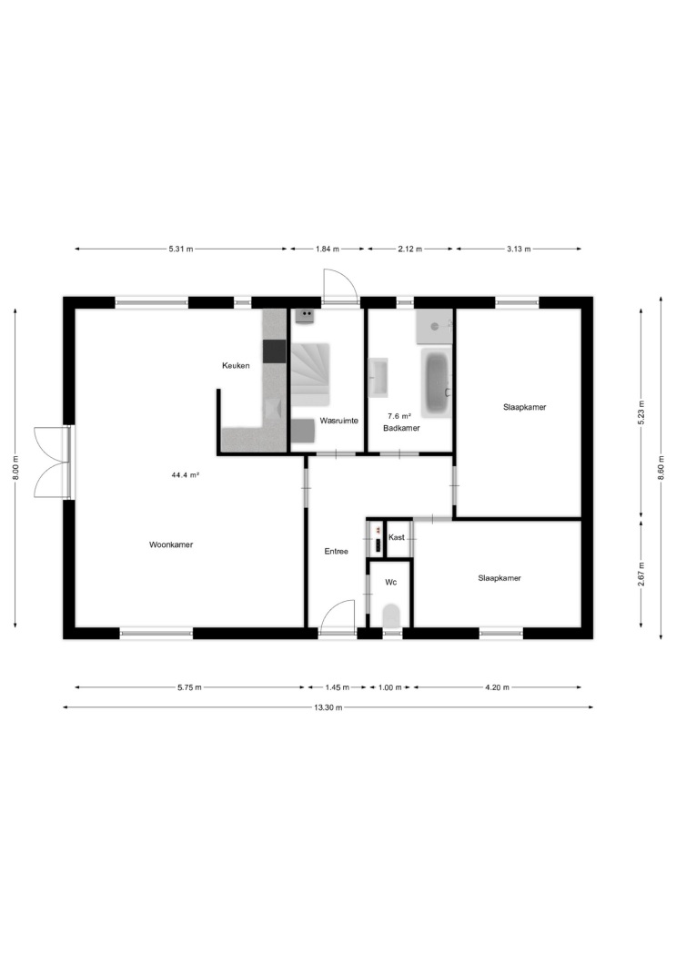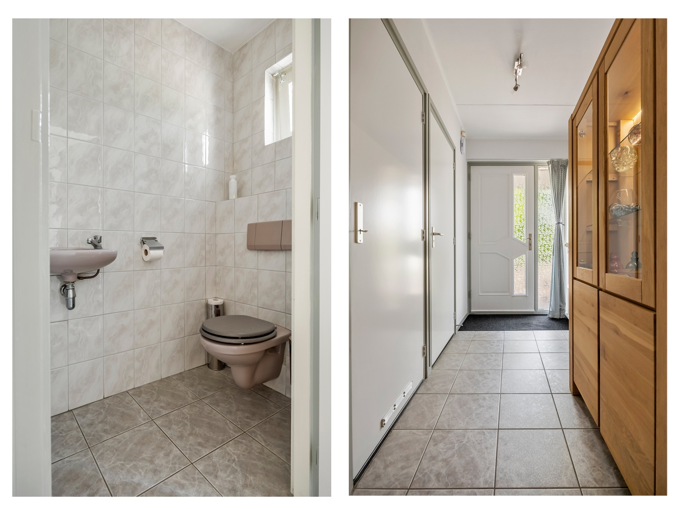 De entree met overdekte deurluifel vormt een uitnodigende binnenkomst. Vanuit de hal zijn alle vertrekken bereikbaar. Hier bevinden zich ook de meterkast en het toilet, praktisch en direct toegankelijk.
