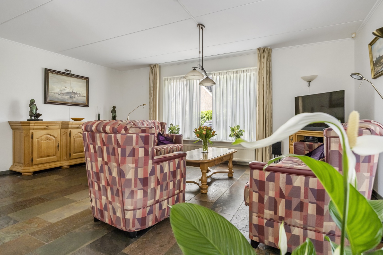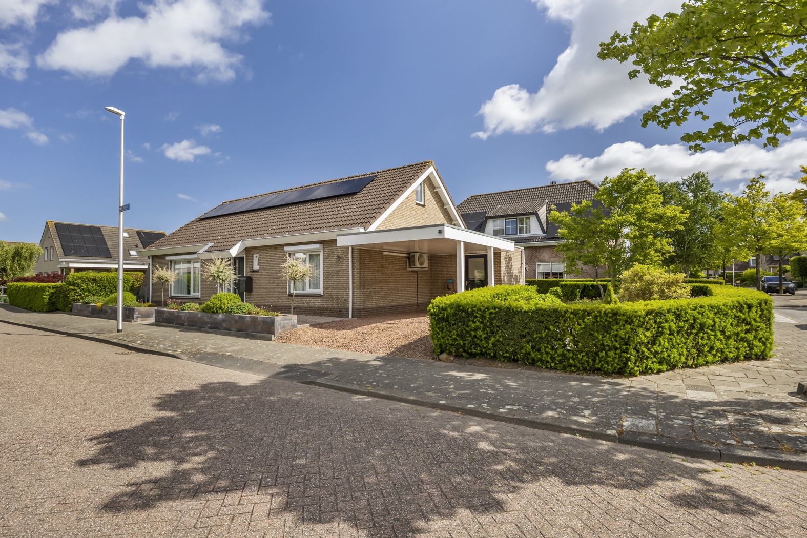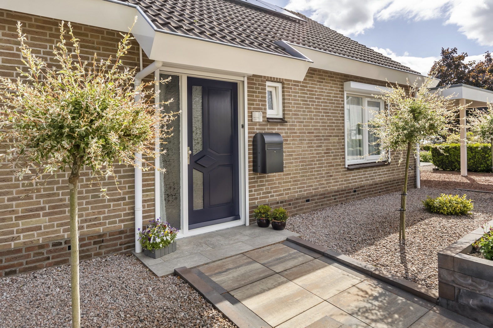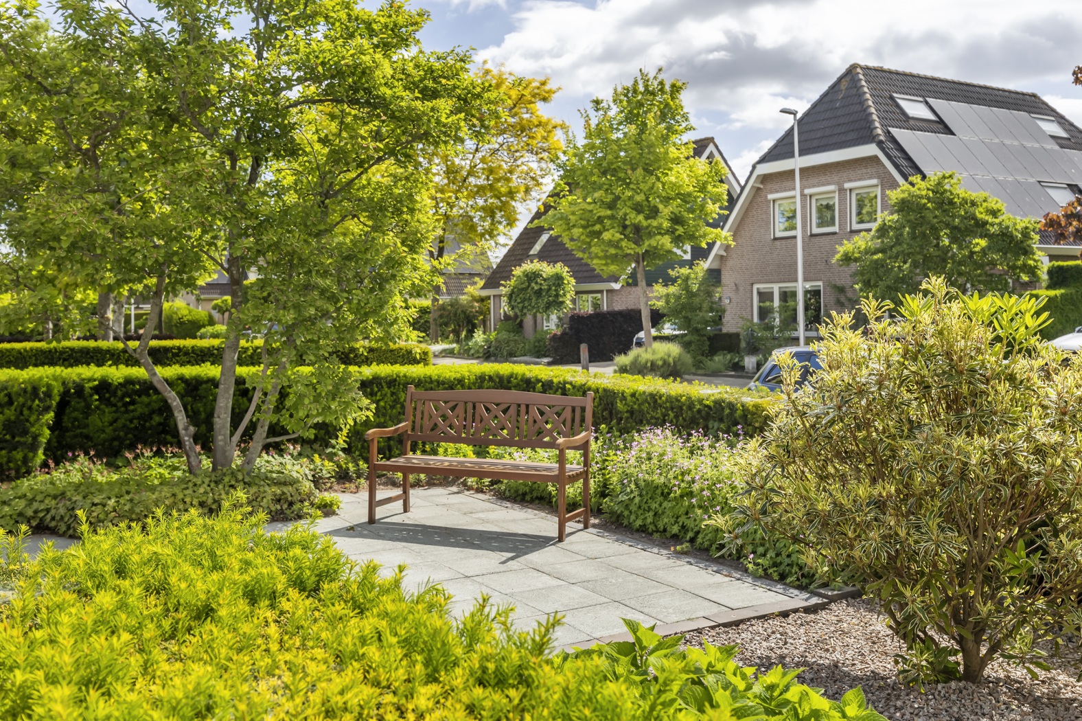 Rondom de woning ligt een fraai aangelegde tuin op een royaal perceel van circa 465 m². Aan de voorzijde springt de verzorgde uitstraling in het oog, met verhoogde plantenbakken, een strak looppad naar de voordeur en een brede oprit met rood split die leidt naar de carport met aangrenzende stenen berging van ongeveer 8 m².