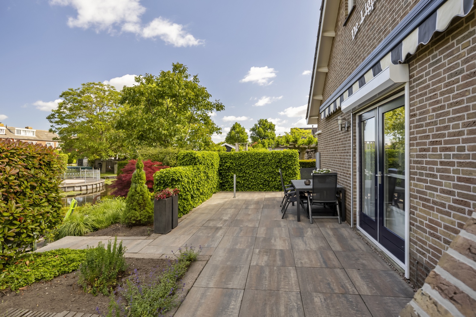 De echte charme openbaart zich echter aan de achterzijde, waar de tuin uitloopt in het waterlandschap van de Wetering. Via de dubbele tuindeuren uit de woonkamer bereikt u een sfeervol terras, gesitueerd op het noordwesten en heerlijk beschut door groene hagen die optimale privacy bieden. Enkele treden lager bevindt zich een tweede, fraai bestraat terras direct aan de waterkant, omringd door smaakvol ingerichte plantenbakken.