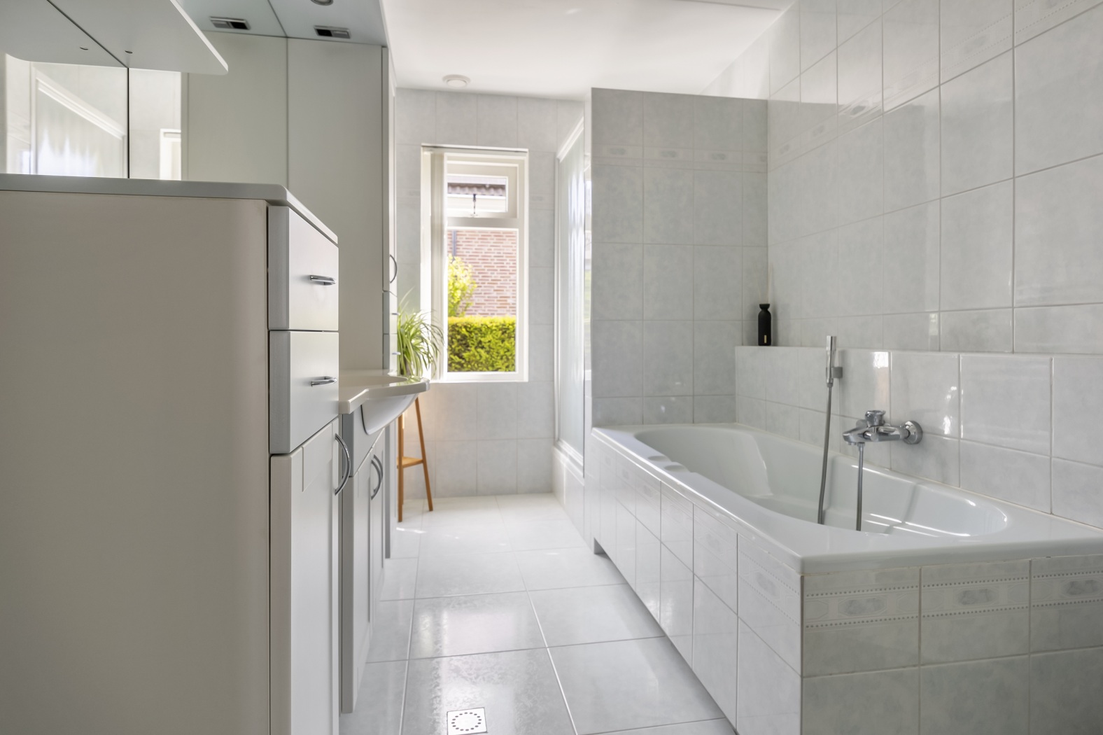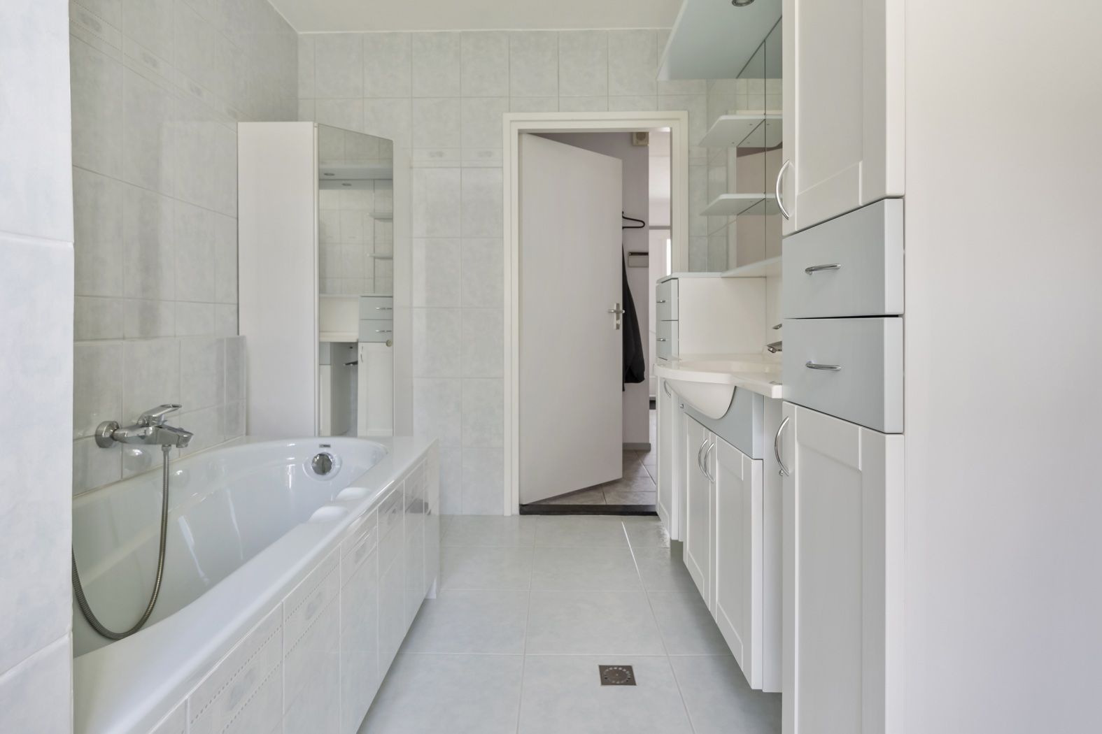 De badkamer is volledig betegeld in een neutrale kleurstelling en praktisch ingedeeld. U beschikt hier over een ligbad voor ontspannende momenten, een aparte douche met glazen deur en een royaal wastafelmeubel met veel opbergruimte. Het separate toilet bevindt zich in de hal, wat extra comfort en privacy biedt voor bewoners en gasten.