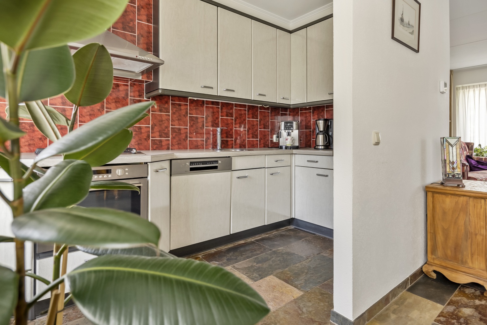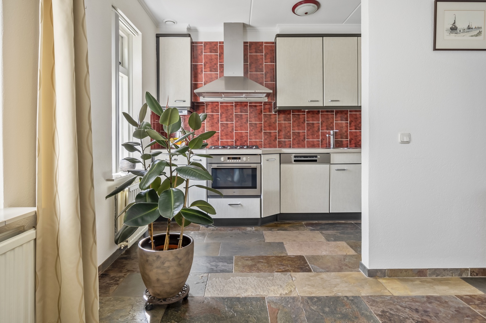 De halfopen keuken vormt een mooi geheel met de woonkamer en is ingericht in een praktische hoekopstelling. De keuken beschikt over diverse inbouwapparatuur, waaronder een gaskookplaat, afzuigkap, koelkast, combi-oven/magnetron en een vaatwasser. Een fijne plek om te koken en tegelijkertijd in contact te blijven met de leefruimte.