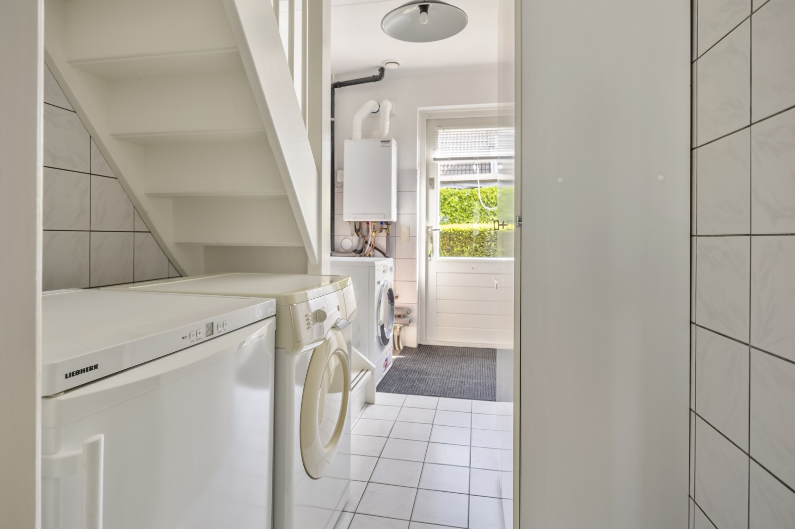 De praktische bijkeuken vormt een ideale schakel tussen binnen en buiten. Via de achterdeur loopt u direct de tuin in, wat handig is voor het dagelijks gebruik. De ruimte is voorzien van aansluitingen voor wasmachine en droger, met daarnaast plaats voor bijvoorbeeld een extra vriezer of extra opslag. De cv-installatie is eveneens in deze ruimte geplaatst. Een vaste trap leidt hiervandaan naar de verdieping, wat de praktische indeling en het wooncomfort versterkt.
