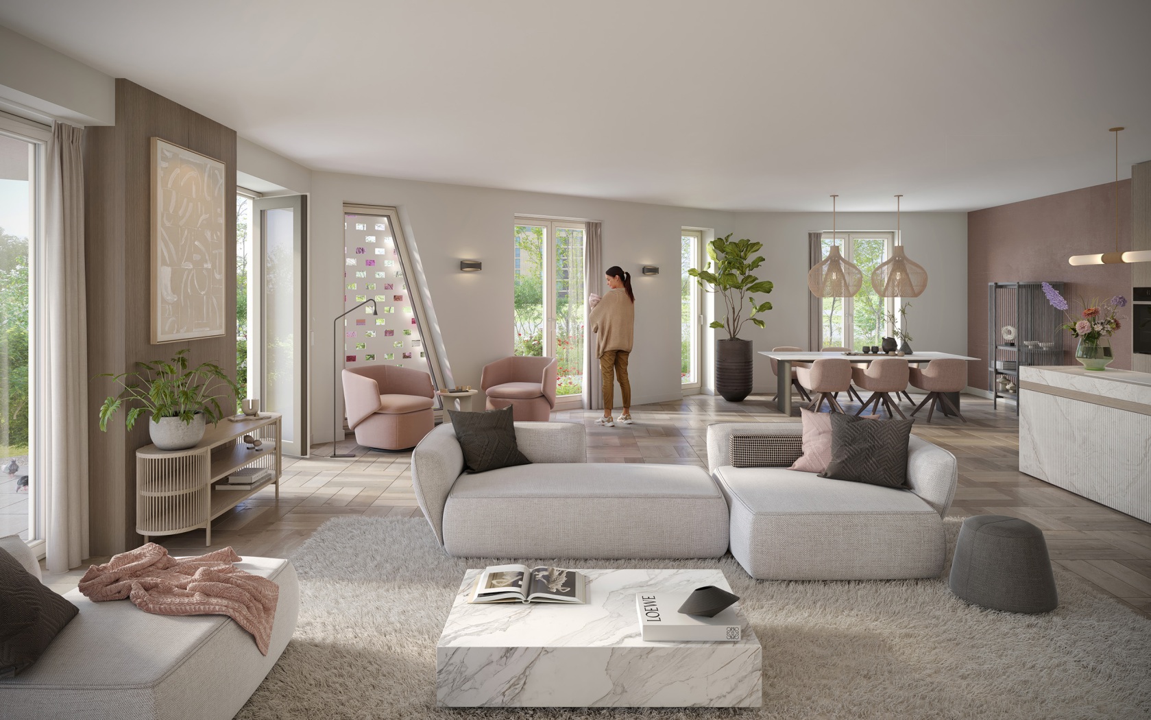 Vloerverwarming en -koeling zorgen voor een gelijkmatige temperatuurverdeling in de ruimtes, wat het comfort verhoogt. Bovendien passen de gebouwen perfect in een parkachtige omgeving, met half verdiept parkeren en een prachtig groen ingerichte tuin,