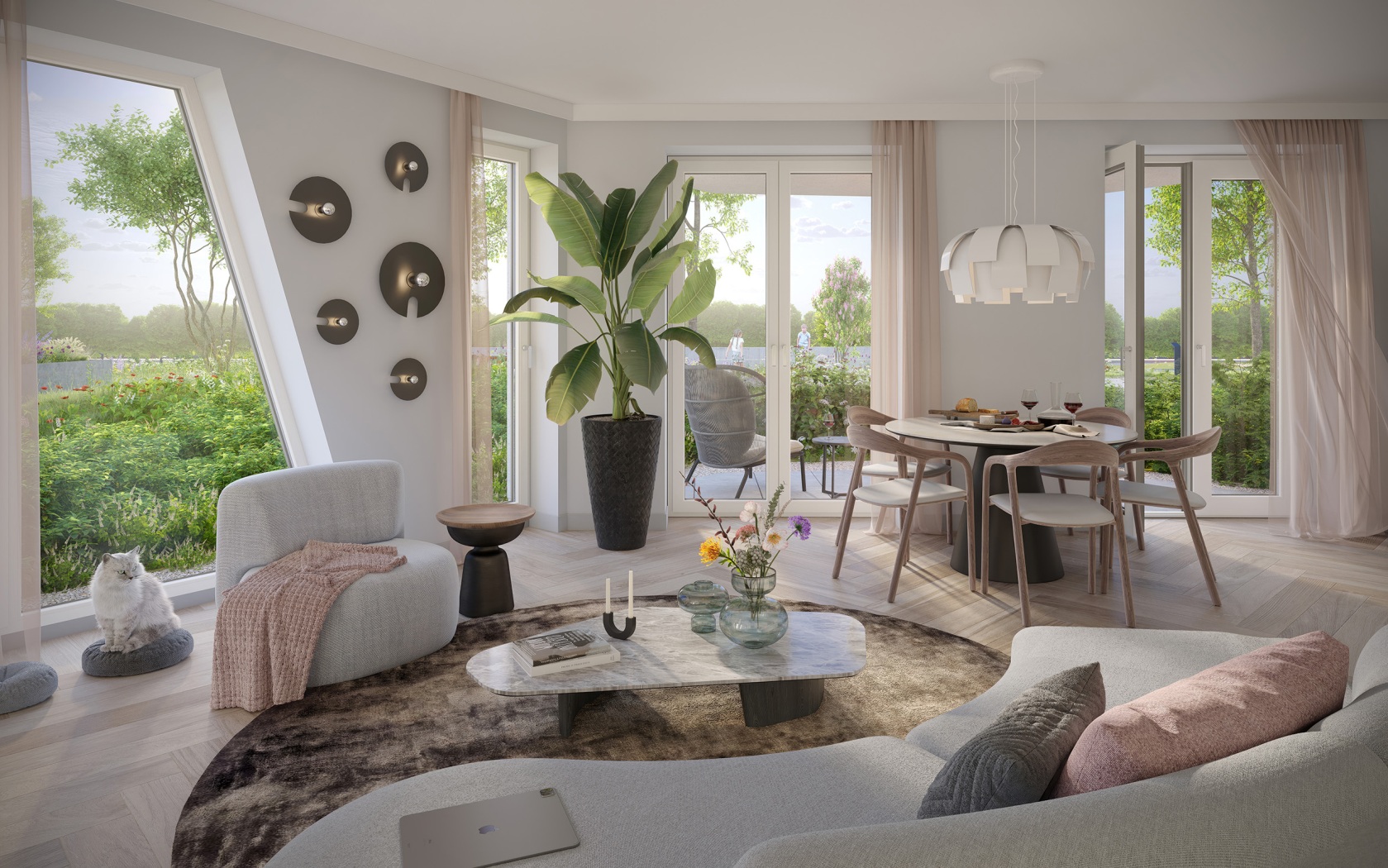 Vloerverwarming en -koeling zorgen voor een gelijkmatige temperatuurverdeling in de ruimtes, wat het comfort verhoogt. Bovendien passen de gebouwen perfect in een parkachtige omgeving, met half verdiept parkeren en een prachtig groen ingerichte tuin,