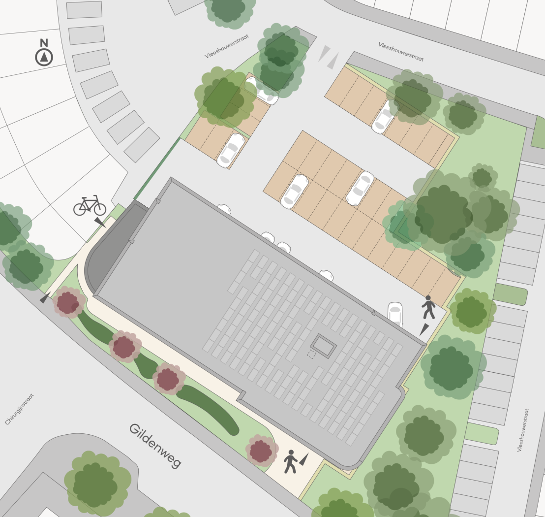 * Privé parkeerterrein met 46 parkeerplaatsen, toegankelijk via de Vleeshouwerstraat