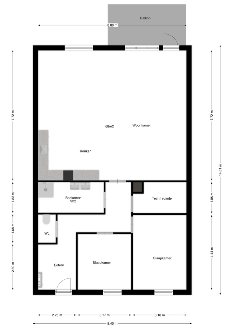 - Zeer ruime woonkamer met open keuken grenzend aan terras of balkon