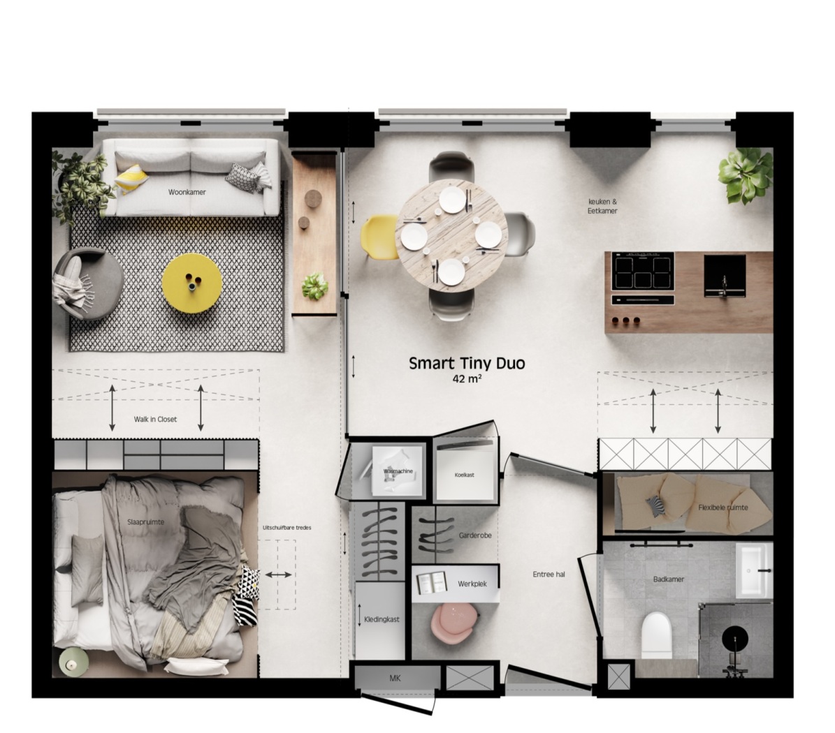 Dankzij het Smart Inbouwpakket, bieden de Smart Tiny Single (circa 27 m² gbo) en de Smart Tiny Duo (circa 50 m² gbo) een premium wooncomfort. Met een A+++ label belooft dit unieke project groots wonen op kleine (duurzame) voet.