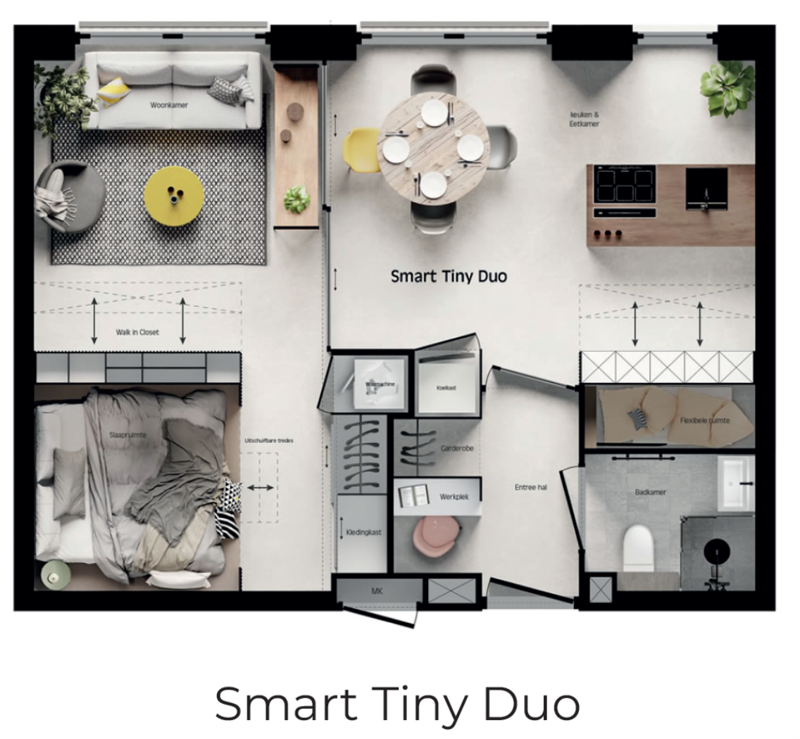 Dankzij het Smart Inbouwpakket, bieden de Smart Tiny Single (circa 27 m² gbo) en de Smart Tiny Duo (circa 50 m² gbo) een premium wooncomfort. Met een A+++ label belooft dit unieke project groots wonen op kleine (duurzame) voet.