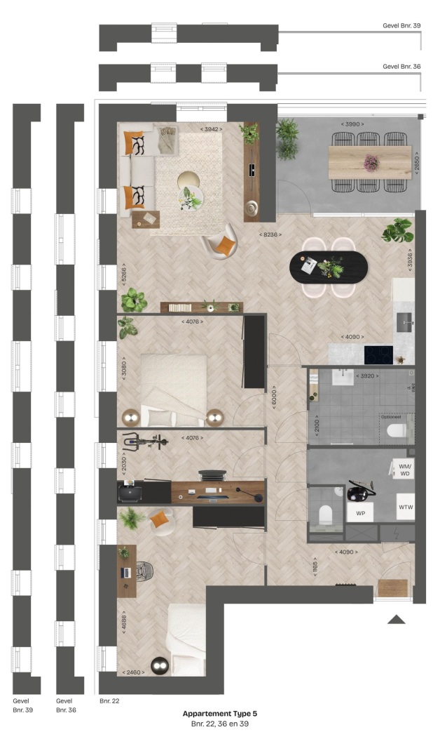 Een royaal appartement met een lichte living en ramen aan meerdere zijden, wat zorgt voor een prettige en natuurlijke lichtinval. De open keuken sluit direct aan en staat in verbinding met het zonnige balkon. Met standaard drie slaapkamers is dit type ideaal voor wie extra ruimte zoekt, bijvoorbeeld voor thuiswerken of hobby’s.
