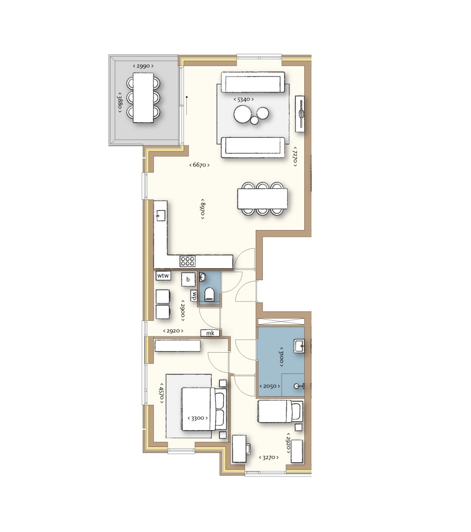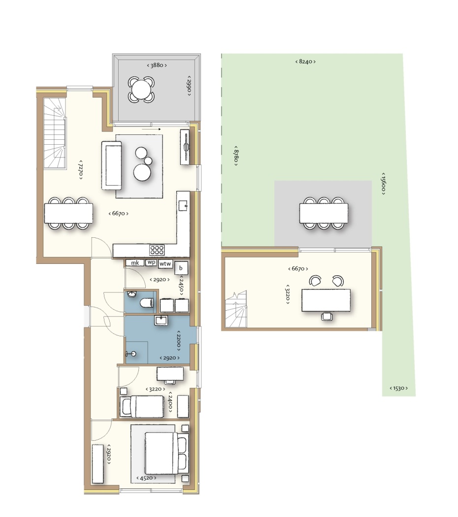 Op dijkniveau bevindt zich de gemeenschappelijke entree, de lift en het trappenhuis. De appartementen zijn ruim opgezet met 2 slaapkamers aan de voorzijde, een open woonkeuken, een balkon op het zuiden van circa 12 m2 en een weids uitzicht over de uiterwaarden. Via een oprit zijn de achter het perceel gelegen parkeerplaatsen van de appartementen bereikbaar. Ieder appartement beschikt over twee eigen parkeerplaatsen. De duurzame woningen zijn gasvrij, voorzien van warmtepompen, vloerverwarming, een eigen balkon.